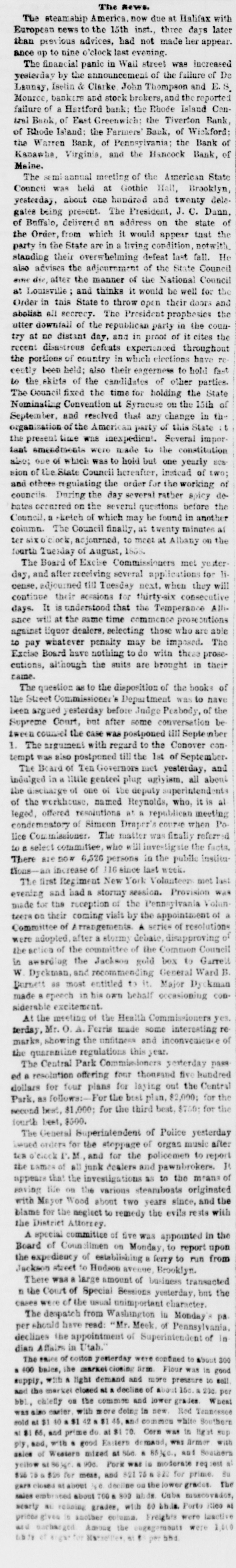 The steamship America. now due at Halifax with European news to the 15th inst., three days later than previous advices, had not made her appear. ance up to nine o'clock last evening. The financial panic in Wall street was increased yesterday by the announcement of the failure of De Launay, Iselin & Clarke John Thompson and E. S. Monroe, bankers and stock brokers, and the reported failure of a Hartford bank; the Rhode Island Central Bank of East Greenwich: the Tiverton Bank, of Rhode Island: the Farmers' Bank, of Wickford: the Warren Bank, of Pennsylvania; the Bank of Kanawha, Virginia, and the Hancock Bank, of Maine. The semi annual meeting of the American State Council was held at Gothic Hall, Brooklyn, yesterday, about one hundred and twenty delegates being present. The President, J. C. Dann. of Buffalo, delivered an address on the state of the Order, from which it would appear tnst the party in the State are in a living condition, notwith standing their overwhelming defeat last fall. He also advises the adjournment of the State Council sine die, after the manner of the National Council at Louisville ; and thinks it would be well for the Order in this State to throw open their doors and abolish all secrecy. The President prophesies the atter downfall of the republican party in the country at no distant day, and in proof of it cites the recent disastrous defeats experienced throughout the portions of country in which elections have recently been held; also their eagerness to hold fast to the ekirts of the candidates of other parties. The Council fixed the time for holding the State Nominating Convention at Syracuse on the 15th of September, and resolved that any change in the organization of the American party of this State it the present time was inexpedient. Several important amendments were made to the constitution also; one of which was to hold but one yearly ses sion of State Council hereafter, instead of two; and others regulating the order for the working of councils During the day several rather spicy debates occurred on the several questions before the Council, a sketch of which may be found in another column. The Council finally, at twenty minutes at ter SIXO clock, acjourned, to meet at Albany on the fourth Tuesday of August, 1858. The Board of Excise Commissioners met yesterday, and after receiving several applications for 11. cense. adjourned till Tuesday next. when they will continue their sessions for thirty-six consecutive days. It is understood that the Temperance Alliance will at the same time commence prosecutions against Liquor dealers, selecting those who are able to pay whatever penalty may be imposed. The Excise Board have nothing to do with these prosecutions, although the suits are brought in their name. The question as to the disposition of the books of the Street Commissioner's Department was to have been argued yesterday before Judge Peabody, of the Supreme Court, but after some conversation be tween counsel the case was postponed un September 1. The argument with regard to the Conover contempt was also postponed till the 1st of September. The Board of Ten Governors met yesterday, and indulged in a little genteel plug aglyism, all about the discharge of one of the deputy superintendents of the workhouse, named Reynolds, who, it is al leged, offered resolutions at a republican meeting condempatory of Simeon Draper's course when Po lice Commissioner. The matter was finally referred to a select committee, who will investigate the facts. There are now 6,526 persons in the public institutions-an increase of 116 since last week. The first Regiment New York Volunteers met last evening and had a stormy session. Provision was made for the reception of the Pennsylvania Volun teers on their coming visit by the appointment of a Committee of A rrangements. A series of resolutions were adopted, after a stormy debate, disapproving of the action of the committee of the Common Council in awarding the Jackson gold box to Garrett W. Dyckman, and recommending General Ward B. Burnett as most entitled to it. Major Dyckman made B epeech in his own behalf occasioning considerable excitement. At the meeting of the Health Commissioners yes. terday, Mr. O. A. Ferris made some interesting remarks, showing the unfitness and inconvenience of the quarantine regulations this year. The Central Park Commissioners yesterday pass ed a resolution offering four thousand five hundred dollars for four plans for laying out the Central Park. as follows:- For the best plan, $2,000: for the second best, $1,000; for the third best, $750: for the fourth beet, $500. The General Superintendent of Police yesterday issued orders for the stoppage of organ music after ten Velock and for the policemen to report the names of all junk dealers and pawnbrokers. It appears that the investigations as to the means of saving life on the various steamboats originated with Mayor Wood about two years since, and the blame for the neglect to remedy the evils rests with the District Attorney. A special committee of five was appointed in the Board of Councilmen on Monday, to report upon the expediency of establishing a ferry to run from Jackson street to Hudson avenue, Brooklyn. There was a large amount of business transacted n the Court of Special Bessions yesterday, but the cases were of the usual unimportant character. The despatch from Washington in Monday pa per should have read: "Mr. Meek, of Pennsylvania. declines the appointment of Superintendent of in dian Affairs in Utah. The sales of coston yesterday were confined to about 300 a 400 bales, the marketciosing Arm. Flour was in good supply, with A light demand and more pressure to sell and the market closed at a decline of about 15c. a 20c. per bbl, chiefly on the common and lower grades Wheat also namier with more doing in new Red Tennessee sold at $1 10 $1 42 a $1 45, and common white Southern at $1 65, and prime do at $1 70. Corn was in light sup ply, and, with a g
