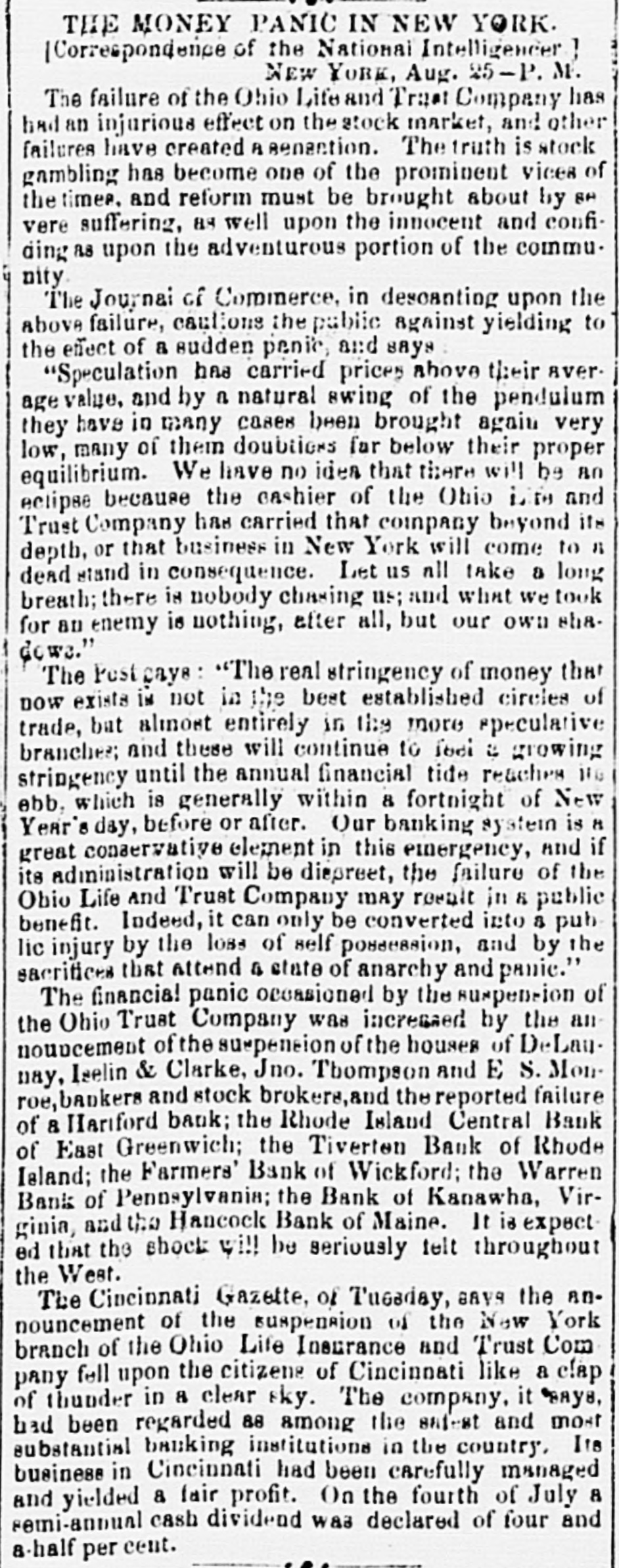 THE MONEY PANIC IN NEW YORK. [Correspondence of the National Intelligencer NEW YORK, Aug. 25-P. M. The failure of the Ohio Life and Trust Company has had an injurious effect on the stock market, and other failures have created A senection. The truth is stock gambling has become one of the prominent vices of the times, and reform must be brought about by 8A vere suffering, as well upon the innocent and confiding as upon the adventurous portion of the community. The Journal of Commerce, in desoanting upon the above failure, cautions the public against yielding to the effect of a sudden penic, and says "Speculation has carried prices above their aver. age value, and by a natural swing of the pendulum they have in many cases been brought again very low, many of them doubtions for below their proper equilibrium. We have no idea that there will be an ectipse because the cashier of the Obio Life and Trust Company has carried that company beyond its depth, or that business in New York will come to n dead stand in consequence. Let us all take a long breath; there is nobody chasing us; and what we took for an enemy is nothing, after all, but our own shadows." The Post cays: "The real stringency of money that now exists is not in the best established circles of trade, but almost entirely in the more speculative branches; and these will continue to fedi is growing stringency until the annual financial tide reaches in ebb, which is generally within 8 fortnight of New Year's day, before or after. Our banking system is H great conservative element in this emergency, And if its administration will be dispreet, the failure of the Obio Life and Trust Company may result in & public benefit. Indeed, it can only be converted into a pub lic injury by the loss of self possession, and by the sacrifices that Attend a state of anarchy and panic." The financial panic occasioned by the suspension of the Ohio Trust Company was increased by the announcement of the surpension of the houses of DeLannay, Iselin & Clarke, Jno. Thompson and E S. Monroe, bankers and stock brokers, and the reported failure of 8 Hariford bank; the Rhode Island Central Bank of East Greenwich; the Tiverten Bank of Rhode Island; the Farmers' Bank of Wickford; the Warren Bank of Pennsylvania; the Bank of Kanawha, Virginia, and the Hancock Bank of Maine. It is expected that the shock will be seriously telt throughout the West. The Cincinnati Gazette, of Tuesday, 8AV9 the announcement of the suspension of the New York branch of the Ohio Life Insurance and Trust Com pany fell upon the citizens of Cincinnati like a clap of thunder in 8 clear sky. The company, it *says, had been regarded 88 among the safest and most substantial banking institutions in the country, Its business in Cincinnati had been carefully managed and yielded 8 fair profit. On the fourth of July 8 semi-annual cash dividend was declared of four and a-half per cent. A