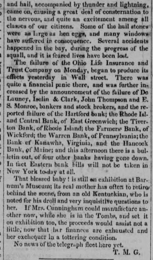 and hail, accompanied by thunder and lightning, came on, causing a great deal of consternation to the nervous, and quite an excitement ameng all classes of our citizens. Some of the hail stones were as large as hen eggs, and many windows have suffered in consequence. Several accidents happened in the bay, during the progress of the squall, and it is feared lives have been lost. THE FAILURE OF THE OHIO LIFE INSURANCE AND TRUST COMPANY The failure of the Ohio Life Insurance and Trust Company on Monday, began to produce its effects yesterday in Wall street. There was quite a financial panic there, and was further increased by the announcement of the failure of De Launcy, Iselin & Clark, John Thompson and E. S. Monroe, bankers and stock brokers, and the reported failure of the Hartford bank; the Rhode Island Central Bank, of East Greenwich; the Tiverton Bank, of Rhode Island; the Farmers' Bank, of Wickford; the Warren Bank, of Pennsylvania; the Bank of Kanawha, Virginia, and the Hancock Bank, of Maine; and this afternoon there is a bulletin out, of four other banks having gone down. In fact Eastern bank bills will not be taken in New York to-day at all. That blessed baby! is still en exhibition at Barnum's Museum; its real mother has often to retire behind the scene, from an old Kentuckian, who is noted for his droll and very inquisitive questions to her. If Mrs. Cunningham could manufacture another now, while she is in the Tombs, and set it on exhibition too, the proceeds would assist not a little; now that her finances are exhausted and her exchequer in a tottering condition. No news of the telegraph fleet here yet. T. M. G.