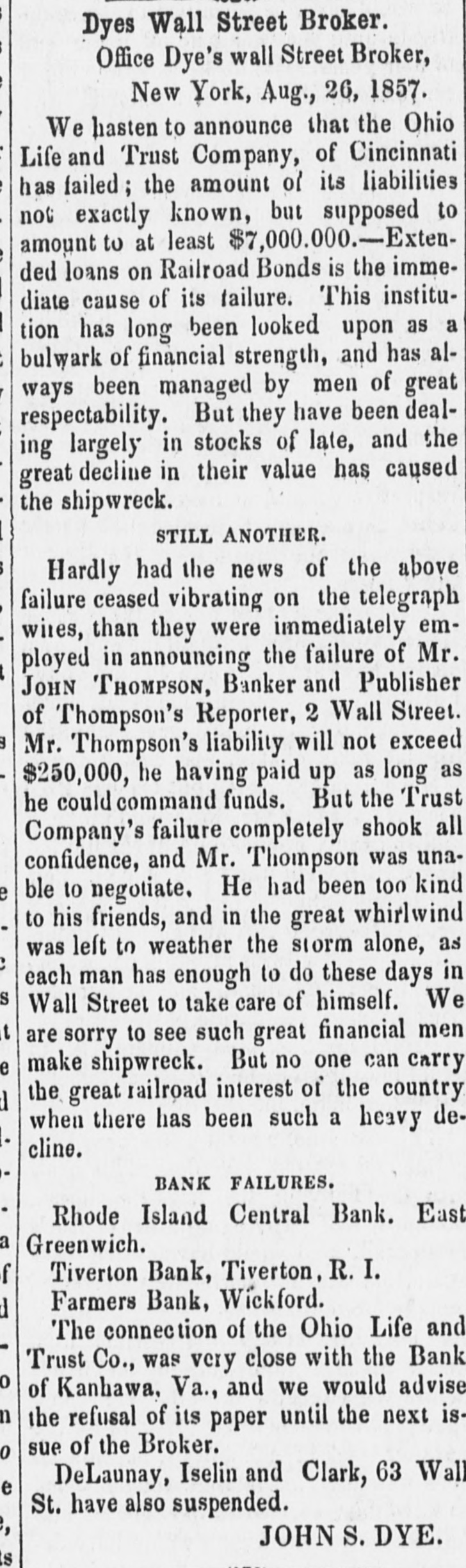 Dyes Wall Street Broker. Office Dye's wall Street Broker, New York, Aug., 26, 1857. We hasten to announce that the Ohio Life and Trust Company, of Cincinnati has failed; the amount of its liabilities not exactly known, but supposed to amount to at least $7,000.000.-Extended loans on Railroad Bonds is the immediate cause of its failure. This institution has long been looked upon as a bulwark of financial strength, and has always been managed by men of great respectability. But they have been dealing largely in stocks of late, and the great decline in their value has caused the shipwreck. STILL ANOTHER. Hardly had the news of the above failure ceased vibrating on the telegraph wires, than they were immediately employed in announcing the failure of Mr. JOHN THOMPSON, Banker and Publisher of Thompson's Reporter, 2 Wall Street. Mr. Thompson's liability will not exceed $250,000, he having paid up as long as he could command funds. But the Trust Company's failure completely shook all confidence, and Mr. Thompson was unable to negotiate. He had been too kind to his friends, and in the great whirlwind was left to weather the storm alone, as each man has enough to do these days in S Wall Street to take care of himself. We are sorry to see such great financial men e make shipwreck. But no one can carry the great railroad interest of the country 1 when there has been such a heavy decline. BANK FAILURES. Rhode Island Central Bank. East a Greenwich. f Tiverton Bank, Tiverton, R. I. Farmers Bank, Wickford. The connection of the Ohio Life and Trust Co., was very close with the Bank of Kanhawa, Va., and we would advise = the refusal of its paper until the next issue of the Broker. 0 DeLaunay, Iselin and Clark, 63 Wall e St. have also suspended. JOHN S. DYE.