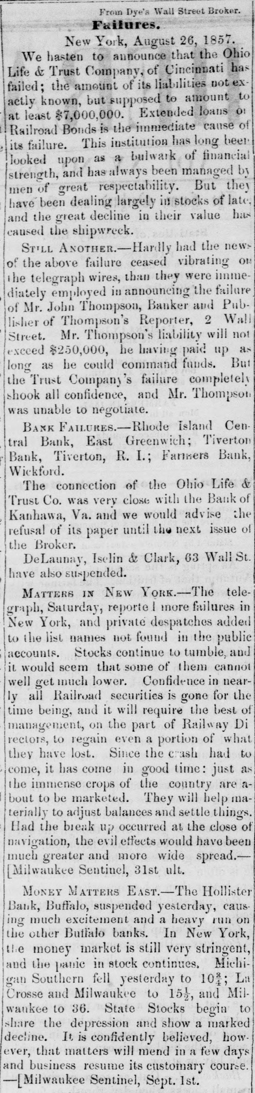 From Dye's Wall Street Broker. Failures. New York, August 26, 1857. We hasten to announce that the Ohio Life & Trust Company, of Cincinnati has failed; the amount of its liabilities not exactly known, but supposed to amount to at least $7,000,000. Extended loans 01 Railroad Bonds is the immediate cause of its failure. This institution has long been looked upon as a bulwark of financial strength, and has always been managed by men of great respectability. But they have been dealing largely in stocks of late, and the great decline in their value has caused the shipwreck. ST'LL ANOTHER.-Hardly had the news of the above failure ceased vibrating ON the telegraph wires, than they were immediately employed in announcing the failure of Mr. John Thompson, Banker and Publisher of Thompson's Reporter, 2 Wall Street. Mr. Thompson's liability will not exceed $250,000, he having paid up as long as he could command funds. But the Trust Company's failure completely shook all confidence, and Mr. Thompson was unable to negotiate. BANK FAILURES.-Rhode Island Central Bank, East Greenwich; Tiverton Bank, Tiverton, R. I.; Farmers Bank, Wickford. The connection of the Ohio Life & Trust Co. was very close with the Bank of Kanhawa, Va. and we would advise the refusal of its paper until the next issue of the Broker. DeLaunay, Iselin & Clark, 63 Wall St. have also suspended. MATTERS IN NEW York.-The telegraph, Saturday, reporte I more failures in New York, and private despatches added to the list names not found in the public accounts. Stocks continue to tumble, and it would seem that some of them cannot well get much lower. Confidence in nearly all Railroad securities is gone for the time being, and it will require the best of management, on the part of Railway Di rectors, to regain even a portion of what they have lost. Since the crash had to come, it has come in good time: just as the immense crops of the country are about to be marketed. They will help materially to adjust balances and settle things. Had the break up occurred at the close of navigation, the evil effects would have been much greater and more wide spread.[Milwaukee Sentinel, 31st ult. MONEY MATTERS EAST.-The Hollister Bank, Buffalo, suspended yesterday, causing much excitement and a heavy run on the other Butfalo banks. In New York, the money market is still very stringent, and the panic in stock continues. Michigan Southern fell yesterday to 10 &; La Crosse and Milwaukee to 15½, and Milwankee to 36. State Stocks begin to share the depression and show a marked decline. It is confidently believed, how. ever, that matters will mend in a few days and business resume its customary course. -[Milwankee Sentinel, Sept. 1st.