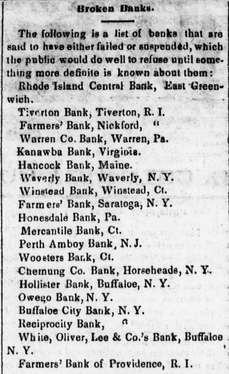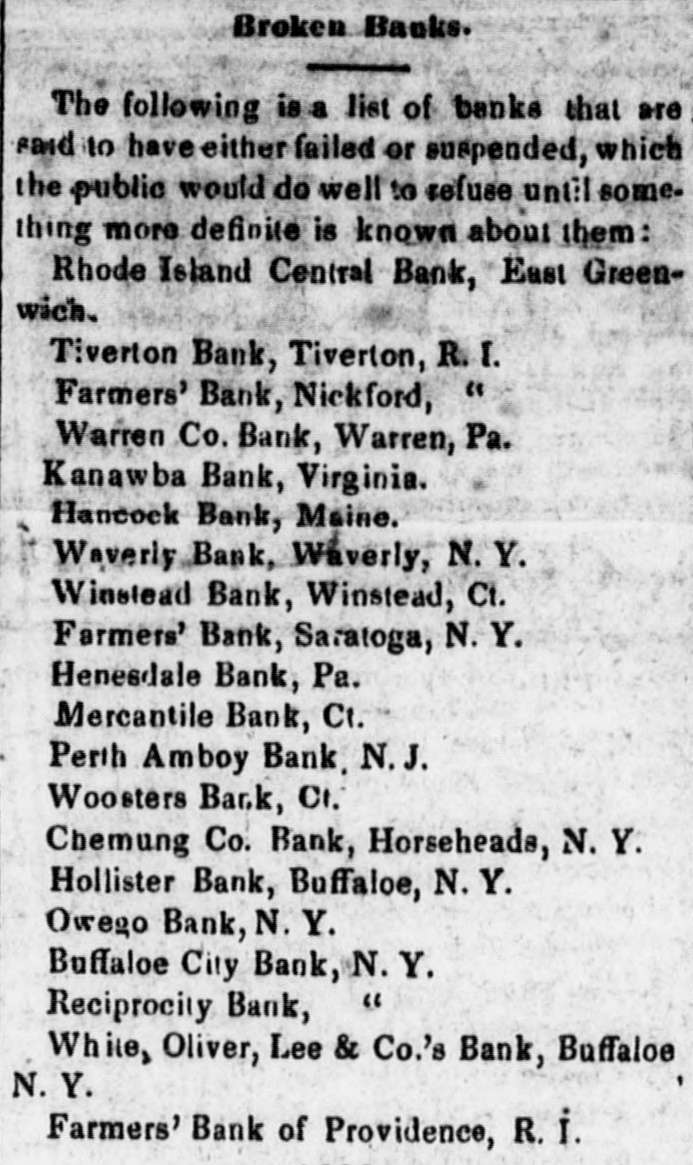 Broken Banks. The following is a list of banks that are said to have either failed or suspended, which the public would do well to refuse until something more definite is known about them: Rhode Island Central Bank, East Greenwich. Tiverton Bank, Tiverton, R.I. Farmers' Bank, Nickford, " Warren Co. Bank, Warren, Pa. Kanawba Bank, Virginia. Hancock Bank, Maine. Waverly Bank, Waverly, N.Y. Winstead Bank, Winstead, Ct. Farmers' Bank, Saratoga, N. Y. Honesdale Bank, Pa. Mercantile Bank, Ct. Perth Amboy Bank, N. J. Woosters Bank, Ct. Chemung Co. Bank, Horseheade, N. Y., Hollister Bank, Buffaloe, N. Y. Owego Bank, N. Y. Buffaloe City Bank, N. Y. C Reciprocity Bank, White, Oliver, Lee & Co.'s Bank, Buffaloe N.Y. Farmers' Bank of Providence, R. I.