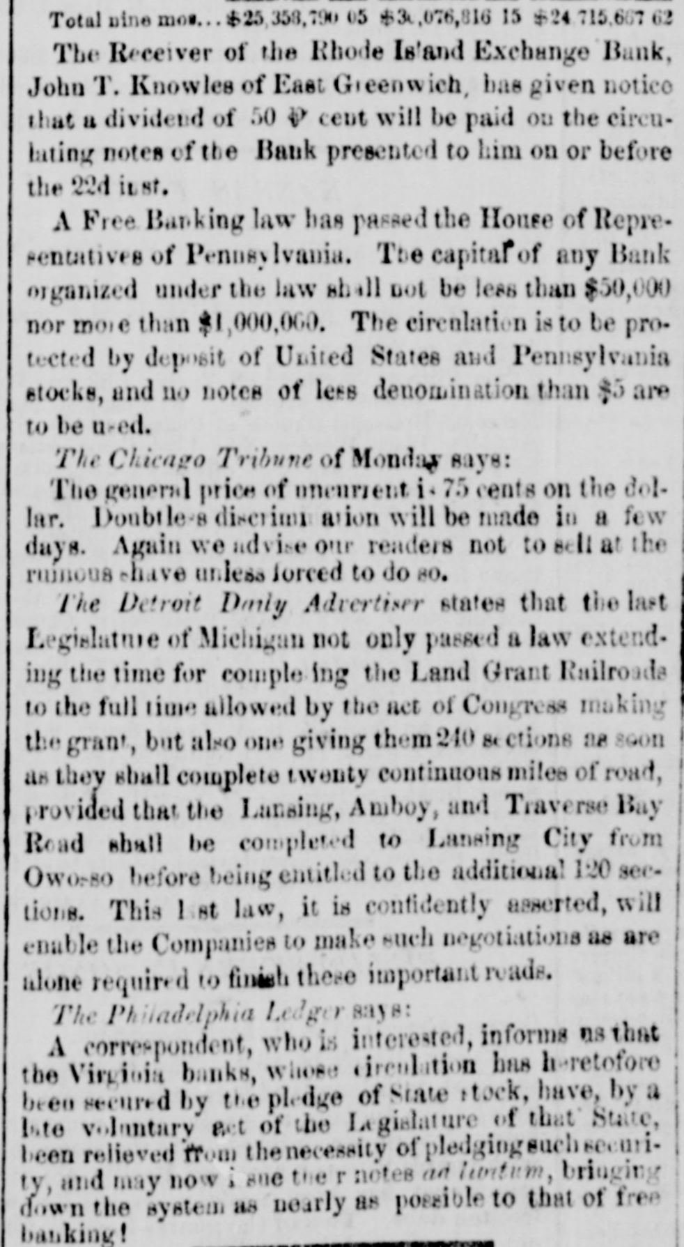 Total nine mos... $25,358,790 05 $3,076,816 15 $24.715.667 62 The Receiver of the Rhode Island Exchange Bank, John T. Knowles of East Greenwich, has given notice that a dividend of 50 cent will be paid on the circulating notes of the Bank presented to him on or before the 22d inst. A Free Banking law has passed the House of Representatives of Pennsylvania. The capital of any Bank organized under the law shall not be less than $50,000 nor more than $1,000,000. The cirenlation is to be protected by deposit of United States and Pennsylvania stocks, and no notes of less denomination than $5 are to be used. The Chicago Tribune of Monday says: The general price of uncurrent is 75 cents on the dollar. Doubtless discrimination will be made in a few days. Again we advise our readers not to sell at the ruinous shave unless forced to do so. The Detroit Daily Advertiser states that the last Legislature of Michigan not only passed a law extending the time for compleing the Land Grant Railroads to the full time allowed by the act of Congress making the grant, but also one giving them 240 sections as soon as they shall complete twenty continuous miles of road, provided that the Lansing, Amboy, and Traverse Bay Road shall be completed to Lansing City from Owo-so before being entitled to the additional 120 sections. This last law, it is confidently asserted, will enable the Companies to make such negotiations as are alone required to finish these important reads. The Philadelphia Ledger says: A correspondent, who is interested, informs us that the Virgioia banks, whose circulation has heretofore been secured by the pledge of State stock, have, by a late voluntary act of the Legislature of that State, been relieved from the necessity of pledging such security, and may now issue ther notes ad lwrtum, bringing down the system as nearly as possible to that of free banking!