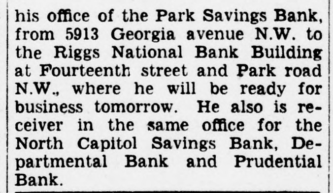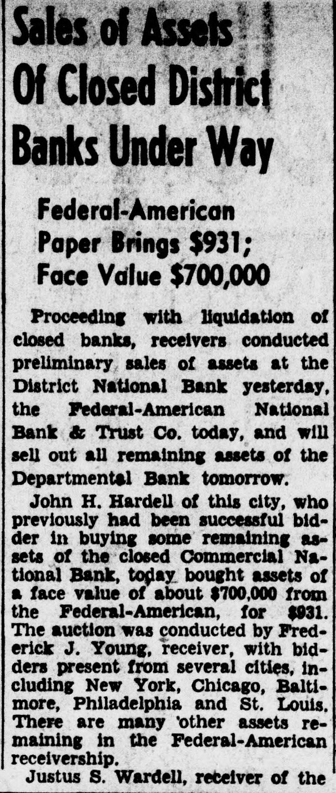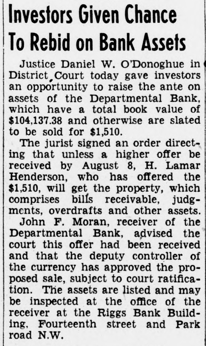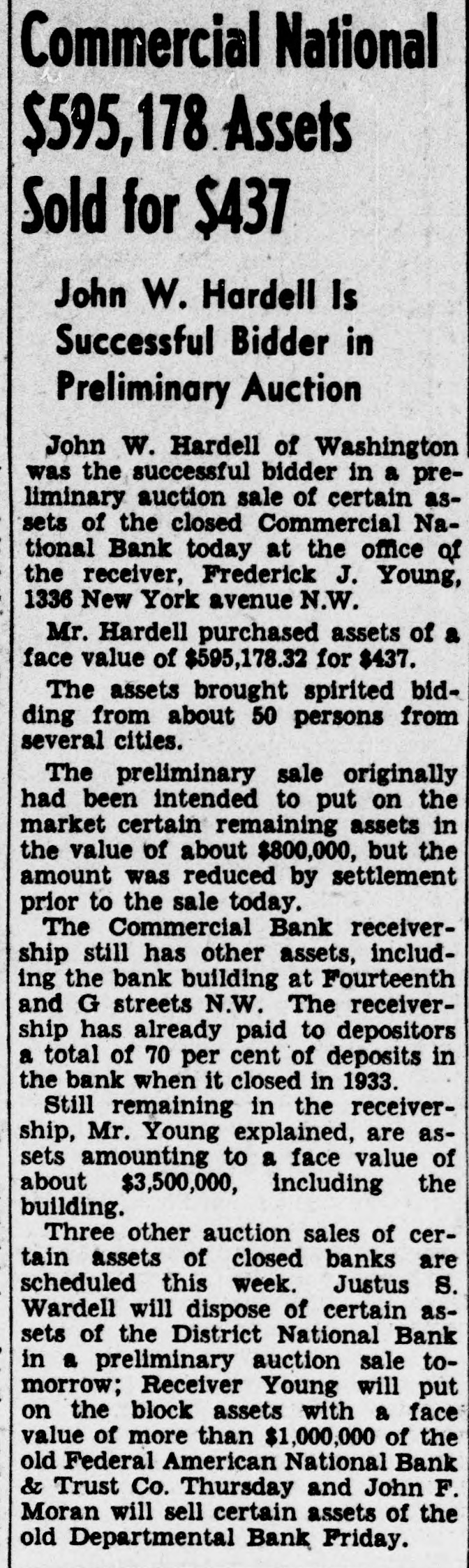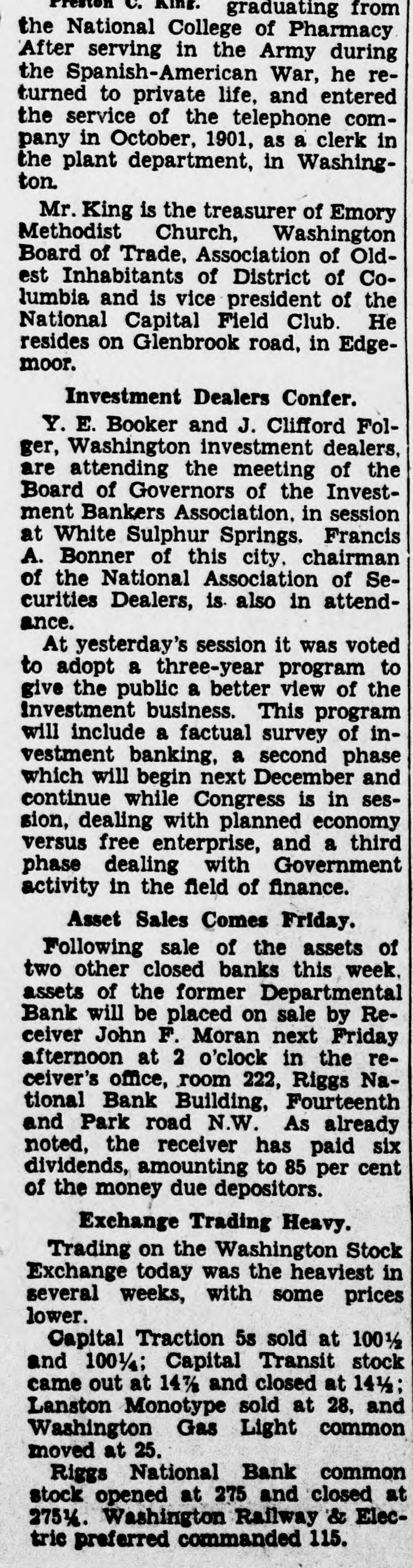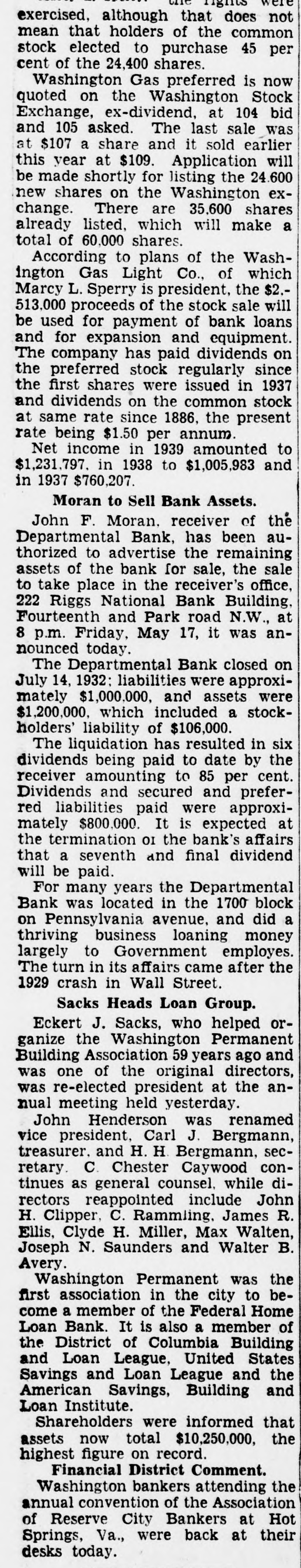 CITC rights were exercised, although that does not mean that holders of the common stock elected to purchase 45 per cent of the 24,400 shares. Washington Gas preferred is now quoted on the Washington Stock Exchange, ex-dividend, at 104 bid and 105 asked. The last sale was at $107 a share and it sold earlier this year at $109. Application will be made shortly for listing the 24.600 new shares on the Washington exchange. There are 35,600 shares already listed, which will make a total of 60,000 shares. According to plans of the Washington Gas Light Co., of which Marcy L. Sperry is president, the $2.513.000 proceeds of the stock sale will be used for payment of bank loans and for expansion and equipment. The company has paid dividends on the preferred stock regularly since the first shares were issued in 1937 and dividends on the common stock at same rate since 1886, the present rate being $1.50 per annum. Net income in 1939 amounted to $1,231,797. in 1938 to $1,005,983 and in 1937 $760,207. Moran to Sell Bank Assets. John F. Moran. receiver of the Departmental Bank, has been authorized to advertise the remaining assets of the bank for sale, the sale to take place in the receiver's office, 222 Riggs National Bank Building, Fourteenth and Park road N.W., at 8 p.m. Friday, May 17, it was announced today. The Departmental Bank closed on July 14, 1932: liabilities were approximately $1,000.000, and assets were $1,200,000, which included a stockholders' liability of $106,000. The liquidation has resulted in six dividends being paid to date by the receiver amounting to 85 per cent. Dividends and secured and preferred liabilities paid were approximately $800,000. It is expected at the termination OI the bank's affairs that a seventh and final dividend will be paid. For many years the Departmental Bank was located in the 1700 block on Pennsylvania avenue, and did a thriving business loaning money largely to Government employes. The turn in its affairs came after the 1929 crash in Wall Street. Sacks Heads Loan Group. Eckert J. Sacks, who helped organize the Washington Permanent Building Association 59 years ago and was one of the original directors, was re-elected president at the annual meeting held yesterday. John Henderson was renamed vice president, Carl J. Bergmann, treasurer. and H. H Bergmann, secretary C. Chester Caywood continues as general counsel. while directors reappointed include John H. Clipper, C. Rammling, James R. Ellis, Clyde H. Miller, Max Walten, Joseph N. Saunders and Walter B. Avery. Washington Permanent was the first association in the city to become a member of the Federal Home Loan Bank. It is also a member of the District of Columbia Building and Loan League, United States Savings and Loan League and the American Savings, Building and Loan Institute. Shareholders were informed that assets now total $10,250,000, the highest figure on record. Financial District Comment. Washington bankers attending the annual convention of the Association of Reserve City Bankers at Hot Springs, Va., were back at their desks today.
