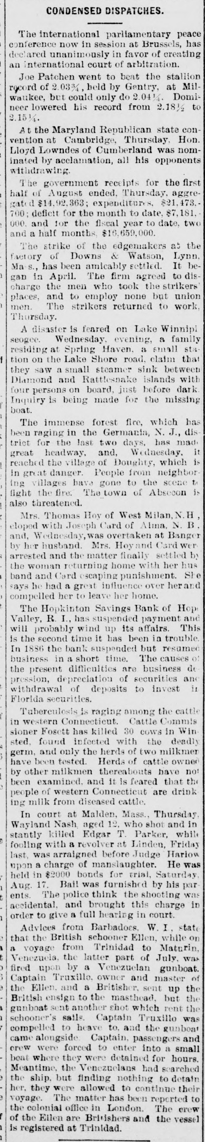 CONDENSED DISPATCHES. The international parliamentary peace has conference now in session at Brussels, declared unanimously in favor of creating an international court of arbitration. Joe Patchen went to beat the stallion Milrecord of 2.0334, held by Gentry, at Domiwaukee, but could only do 2.04 1/4. to neer lowered his record from 2.18 1/2 2.15 1/4. At the Maryland Republican state convention at Cambridge, Thursday, Hon. Lloyd Lowndes of Cumberland was nominated by acclamation, all his opponents withdrawing The government receipts for the first of August ended, Thursday, aggrehalf gated $14,92,363; expenditures, $21,473.deficit for the month to date, $7,181, 000. 700; and for the fiscal year to date, two and a half months, $16,659,000. The strike of the edgemakers at the of Downs & Watson, Lynn, befactory has been amicably settled. It disMass, in April. The firm agreed to gan the men who took the strikers union charge and to employ none but work, places, men. The strikers returned to Thursday. A disaster is feared on Lake Winnipi Wednesday, evening, a family seogee. residing at Spring Haven, a small that sta on the Lake Shore road, claim tion saw a small steamer sink between with they Diamond and Rattlesnake islands four persons on board, just before dark Inquiry is being made for the missing boat. The immense forest fire, which dis has raging in the Germania, N. J., trict been for the last two days. has mad it headway. and, Wednesday. great reached the village of Doughty, which is great danger. People from neighbor to in villages have gone to the scene is ing fight the fire. The town of Absocon also threatened. Mrs. Thomas Hoy of West Milan, N. B with Joseph Card of Alma, Banger eloped Wednesday, was overtaken at and, her husband. Mrs. Hoy and Card wer by arrested by and the matter finally settled hus woman returning home with her She the and Card escaping punishment. her and band he had a great influence over says compelled her to leave her home. The Hopkinton Savings Bank of Hop and R. I., has suspended payment This Valley, probably wind up its affairs. trouble will the second time it has been in is 1886 the bank suspended but resumec o: In in a short time. The causes de business present difficulties are business an the depreciation of securities invest it pression, withdrawal of deposits to Florida securities. Tuberculosis is raging among the Commis cattle western Connecticut. Cattle Win in Fosett has killed 30 COWS in sioner found infected with the milkmen deadly sted. and only the herds of two owned germ, been tested. Herds of cattle no have other milkmen thereabouts have the by examined. and it is feared that drink been people of western Connecticut are ing milk from diseased cattle. court at Malden, Mass., Thursday, and in In Nash, aged 12, who shot while Wayland killed Edgar T. Parker, Friday stantly with a revolver at Linden, Harlow fooling arraigned before Judge He was last, was charge of manslaughter. Saturday upon in a $2000 bonds for trial, held 17. Bail was furnished by his par was Aug. The police think the shooting in ents. accidental, and brought this court. charge order to give a full hearing in from Barbadoes. W. I. state Advices the British schooner Ellen, while on that from Trinidad to Maturin, a voyage the latter part of July, was Venezuela, upon by a Venezuelan gunboat. of fired Truxille, owner and master the Captain Ellen, and a Britisher, sent up the the British ensign to the masthead, but the sent another shot which rent schooner's gunboat salls. Captain Truxillo was to heave to, and the gunboat and compelled alongside Captain, passengers small came were forced to enter into a crew where they were detained for searched hours. boat the Venezuelans had detain Meantime, but finding nothing to were allowed to The matter has been voyage. her, the ship. they continue reported The their crew to colonial office in London. of the the Ellen are Brisishers and the vessel is registered at Trinidad.