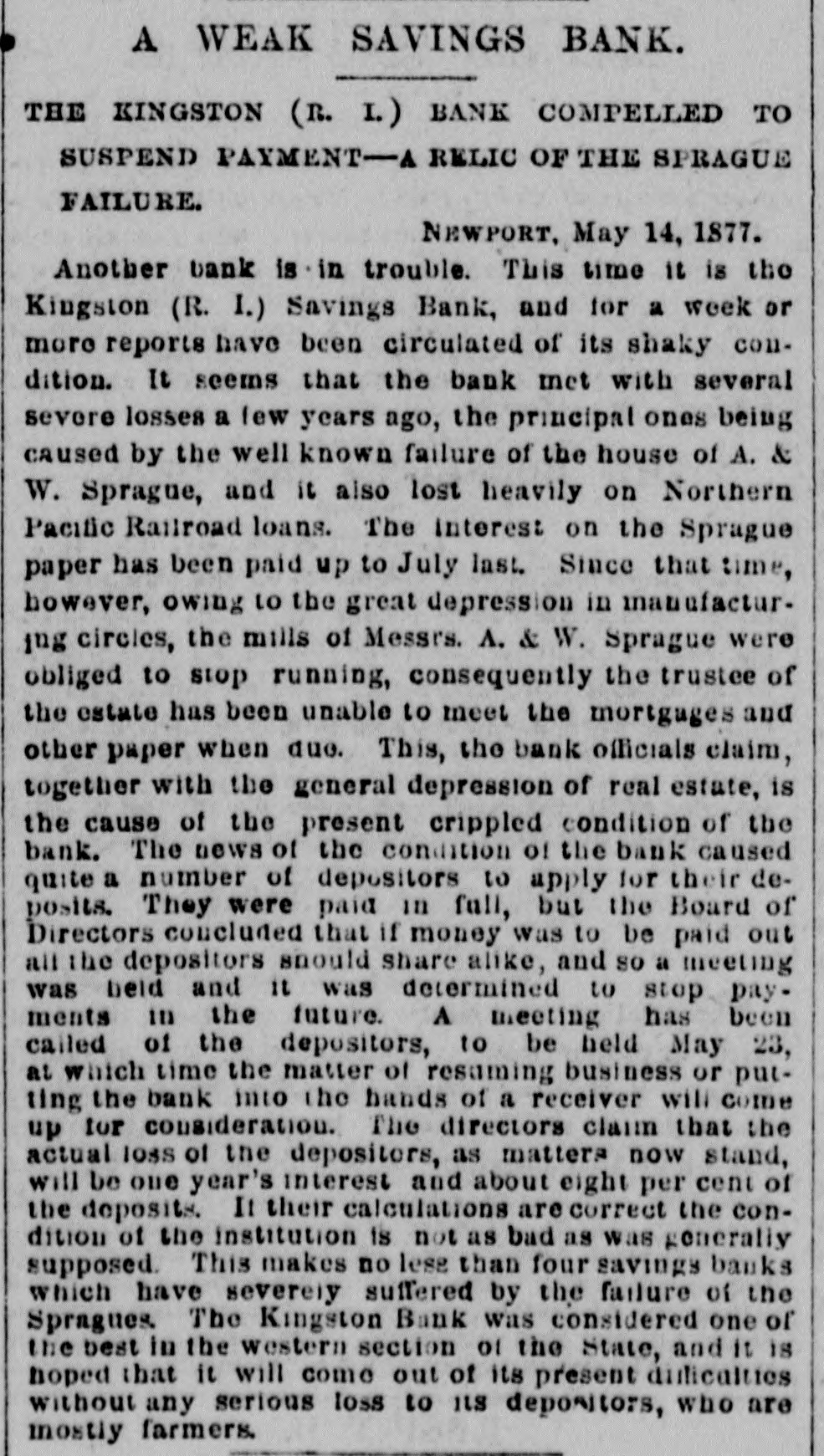 A WEAK SAVINGS BANK. THE KINGSTON (n. I.) BANK COMPELLED TO SUSPEND PAYMENT-A RELIC OF THE SPRAGUE FAILURE. NEWPORT, May 14, 1877. Another bank is in trouble. This time it is the Kingston (R. I.) Savings Bank, and for a week or more reports have been circulated of its shaky condition. It seems that the bank met with several severe losses a few years ago, the principal ones being caused by the well known failure of the house of A. & W. Sprague, and it also lost heavily on Northern Pacific Railroad loans. The interest on the Sprague paper has been paid up to July last. Since that time, however, owing to the great depression in manufacturing circles, the mills of Messrs. A. & W. Sprague were obliged to stop running, consequently the trustee of the estate has been unable to meet the mortgages and other paper when due. This, the bank officials claim, together with the general depression of real estate, is the cause of the present crippled condition of the bank. The news of the condition of the bank caused quite a number of depositors to apply for their deposits. They were paid in full, but the Board of Directors concluded that if money was to be paid out all the depositors should share alike, and so a meeting was beld and it was determined to stop payments in the future. A meeting has been called of the depositors, to be held May 23, at which time the matter of resuming business or putting the bank into the hands of a receiver will come up for consideration. The directors claim that the actual loss of the depositors, as matters now stand, will be one year's interest and about eight per cent of the deposits. It their calculations are correct the condition of the institution is not as bad as was generally supposed. This makes no less than four savings banks which have severely suffered by the failure of the Spragues. The Kingston Bank was considered one of the best in the western section of the State, and it is hoped that it will come out of its present dulicalties without any serious loss to its depositors, who are mostly farmers.