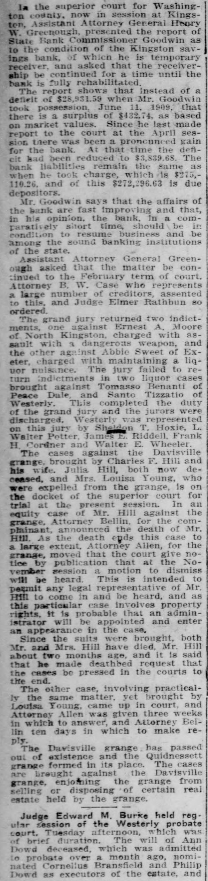 la the superior court for Washington county, now in session at Kingston, Assistant Attorney General Henry W. Greenough, presented the report of State Bank Commissioner Goodwin as to the condition of the Kingston savings bank, of which he is temporary receiver, and asked that the receivership be continued for a time until the bank is fully rehabilitated. The report shows that instead of a defieit of $28,931.59 when Mr. Goodwin took possession, June 11, 1909, that there is a surplus of $432.74, as based on market values. Since he last made report to the court at the April session there was been a proncunced gain for the bank. At that time the deficit had been reduced to $3,839.68. The bank liabilities remain the same as when he took charge, which is $275,110.26, and of this $272,296.63 is due depositors. Mr. Goodwin says that the affairs of the bank are fast improving and that, in his opinion. the bank, in a comparatively short time, should be in condition to resume business and be among the sound banking institutions of the state. Assistant Attorney General Greenough asked that the matter be continued to the February term of court. Attorney B. W. Case who represents a large number of creditors, assented to this, and Judge Elmer Rathbun so ordered. The grand jury returned two indictments, one against Ernest A. Moore of North Kingston, charged with assault with a dangerous weapon, and the other against Abbie Sweet of Exeter, charged with maintaining a liquor nuisance. The jury failed to return indictments in two liquor cases brought against Tomasso Benanti of Peace Dale, and Santo Tizzatio of Westerly. This completed the duty of the grand jury and the jurors were discharged. Westerly was represented on this jury by Sheldon T. Hoxie, L. Walter Potter, James E. Riddell. Frank H. Cordner and Walter E. Wheeler. The cases against the Davisville grange, brought by Charles F. Hill and his wife. Julia Hill, both now deceased, and Mrs. Louisa Young, who were expelled from the grange, is on the docket of the superior court for trial at the present session. In an equity case of Mr. Hill against the grange, Attorney Bellin, for the complainant, announced the death of Mr. Hill. As the death ends this case to a large extent, Attorney Allen, for the grange, moved that the court give notice by publication that at the November session a motion to dismiss will be heard. This is intended to permit any legal representative of Mr. Hill to come in and be heard, and as this particular case involves property rights, It is probable that an administrator will be appointed and enter an appearance in the case, Since the suits were brought, both Mr. and Mrs. Hill have died. Mr. Hill about two months age, and it is said that he made deathbed request that the cases be pressed in the courts to the end. The other case, involving practically the same matter, yet brought by Louisa Young, came up in court, and Attorney Allen was given three weeks in which to answer, and Attorney Bellin ten days in which to make reply. The Davisville grange has passed out of existence and the Quidnessett grange formed in its place. The cases are brought against the Davisville grange, enjoining the grange from selling or disposing of certain real estate held by the grange. Judge Edward M. Burke held reg. ular session of the Westerly probate court. Tuesday afternoon, which was of brief duration. The will of Ann Dowd deceased, which was admitted to probate over a month ago, nominated Cornellus Bransfield and Philip Dowd as executors of the estate, and