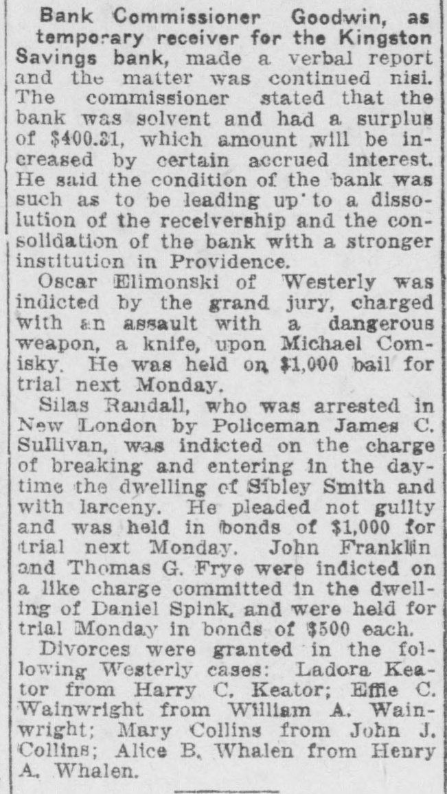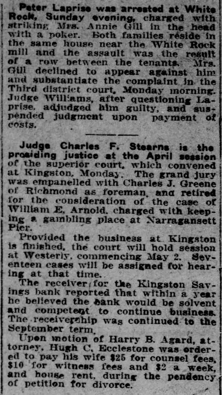 Peter Laprise was arrested at White Rock, Sunday evening, charged with striking Mrs. Annie Gill in the head with a poker. both families reside in the same house near the White Rock mill and the assault was the result of a row between the tenants. Mrs. Gill declined to appear against him and substantiate the complaint in the Third district court, Monday morning. Judge Williams, after questioning Laprise. adjudged him guilty, and suspended judgment upon payment of costs. Judge Charles F. Stearns is the prosiding justice at the April session of the superior court, which convened at Kingston, Monday. The grand jury was empanelled with Charles J. Greene of Richmond as foreman, and retired for the consideration of the case of William E. Arnold. charged with keeping a gambling place at Narragansett Pier. Provided the business at Kingston is finished, the court will hold session at Westerly, commencing May 2. Seventeen cases will be assigned for hearing at that time. The receiver for the Kingston Savings bank reported that within a year he believed the bank would be solvent and competent to continue business. The receivership was continued to the September term. Upon motion of Harry B. Agard, attorney, Hugh C, Ecclestone was ordered to pay his wife $25 for counsel fees, $10 for witness fees and $2 a week, and house rent, during the pendency of petition for divorce.