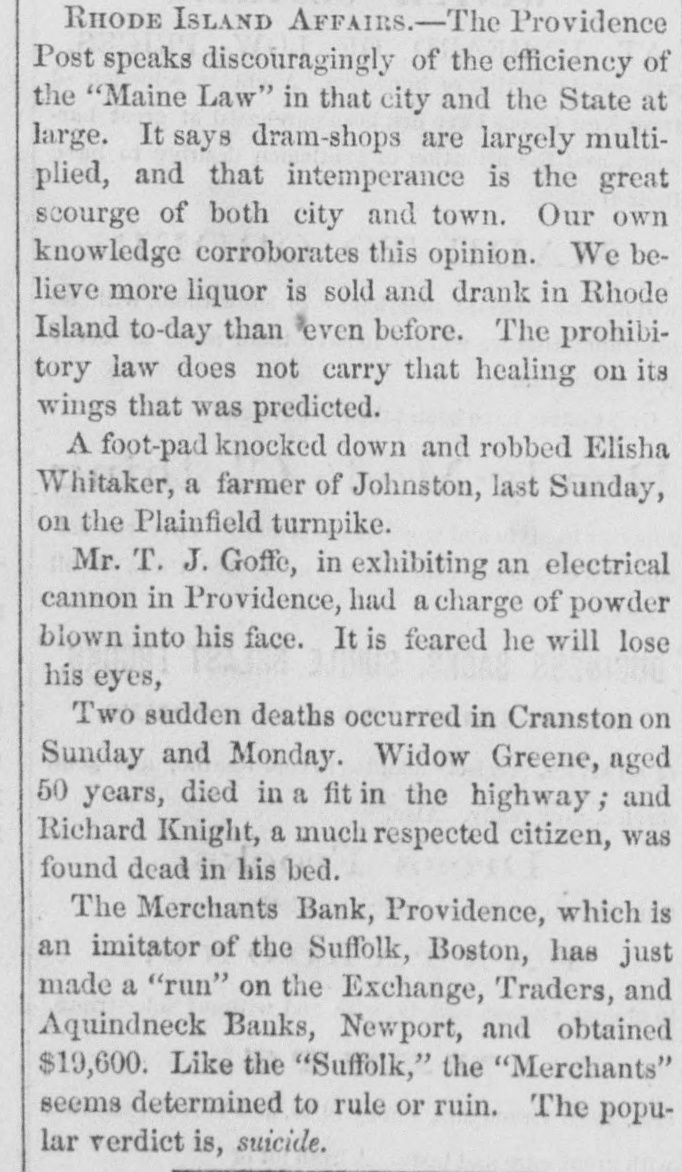 RHODE ISLAND AFFAIRS.-The Providence Post speaks discouragingly of the efficiency of the "Maine Law" in that city and the State at large. It says dram-shops are largely multiplied, and that intemperance is the great scourge of both city and town. Our own knowledge corroborates this opinion. We believe more liquor is sold and drank in Rhode Island to-day than even before. The prohibitory law does not carry that healing on its wings that was predicted. A foot-pad knocked down and robbed Elisha Whitaker, a farmer of Johnston, last Sunday, on the Plainfield turnpike. Mr. T. J. Goffe, in exhibiting an electrical cannon in Providence, had a charge of powder blown into his face. It is feared he will lose his eyes, Two sudden deaths occurred in Cranston on Sunday and Monday. Widow Greene, aged 50 years, died in a fit in the highway; and Richard Knight, a much respected citizen, was found dead in his bed. The Merchants Bank, Providence, which is an imitator of the Suffolk, Boston, has just made a "run" on the Exchange, Traders, and Aquindneck Banks, Newport, and obtained $19,600. Like the "Suffolk," the "Merchants" seems determined to rule or ruin. The popular verdict is, suicide.
