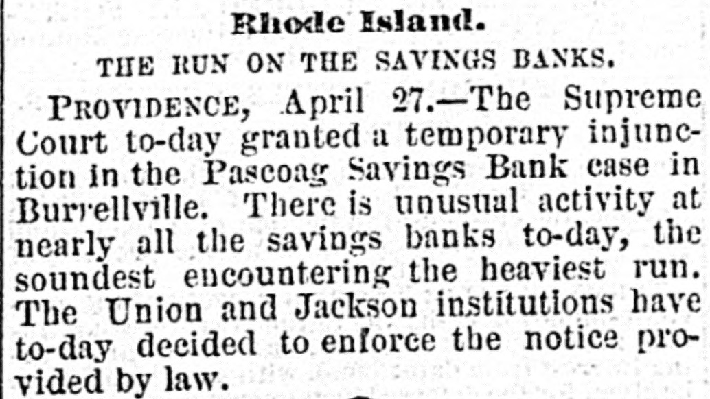 Rhode Island. THE RUN ON THE SAVINGS BANKS. PROVIDENCE, April 27.-The Supreme Court to-day granted a temporary injunetion in the Pascoag Savings Bank case in Burrellville. There is unusual activity at nearly all the savings banks to-day, the soundest encountering the heaviest run. The Union and Jackson institutions have to-day decided to enforce the notice provided by law.