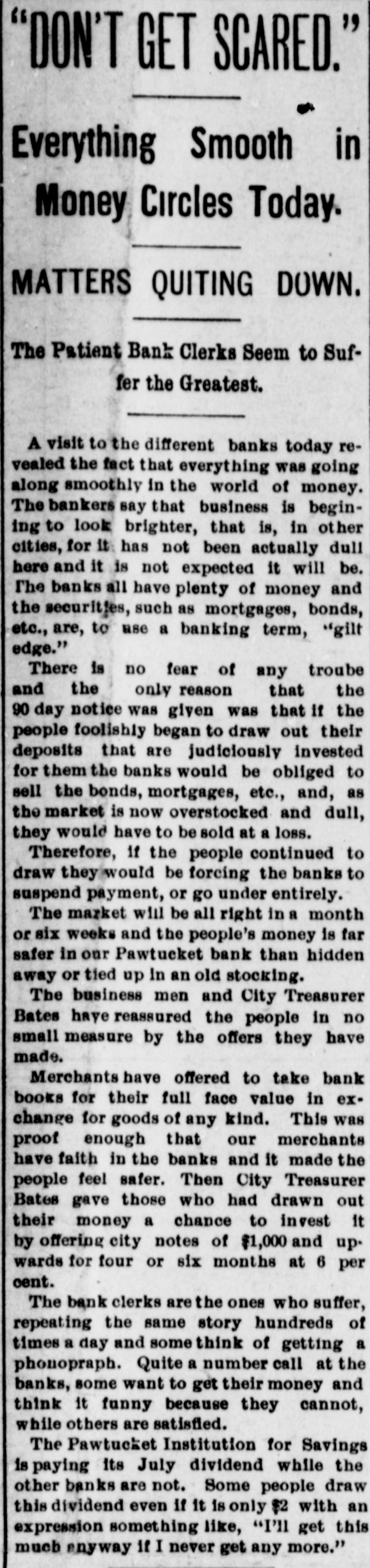 "DON'T GET SCARED." Everything Smooth in Money Circles Today. MATTERS QUITING DOWN. The Patient Bank Clerks Seem to Suffer the Greatest. A visit to the different banks today revealed the fact that everything was going along smoothly in the world of money. The bankers say that business is begining to look brighter, that is, in other cities, for it has not been actually dull here and it is not expected it will be. The banks all have plenty of money and the securities, such as mortgages, bonds, etc., are, to use a banking term, "gilt edge." There is no fear of any troube and the only reason that the 90 day notice was given was that if the people foolishly began to draw out their deposits that are judiciously invested for them the banks would be obliged to sell the bonds, mortgages, etc., and, as the market is now overstocked and dull, they would have to be sold at a loss. Therefore, if the people continued to draw they would be forcing the banks to suspend payment, or go under entirely. The market will be all right in a month or six weeks and the people's money is far safer in our Pawtucket bank than hidden away or tied up In an old stocking. The business men and City Treasurer Bates have reassured the people in no small measure by the offers they have made. Merchants have offered to take bank books for their full face value in exchange for goods of any kind. This was proof enough that our merchants have faith in the banks and it made the people feel safer. Then City Treasurer Bates gave those who had drawn out their money a chance to invest it by offering city notes of $1,000 and upwards for four or six months at 6 per cent. The bank clerks are the ones who suffer, repeating the same story hundreds of times a day and some think of getting a phonopraph. Quite a number call at the banks, some want to get their money and think it funny because they cannot, while others are satisfied. The Pawtucket Institution for Savings is paying its July dividend while the other banks are not. Some people draw this dividend even if it is only $2 with an expression something like, "I'll get this much enyway if I never get any more."