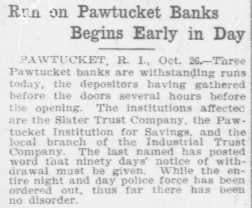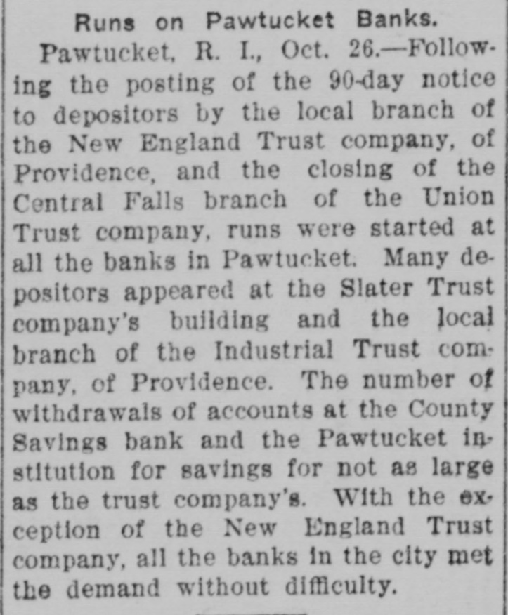 place an exact date for such an event Under ordinary conditions, he said, the Union Trust Company could have met the demand, but at the present time and under existing apprehension the result of an unusual run which threatened their institution would have been very disas trous. He said that the time which was gained by the suspension and the appointment of temporary receiver would aid greatly in restor4 ing confidence. Pawtucket, R. I., Oct. 25.-Following the post= ing of the ninety-day notice to depositors by the local branch of the New England Trust Com pany, of Providence, and the closing of the Cent tral Falls branch of the Union Trust Company to-day, runs were started on all the banks in Pawtucket. Many depositors appeared at the Slater Trust Company's building, and the local branch of the Industrial Trust Company, of Providence. The number of withdrawals of ac counts at the County Savings Bank and the Pawtucket Institution for Savings was not SO large as at the trust companies. With the exq. ception of the New England Trust Company, all the banks in the city met the demand without difficulty. Boston, Oct. 25.-The stability of Boston trust companies has been satisfactorily proved by an official test made two days ago, according to announcemvent made to-day. It is learned that on Wednesday Pierre Jay, chairman of the board of state bank commissioners and exam iners, who is in charge of the trust companies in this city, made an unexpected call on all the trust companies and found the actual reserve fund 26.76 per cent and the legal reserve 24.47 per cent. The latter figure was 1.47 per cent higher than the legal reserve on October 21, 1906