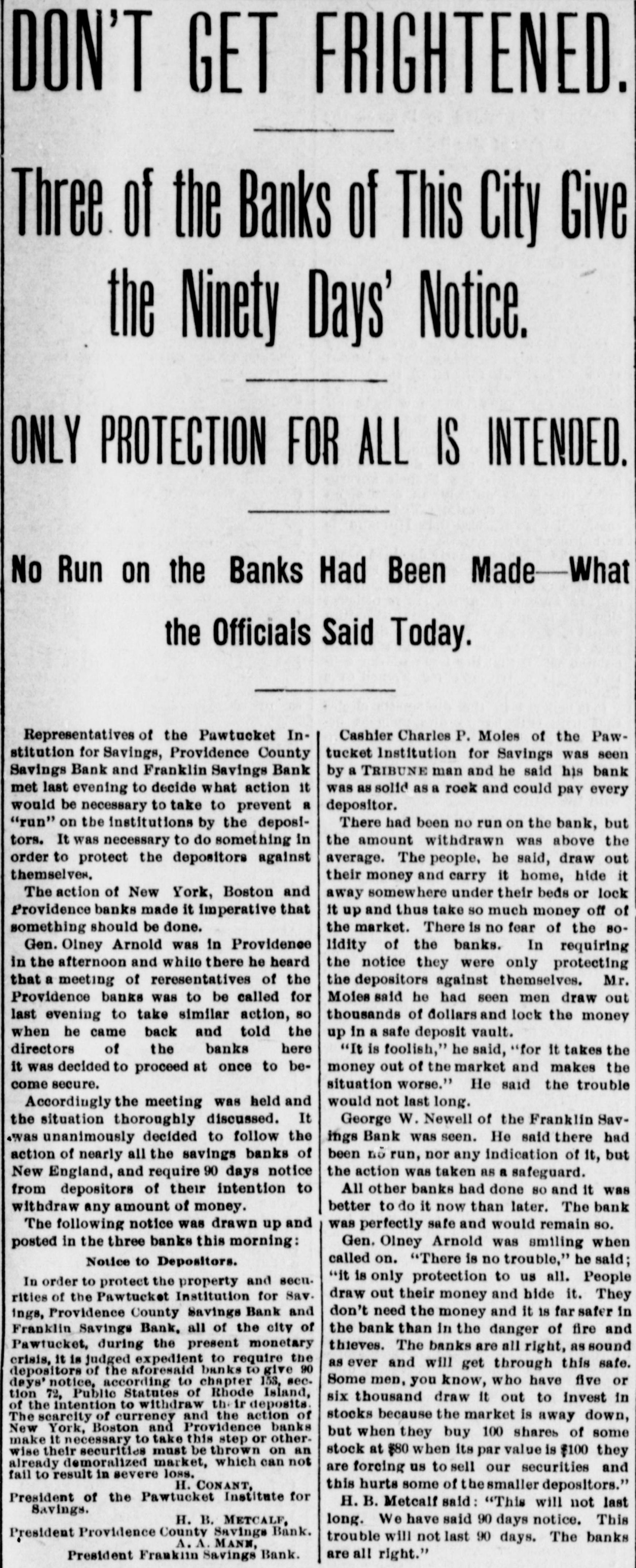DON'T GET FRIGHTENED. Three of the Banks of This City Give the Ninety Days' Notice. ONLY PROTECTION FOR ALL IS INTENDED. No Run on the Banks Had Been MadeWhat the Officials Said Today. Cashier Charles P. Moles of the PawRepresentatives of the Pawtucket Institution for Savings, Providence County tucket Institution for Savings was seen Savings Bank and Franklin Savings Bank by a TRIBUNE man and he said his bank met last evening to decide what action it was as solid as a rock and could pay every depositor. would be necessary to take to prevent a "run" on the institutions by the deposiThere had been no run on the bank, but the amount withdrawn was above the tors. It was necessary to do something in order to protect the depositors against average. The people, he said, draw out themselves. their money and carry it home, hide it The action of New York, Boston and away somewhere under their beds or lock Providence banks made it imperative that it up and thus take so much money off of the market. There is no fear of the sosomething should be done. Gen. Olney Arnold was in Providence lidity of the banks. In requiring in the afternoon and while there he heard the notice they were only protecting that a meeting of reresentatives of the the depositors against themselves. Mr. Providence banks was to be called for Moies said he had seen men draw out last evening to take similar action, so thousands of dollars and lock the money when he came back and told the up in a safe deposit vault. directors of the banks here "It is foolish," he said, "for it takes the it was decided to proceed at once to bemoney out of the market and makes the come secure. situation worse." He said the trouble would not last long. Accordingly the meeting was held and George W. Newell of the Franklin Savthe situation thoroughly discussed. It ings Bank was seen. He said there had was unanimously decided to follow the action of nearly all the savings banks of been no run, nor any indication of it, but New England, and require 90 days notice the action was taken as a safeguard. All other banks had done so and it was from depositors of their intention to better to do it now than later. The bank withdraw any amount of money. was perfectly safe and would remain so. The following notice was drawn up and Gen. Olney Arnold was smiling when posted in the three banks this morning: called on. "There is no trouble," he said; Notice to Depositors. "it is only protection to us all. People In order to protect the property and secu. draw out their money and hide it. They rities of the Pawtucket Institution for Sav. don't need the money and it is far safer in ings, Providence County Savings Bank and Franklin Savings Bank, all of the city of the bank than in the danger of fire and Pawtucket, during the present monetary thieves. The banks are all right, as sound crisis, it is judged expedient to require the as ever and will get through this safe. depositors of the aforesaid banks to give 90 Some men, you know, who have five or days' notice, according to chapter 158, section 72, Public Statutes of Rhode Island, six thousand draw it out to invest in of the intention to withdraw th. ir deposits. The scarcity of currency and the action of stocks because the market is away down, New York, Boston and Providence banks but when they buy 100 shares of some make it necessary to take this step or otherwise their securities must be thrown on an stock at $80 when its par value is $100 they already demoralized market, which can not are foreing us to sell our securities and fail to result in severe loss. H. CONANT, this hurts some of the smaller depositors." President of the Pawtucket Institute for H. B. Metcalf said: "This will not last Savings. H. B. METCALF, long. We have said 90 days notice. This President Providence County Savings Bank. trouble will not last 90 days. The banks A. A. MANN, are all right." President Franklin Savings Bank.