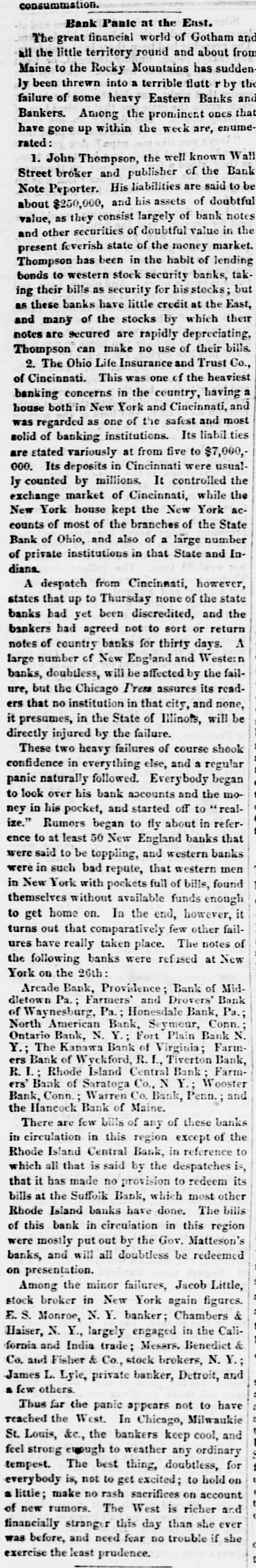 Bank Panic at the East. The great financial world of Gotham and all the little territory round and about from Maine to the Rocky Mountains has sudden ly been threwn into a terrible flutt r by the failure of some heavy Eastern Banks and Bankers. Among the prominent ones that have gone up within the week are, enumerated: 1. John Thompson, the well known Wall Street broker and publisher of the Bank Note Peporter. His liabilities are said to be about $250,000, and his assets of doubtful value, as they consist largely of bank notes and other securities of doubtful value in the present feverish state of the money market. Thompson has been in the habit of lending bonds to western stock security banks, taking their bills as security for his stocks; but as these banks have little credit at the East, and many of the stocks by which their notes are secured are rapidly depreciating, Thompson can make no use of their bills. 2. The Ohio Life Insurance and Trust Co., of Cincinnati. This was one of the heaviest banking concerns in the country, having a house both in New York and Cincinnati, and was regarded as one of the safest and most solid of banking institutions. Its liabil ties are stated variously at from five to $7,000,000. Its deposits in Cincinnati were usually counted by millions. It controlled the exchange market of Cincinnati, while the New York house kept the New York accounts of most of the branches of the State Bank of Ohio, and also of a large number of private institutions in that State and Indiana. A despatch from Cincinnati, however, states that up to Thursday none of the state banks had yet been discredited, and the bankers had agreed not to sort or return notes of country banks for thirty days. A large number of New England and Western banks, doubtless, will be affected by the failure, but the Chicago Tress assures its readers that no institution in that city, and none, it presumes, in the State of Illinois, will be directly injured by the failure. These two heavy failures of course shook confidence in everything else, and a regular panie naturally followed. Everybody began to look over his bank accounts and the money in his pocket, and started off to "realize." Rumors began to fly about in reference to at least 50 New England banks that were said to be toppling, and western banks were in such bad repute, that western men 1 1 in New York with pockets full of bills, found themselves without available funds enough to get home on. In the end, however, it turns out that comparatively few other failures have really taken place. The notes of the following banks were refused at New York on the 26th: Arcade Bank, Providence; Bank of Middletown Pa.; Farmers' and Drovers' Bank of Waynesburg, Pa.; Honesdale Bank, Pa.; North American Bank, Seymour, Conn.; Ontario Bank, N. Y.; Fort Plain Bank N. Y.; The Kanawa Bank of Virginia; Farmers Bank of Wyckford, R.I., Tiverton Bank, R. I.; Rhode Island Central Bank Farmers' Bank of Saratoga Co., N Y.; Wooster Bank, Conn.; Warren Co. Bank, Penn.; and the Hancock Bank of Maine. There are few bills of any of these banks in circulation in this region except of the Rhode Island Central Bank, in reference to which all that is said by the despatches is, that it has made no provision to redeem its bills at the Suffolk Bank, which most other Rhode Island banks have done. The bills of this bank in circulation in this region were mostly put out by the Gov. Matteson's banks, and will all doubtless be redeemed on presentation. Among the minor failures, Jacob Little, as stock broker in New York again figures. E.S. Monroe, N. Y. banker; Chambers & Haiser, N. Y., largely engaged in the California and India trade; Mesars. Benedict & Co. and Fisher & Co., stock brokers, N. Y.; James L. Lyle, private banker, Detroit, and few others. Thus far the panic appears not to have M 03 reached the West. In Chicago, Milwaukie St. Louis, &c., the bankers keep cool, and feel strong enough to weather any ordinary in tempest. The best thing, doubtless, for everybody is, not to get excited; to hold on a little; make no rash sacrifices on account of new rumors. The West is richer and financially stranger this day than she ever was before, and need fear no trouble if she exercise the least prudence.