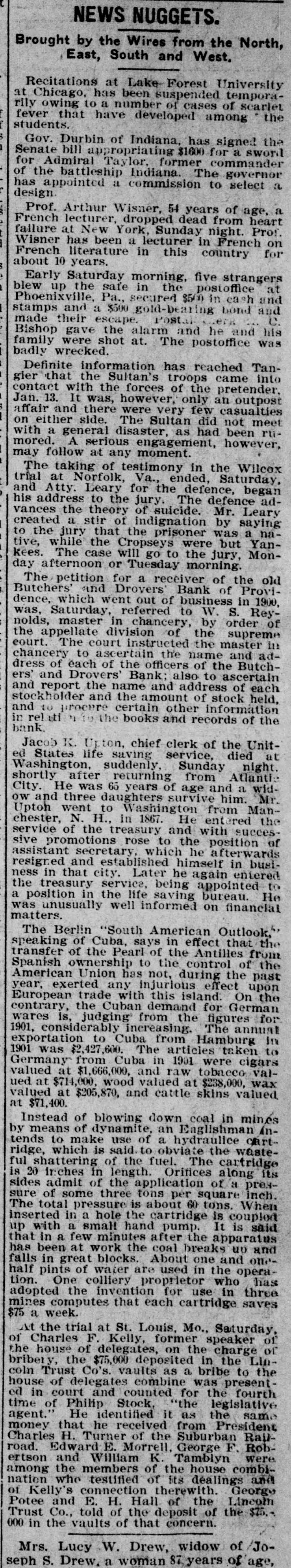 # NEWS NUGGETS. Brought by the Wires from the North, East, South and West. Recitations at Lake Forest University at Chicago, has been suspended temporarily owing to a number of cases of scarlet fever that have developed among the students. Gov. Durbin of Indiana, has signed the Senate bill appropriating $1600 for a sword for Admiral Taylor, former commander of the battleship Indiana. The governor has appointed a commission to select a design. Prof. Arthur Wisner, 54 years of age, a French lecturer, dropped dead from heart failure at New York, Sunday night. Prof. Wisner has been a lecturer in French on French literature in this country for about 10 years. Early Saturday morning, five strangers blew up the safe in the postoffice at Phoenixville, Pa., secured $50 in cash and stamps and a $500 gold-bearing bond and made their escape. Postal Clerk C. Bishop gave the alarm and he and his family were shot at. The postoffice was badly wrecked. Definite information has reached Tangier that the Sultan's troops came into contact with the forces of the pretender, Jan. 13. It was, however, only an outpost affair and there were very few casualties on either side. The Sultan did not meet with a general disaster, as had been rumored. A serious engagement, however, may follow at any moment. The taking of testimony in the Wilcox trial at Norfolk, Va., ended, Saturday, and Atty. Leary for the defence, began his address to the jury. The defence advances the theory of suicide. Mr. Leary created a stir of indignation by saying to the jury that the prisoner was a native, while the Cropseys were but Yankees. The case will go to the jury, Monday afternoon or Tuesday morning. The petition for a receiver of the old Butchers' and Drovers' Bank of Providence, which went out of business in 1900, was, Saturday, referred to W. S. Reynolds, master in chancery, by order of the appellate division of the supreme court. The court instructed the master in chancery to ascertain the name and address of each of the officers of the Butchers' and Drovers' Bank; also to ascertain and report the name and address of each stockholder and the amount of stock held, and to procure certain other information in relation to the books and records of the bank. Jacob K. Upton, chief clerk of the United States life saving service, died at Washington, suddenly, Sunday night, shortly after returning from Atlantic City. He was 65 years of age and a widow and three daughters survive him. Mr. Upton went to Washington from Manchester, N. H., in 1867. He entered the service of the treasury and with successive promotions rose to the position of assistant secretary, which he afterwards resigned and established himself in business in that city. Later he again entered the treasury service, being appointed to a position in the life saving bureau. He was unusually well informed on financial matters. The Berlin "South American Outlook," speaking of Cuba, says in effect that the transfer of the Pearl of the Antilles from Spanish ownership to the control of the American Union has not, during the past year, exerted any injurious effect upon European trade with this island. On the contrary, the Cuban demand for German wares is, judging from the figures for 1901, considerably increasing. The annual exportation to Cuba from Hamburg in 1901 was $2,427,600. The articles taken to Germany from Cuba in 1901 were cigars valued at $1,666,000, and raw tobacco valued at $714,000, wood valued at $238,000, wax valued at $205,870, and cattle skins valued at $71,400. Instead of blowing down coal in mines by means of dynamite, an Englishman intends to make use of a hydraulic cartridge, which is said to obviate the wasteful shattering of the fuel. The cartridge is 20 inches in length. Orifices along its sides admit of the application of a pressure of some three tons per square inch. The total pressure is about 60 tons. When inserted in a hole the cartridge is coupled up with a small hand pump. It is said that in a few minutes after the apparatus has been at work the coal breaks up and falls in great blocks. About one and one-half pints of water are used in the operation. One colliery proprietor who has adopted the invention for use in three mines computes that each cartridge saves $75 a week. At the trial at St. Louis, Mo., Saturday, of Charles F. Kelly, former speaker of the house of delegates, on the charge of bribery, the $75,000 deposited in the Lincoln Trust Co's. vaults as a bribe to the house of delegates combine was presented in court and counted for the fourth time of Philip Stock, "the legislative agent." He identified it as the same money that he received from President Charles H. Turner of the Suburban Railroad. Edward E. Morrell, George F. Robertson and William K. Tamblyn were among the members of the house combination who testified of its dealings and of Kelly's connection therewith. George Potee and E. H. Hall of the Lincoln Trust Co., told of the deposit of the $75,000 in the vaults of that concern. Mrs. Lucy W. Drew, widow of Joseph S. Drew, a woman 87 years of age,
