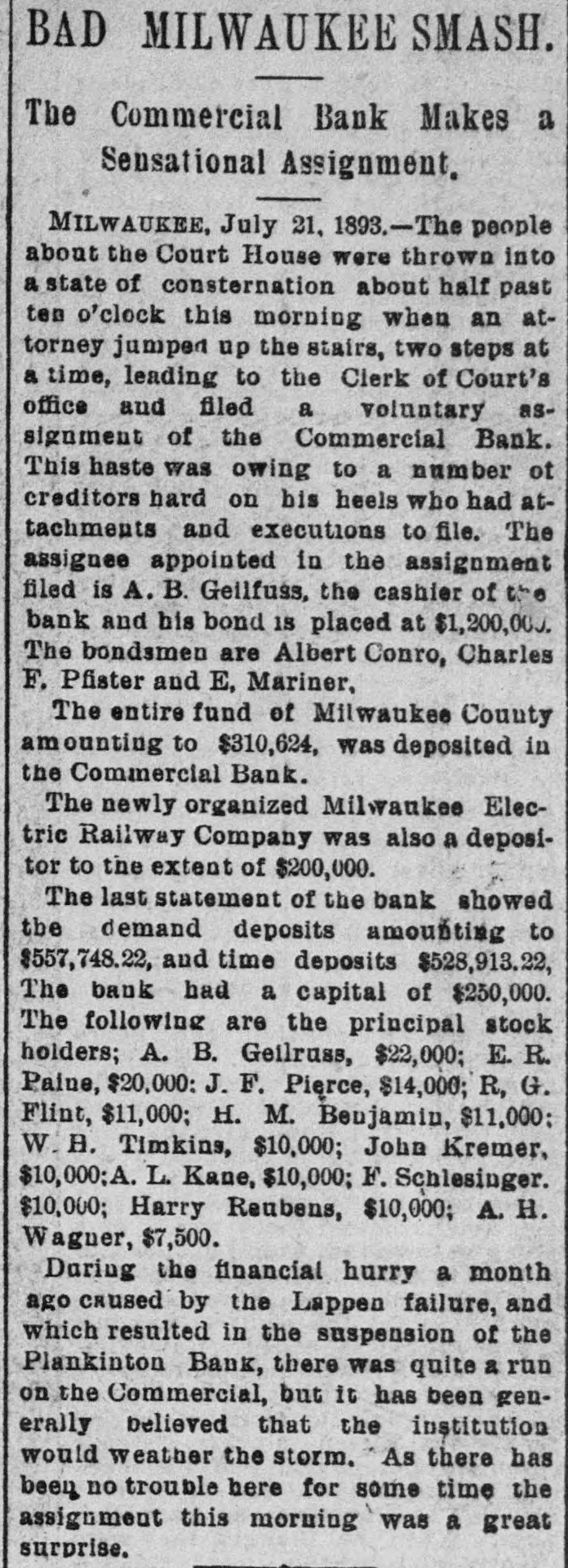 BAD MILWAUKEE SMASH. The Commercial Bank Makes a Sensational Assignment. MILWAUKEE, July 21, 1893.-The people about the Court House were thrown into a state of consternation about half past ten o'clock this morning when an attorney jumper up the stairs, two steps at a time, leading to the Clerk of Court's office and filed a voluntary assignment of the Commercial Bank. This haste was owing to a number ot creditors hard on his heels who had attachments and executions to file. The assignee appointed in the assignment filed is A. B. Geilfuss, the cashier of the bank and his bond 18 placed at $1,200,000 The bondsmen are Albert Conro, Charles F. Pfister and E, Mariner, The entire fund of Milwaukee County am ounting to $310,624, was deposited in the Commercial Bank. The newly organized Milwaukee Electric Railway Company was also a depositor to the extent of $200,000. The last statement of the bank showed the demand deposits amounting to $557,748.22, and time deposits $528,913.22, The bank had a capital of $250,000. The following are the principal stock holders; A. B. Geilruss, $22,000; E. R. Palue, $20,000: J. F. Pierce, $14,000; R, G. Flint, $11,000; H. M. Beujamin, $11,000: W. H. Timkins, $10,000; John Kremer, $10,000;A. L. Kane, $10,000; F. Schlesinger. $10,000; Harry Reubens, $10,000; A. H. Waguer, $7,500. During the financial hurry a month ago caused by the Lappen failure, and which resulted in the suspension of the Plankinton Bank, there was quite a run on the Commercial, but it has been generally believed that the institution would weather the storm. As there has been no trouble here for some time the assignment this morning was a great surprise.
