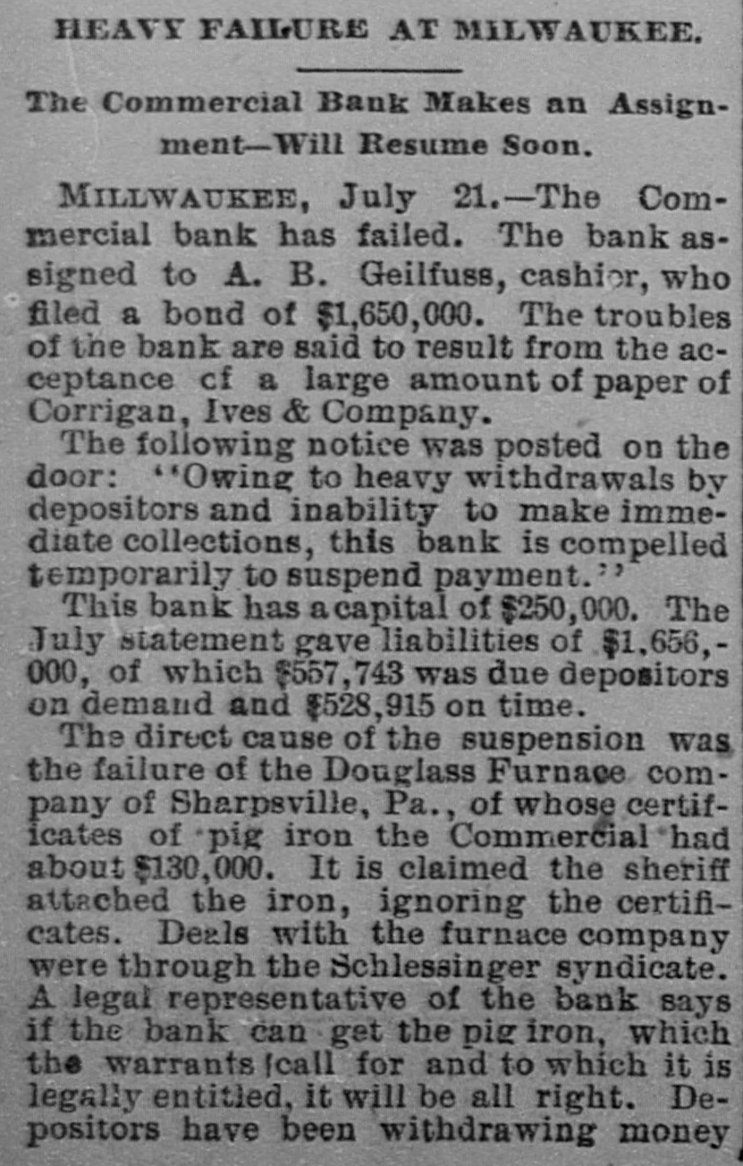 CAUGHT IN THE SLUMP. The Commercial Bank of Milwaukee Forced to Close Doors. MILWAUKEE, July 21. - The Commercial bank of this city assigned today to A. B. Geilfnes, cashier, whose bond is fixed at $1,650,000. The troubles of the bank are said to have resulted from the acceptance of a large amount of paper of Corrigan, Ives & Co. The following notice was posted on the door: "Owing to heavy withdrawals by depositors and inability to make immediate collections, this bank is compelled temporarily to suspend payment." The bank has a capital of $250,000. The July statement gave the liabilities at $1,656,850, of which $557,743 was due depositors on demand and $528,915 on time. The direct cause of the suspension was the failure of the Douglass Furnace company of Sharpville, Pa., of whose certificates of stored pig iron the bank had about $130,000. It is claimed that the sheriff attached the iron, ignoring the certificates. Its deals with the Furnace company were through the Schlesinger syndicate. The legal representative of the bank says if the bank can get the pig iron which the warrants call for, and to which it is legally entitled, it will be all right. The depositors had been witho'rawing money for some time, and when st closed only $30,000 demand certificate's were on hand.