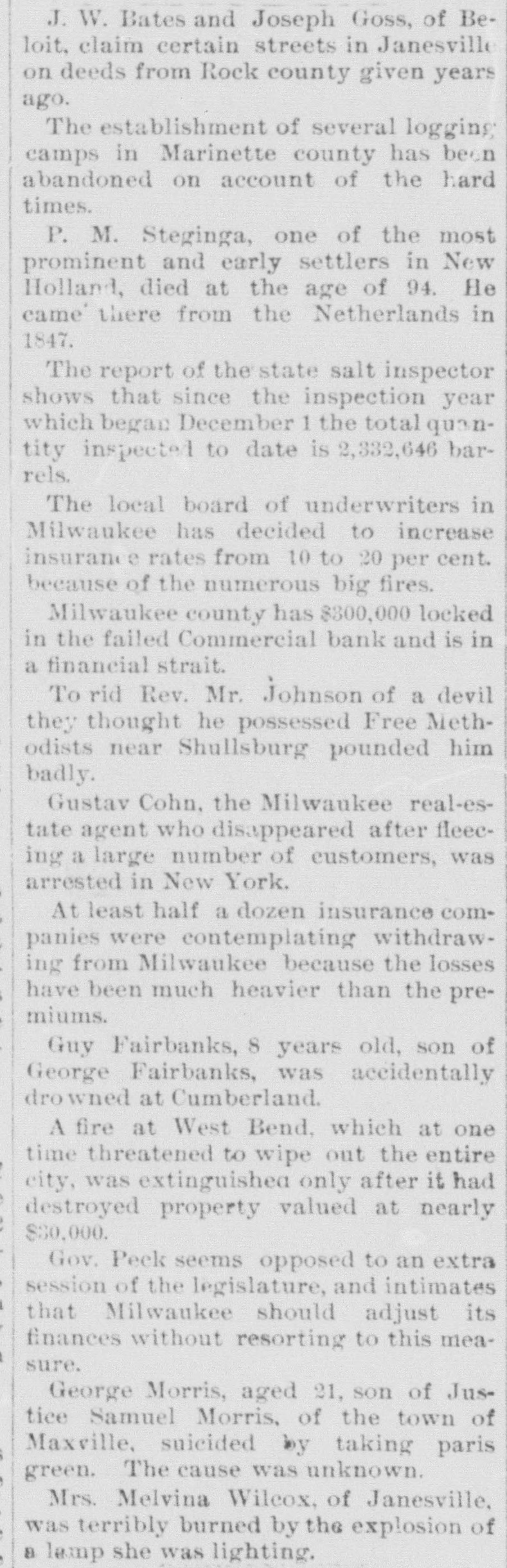 J. W. Bates and Joseph Goss, of Beloit, claim certain streets in Janesville on deeds from Rock county given years ago. The establishment of several logging camps in Marinette county has been abandoned on account of the hard times. P. M. Steginga, one of the most prominent and early settlers in New Holland, died at the age of 94. He came' there from the Netherlands in 1847. The report of the state salt inspector shows that since the inspection year which began December 1 the total quantity inspected to date is 2,332,646 barrels. The local board of underwriters in Milwaukee has decided to increase insuranc e rates from 10 to 20 per cent. because of the numerous big fires. Milwaukee county has $800,000 locked in the failed Commercial bank and is in a financial strait. To rid Rev. Mr. Johnson of a devil they thought he possessed Free Methodists near Shullsburg pounded him badly. Gustav Cohn, the Milwaukee real-estate agent who disappeared after fleecing a large number of customers, was arrested in New York. At least half a dozen insurance companies were contemplating withdrawing from Milwaukee because the losses have been much heavier than the premiums. Guy Fairbanks, 8 years old, son of George Fairbanks, was accidentally drowned at Cumberland. A fire at West Bend, which at one time threatened to wipe out the entire city, was extinguishea only after it had destroyed property valued at nearly $30,000. Gov. Peck seems opposed to an extra session of the legislature, and intimates that Milwaukee should adjust its finances without resorting to this measure. George Morris, aged 21, son of Justice Samuel Morris, of the town of Maxville, suicided by taking paris green. The cause was unknown. Mrs. Melvina Wilcox, of Janesville, was terribly burned by the explosion of a lamp she was lighting.