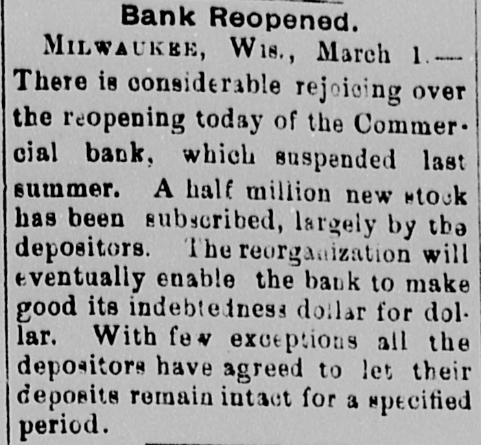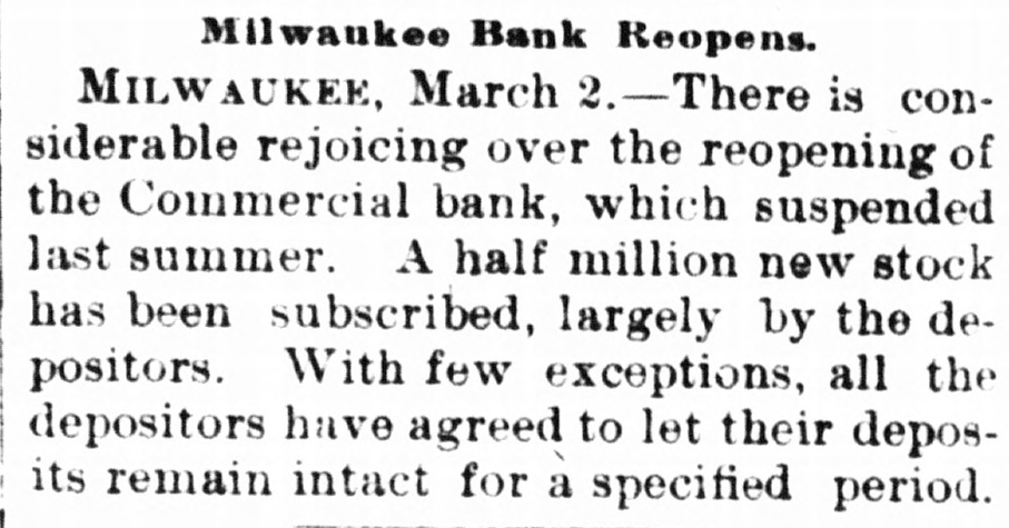Milwaukee Bank Reopens. MILWAUKEE, March 2.-There is considerable rejoicing over the reopening of the Commercial bank, which suspended last summer. A half million new stock has been subscribed, largely by the depositors. With few exceptions, all the depositors have agreed to let their deposits remain intact for a specified period.