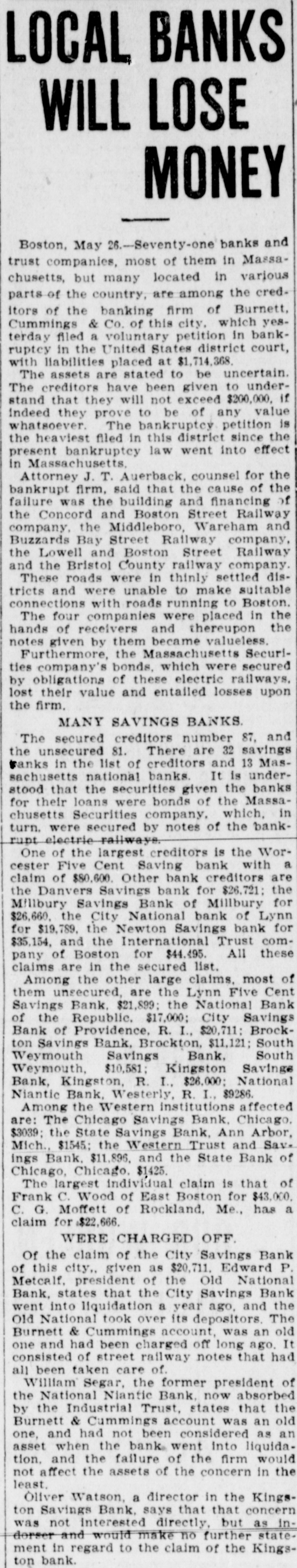LOCAL BANKS WILL LOSE MONEY Boston, May 26.-Seventy-one banks and trust companies, most of them in Massachusetts, but many located in various parts of the country, are among the creditors of the banking firm of Burnett, Cummings & Co. of this city, which yesterday filed a voluntary petition in bankruptcy in the United States district court, with liabilities placed at $1,714,368. The assets are stated to be uncertain. The creditors have been given to understand that they will not exceed $200,000. if indeed they prove to be of any value whatsoever. The bankruptcy petition is the heaviest filed in this district since the present bankruptcy law went into effect in Massachusetts. Attorney J. T. Auerback, counsel for the bankrupt firm, said that the cause of the failure was the building and financing of the Concord and Boston Street Railway company, the Middleboro, Wareham and Buzzards Bay Street Railway company, the Lowell and Boston Street Railway and the Bristol County railway company. These roads were in thinly settled districts and were unable to make suitable connections with roads running to Boston. The four companies were placed in the hands of receivers and thereupon the notes given by them became valueless. Furthermore, the Massachusetts Securities company's bonds, which were secured by obligations of these electric railways. lost their value and entailed losses upon the firm. MANY SAVINGS BANKS. The secured creditors number 87, and the unsecured 81. There are 32 savings wanks in the list of creditors and 13 Massachusetts national banks. It is understood that the securities given the banks for their loans were bonds of the Massachusetts Securities company. which, in turn. were secured by notes of the bankrupt electric railways. One of the largest creditors is the Worcester Five Cent Saving bank with a claim of $80,600. Other bank creditors are the Danvers Savings bank for $26,721: the Millbury Savings Bank of Millbury for $26,660. the City National bank of Lynn for $19,789. the Newton Savings bank for $35,154. and the International Trust company of Boston for $44.495. All these claims are in the secured list. Among the other large claims, most of them unsecured, are the Lynn Five Cent Savings Bank, $21,899; the National Bank of the Republic. $17,000; City Savings Bank of Providence, R. I., $20,711: Brockton Savings Bank, Brockton, $11,121; South Weymouth Savings Bank, South Weymouth, $10,581; Kingston Savings Bank, Kingston, R. I., $26,000; National Niantic Bank, Westerly, R. I., $9286. Among the Western institutions affected are: The Chicago Savings Bank, Chicago, $3039; the State Savings Bank, Ann Arbor, Mich., $1545; the Western Trust and Savings Bank. $11,896. and the State Bank of Chicago, Chicago, $1425. The largest individual claim is that of Frank C. Wood of East Boston for $43,000. C. G. Moffett of Rockland, Me., has a claim for $22,666. WERE CHARGED OFF. Of the claim of the City Savings Bank of this city,, given as $20,711. Edward P. Metcalf, president of the Old National Bank, states that the City Savings Bank went into liquidation a year ago, and the Old National took over its depositors. The Burnett & Cummings account, was an old one and had been charged off long ago. It consisted of street railway notes that had all been taken care of. William Segar, the former president of the National Niantic Bank, now absorbed by the Industrial Trust. states that the