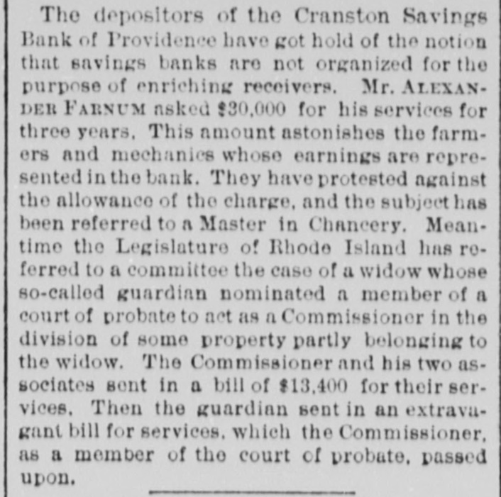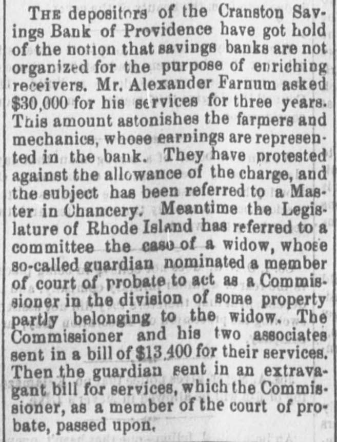 SETTLING THE SPRAGUE ESTATE. The Largest Creditors Moving to Secure the Removal of the Trustee. Early this week Messrs. Metcalf & Pomroy of Providence addressed a letter to Mr. Zachariah Chaffee, trustee of the A. and W. Sprague estates, asking him if he would agree to the terms of any paper which all the creditors of the Spragues might sign. Mr. Chaffee promptly replied in the affirmative, whereupon the same gentlemen addressed to him another letter inquiring if he would equally agree to any petition signed by three-fourths of the creditors, and Mr. Chaffee again responded that he would acquiesce in the terms of any petition so signed. One of the gentlemen who addressed these letters to Mr. Chaffee, Mr. Metcalf. is a member of a committee appointed by certain of the Sprague creditors a year ago, and which at the time brought suit against Mr. Chaffee in Rhode Island to put him out of the trusteeship. The Committee consists of Messrs. Aldrich. Metc lf. Weeden. and Farnum. and in the suit brought by them they swore that they represented $4,000,000 of the Sprague paper. Mr. Farnum is the receiver of the Franklin Institution for Savings, in Providence, which holds $700.000 of these notes. Messrs. Metcalf and Aldrich are directors in the Second National Bank of Providence, which is another institution holding the Spragues' paper to a large amount. The First National, the Globe. and the Cranston Savings Bank, the latter in the hands of a receiver. make. with the others mentioned, five banks in Providence which together hold $3,500,000 of the Spragues' extension paper or old trustee notes. These, at least, will sign the paper asking for the removal of Mr. Chaffee. the idea being. probably, to pool the whole property and then to fight all suits outside. Such as join in the movement will sign an agreement to unite in a corporation for the purpose of obtaining possession and control by purchase of the said property and its conversion and application to the liquidation of our debts. and to take stock in such corporation in proportion to our respective claims." the agreement to be binding when three-fourths of the creditors in amount shall havesigned thesame. The total liabilities of the Spragues are $8,000,000. Of this. $5,000,000 is held by fifteen banks, and the rest is spread all over the country. from Maine to South Carolina.