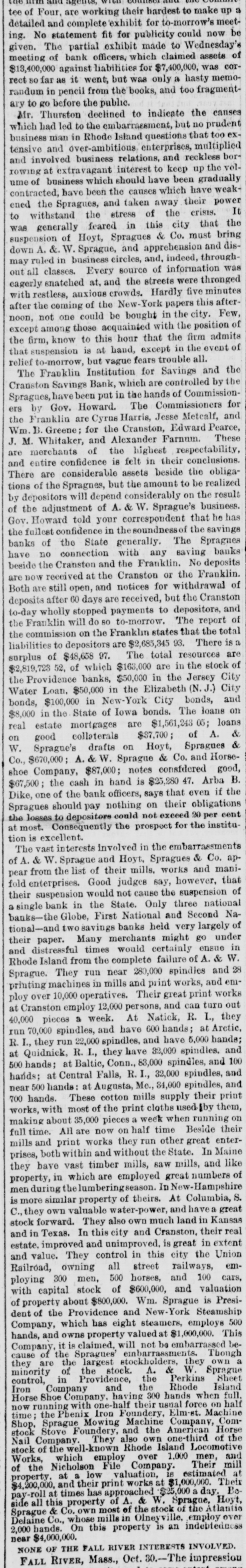 to of tee make their Four. for and detailed exhibit fit now No for could ing. publicity statement to The made given. exhibit partial Wednesday of assets bank claimed officers, meeting corwas for against $7,400,000, liabilities $13,400,000 a 80 was hasty it rect only far but memowent, too in and the from books, pencil fragmentrandom to ary go before public. the to causes Mr. indicato declined Thurston no but led the had which prudent embarrae too that in man Island business questions and Rhobitions tensive multiplied bor and and enterprisoredkless business the up volto at keep interest been have radually should which have weak which causes contracted, their the power ened It Spragues, to the stress the withstand in city this IOWING ume of business have been and the taken of away the crisis. that was feared generally & Co. bring must of Hoyt, Spragues suspension disand W. & and A. down apprehension and. indeed, ruled may throughbusiness was of all out source Every classes. the at. were and information eagerly streets five minutes Hardly with crowds. this of York afterthe Newthe after papers coming in the Few, be city. one not could bought noon, of the with position those except acquainted firm the to this admits that the hour firm, know of in the is event except hand, that all. trouble fears relief the to-morrow, for and The Savings Franklin by the are Bank, controlled Savings Cranston of in the hands have been put Commission Spragnes, for The by ers Gov. Howard. and Commission Jesse the are Metcalf, Harris, Cyrus Franklin the B. Pearce, for Wm. Edward Greene; Cranston, J. M. These and Farnum. Whitaker, Alexander of the ability, are highest in felt their and conclusions. the obligabeside are There of but the realized tions Spragnes, will depend of W. entire morehammedence consideral is assets amount to on be the result business. Sprague's he has that savings the fullest of State of Gov. Howard confidence in generally. by the depositors adjustment told your Coundnessof correspondent The the Spragnes saving banks No deposits beside are now and still connection the with the Franklin. the Franklin. of are Both notices the but after have banks the no the and Cranston for or withdrawal Cranston received, and depositpholic to-day stopped depositors, of The will report do so the Franklin that the total on the to-morrow the Franklin is are There commission are The total resources of in the stock $2,819,723 City banks, Loan. bonds, liabilities surplus of to 52, $48,658 of which 97. $50,000 $163,000 Elizabeth in are the Jersey (N.J.) City and bonds. the Providence $50,00 New-York in the City The loans loans on real estate on collaterals Water $100,000 State in of Iowa are $1,561, 243 of 05; A. & & bonds, $8,000 in the mortgages $87,700; on Hoyt, Spragues Co. & and Horsegood, shoe Company, in the hand cash $67,500; Sprague's good drafts W. Sprague notes considered Arba B. of the one says that bank officers, Dike, Co., W. $670,000; $87,000; is $25,280 even if the on their pay should nothing obligations Spragues 20 cent per could exceed the losses the for the at institumost. prospect in the arrangments involved embarrassm & Co. ap& W. of A. Spragues of list manitheir say, judges the tion The is vast Sprague and Hoyt, mills. works however, and that of their suppension a national single the Globe, banks pear fold enterprises. from the would Good State. not Only three Second Na of banks go might suspension bank in the First National held and very largely under their paper. in ensue and times distressful the from Island Rhode complete run Many would failure of A. and & W. 28 near 280,000 They spindles Sprague. and emin and works, print mills printing works print Their great over 10,000 ploy operatives. out turo and can 12,000 persons, employ Cranston R. I., At they week. Natick, at 600 Arctic, hands; run 5,000 hands; run they 22,000 they have R.I., 83,000 500 spindles, hands; at 40,000 70,000 pieces spindles, and spindles, have and 32,000 have spindles. and and 100 and at Central spindles, at Me., Augusta, mills gupply at R. I., Quidnick at Baltic, Falls, Conn., R. I., 32,000 34,000 gpindles, their print and by them, most hands; near hands. 500 hands: These of cotton the print week clot when used Beside running their on mills both prises, 700 works, with about 35,000 now pieces: on half run time other great In Maine entervast mills, have they timber in great making full time. and print works and without they the saw State. mills, numbers and like of employed property, In Newduring Hampshire columbering.ru At is theirs. Columbia, property and have great C., in land Kansas and and men stock more they forward. Texas. own valuable In They and this unimproved. also city own and this Cranston. is city great the their in extent Union real emand estate. in improved They control in street railways, 100 cars. value owning all 500 horses, and valuation Presi300 stock Wm. Steamship about and employe own property of the which property has valued not be at $1,000,000. embarra Though ed beRailroad, of with ploying dent Company, capital owns men, $800,000. of will $600,000, steamers, New-Yor Sprague York is This 500 of the stock the hands, Company and the it is Spragnes claimed, A. Perkins W. they Sprague Sheet in Provider and having half their 300 usual hands Elm-st. force Machine on Comcause they control, minority are Company of largest the vidence, undery, the Rhode Company when Island full. half now Horse Iron Shoe with one- Iron Foundery Machine and the American And-third of Horse the Sprague Foundery, also own Island men, and stock known over Their time; Shop. Nail stock Company. of Stove the the which well They employ Rhode Company. 1.000 estimated Locomotive Their mill BoWorks, Nichols Evaluation. $1,000,000. day of the at their print approached works 25,000 : Sprague. tlantia Hoyt, Sprague Co., whose Delaine property. and has a the stock W. of employ the over On this hands. property this & property own mills most 
