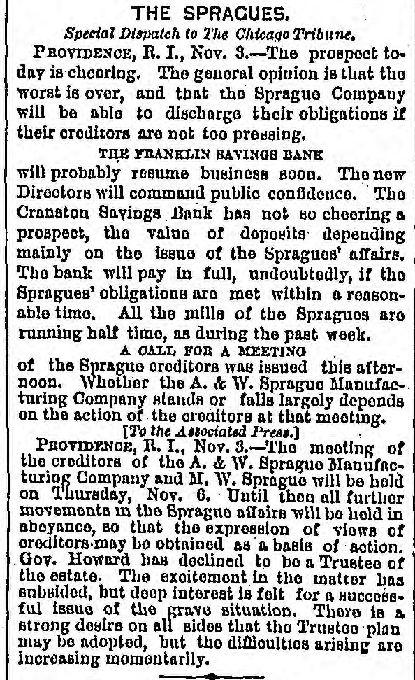 THE SPRAGUES. Special Dispatch to The Chicago Tribune. PROVIDENCE, R. I., Nov. 3.-The prospect today is cheering. The general opinion is that the worst is over, and that the Sprague Company will be able to discharge their obligations if their creditors are not too pressing. THE FRANKLIN SAVINGS BANK will probably resume business BOOD. The now Directors will command public confidence. The Cranston Savings Bank has not 80 cheering a prospect, the value of deposits depending mainly on the issue of the Spragues' affairs. The bank will pay in full, undoubtedly, if the Spragues' obligations are met within a reasonable time. All the mills of the Spragues are running half time, as during the past week. A CALL FOR A MEETING of the Sprague creditors WAS issued this afternoon. Whether the A. & W. Sprague Manufacturing Company stands or falls largely depends on the action of the creditors at that meeting. [To the Associated Press.) PROVIDENCE, R.I., Nov. 3.-The meeting of the croditors of the A. & W. Sprague Manufacturing Company and M. W. Sprague will be hold on Thursday, Nov. 6. Until then all further movements in the Spraguo affairs will be hold in aboyance, BO that the expression of views of creditors.ma be obtained as a basis of action. Gov. Howard has declined to be a Trueteo of the estate. The exoitement in the matter has subsided, but deep interest is felt for a successful issue of the grave situation. There is a strong desire on all sides that the Trusteo plan may be adopted, but the difficulties arising are increasing momentarily.