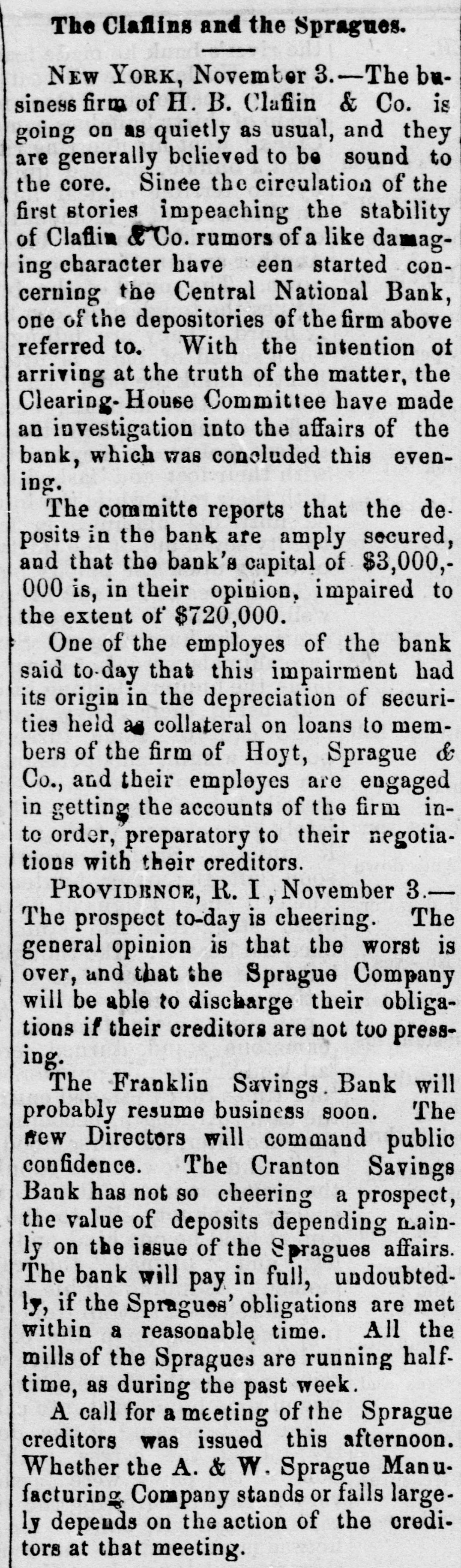 The Claflins and the Spragues. NEW YORK, November 3. -The business firm of H. B. Clafin & Co. is going on as quietly as usual, and they are generally believed to be sound to the core. Since the circulation of the first stories impeaching the stability of Claflin Co. rumors of a like damaging character have een started concerning the Central National Bank, one of the depositories of the firm above referred to. With the intention of arriving at the truth of the matter, the Clearing-House Committee have made an investigation into the affairs of the bank, which was concluded this evening. The committe reports that the de posits in the bank are amply secured, and that the bank's capital of $3,000,000 is, in their opinion, impaired to the extent of $720,000. One of the employes of the bank said to-day that this impairment had its origin in the depreciation of securities held as collateral on loans to members of the firm of Hoyt, Sprague & Co., and their employes are engaged in getting the accounts of the firm intc order, preparatory to their negotiations with their creditors. PROVIDENCE, R. I, November 3 The prospect to-day is cheering. The general opinion is that the worst is over, and that the Sprague Company will be able to discharge their obligations if their creditors are not too pressing. The Franklin Savings Bank will probably resume business soon. The new Directors will command public confidence. The Cranton Savings Bank has not so cheering a prospect, the value of deposits depending mainly on the issue of the Spragues affairs. The bank will pay in full, undoubtedly, if the Spragues' obligations are met within a reasonable time. All the mills of the Spragues are running halftime, as during the past week. A call for a meeting of the Sprague creditors was issued this afternoon. Whether the A. & W. Sprague Manufacturing Company stands or falls largely depends on the action of the creditors at that meeting.