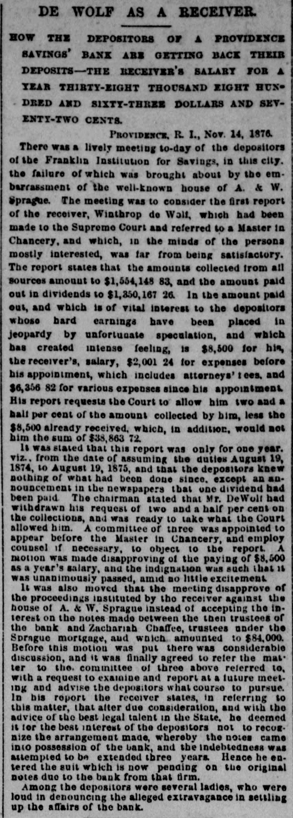 the receiver, Winthrop de Wolf, which had been made to the Supreme Court ... assuming the duties August 19, 1874 ... amounts collected from all sources amount to $1,554,148.83, and the amount paid out in dividends to $1,350,167.26 . . . the failure of which was brought about by the embarrassment of the well-known house of A. & W. Sprague . . . the report states that the amounts collected from all sources ... . (New York Herald, Nov. 14, 1876).