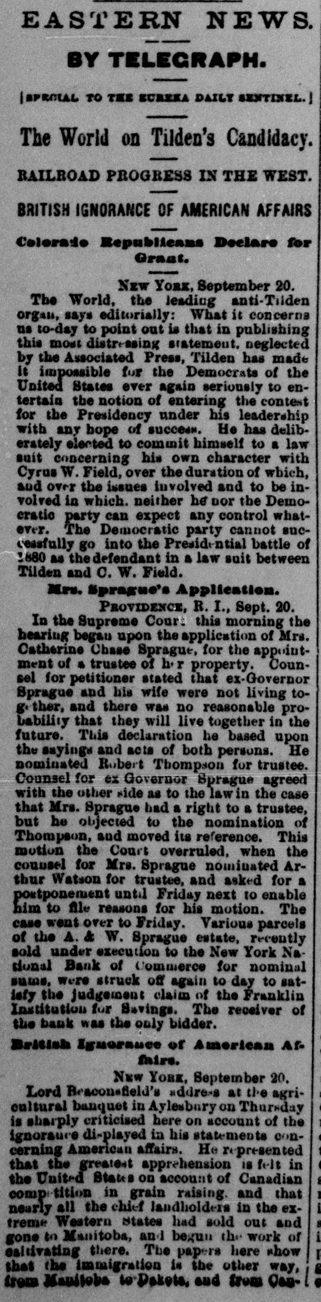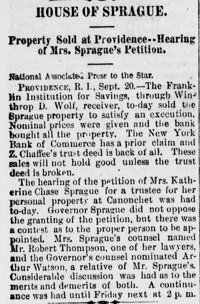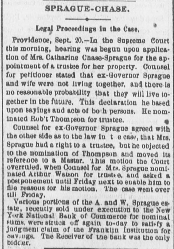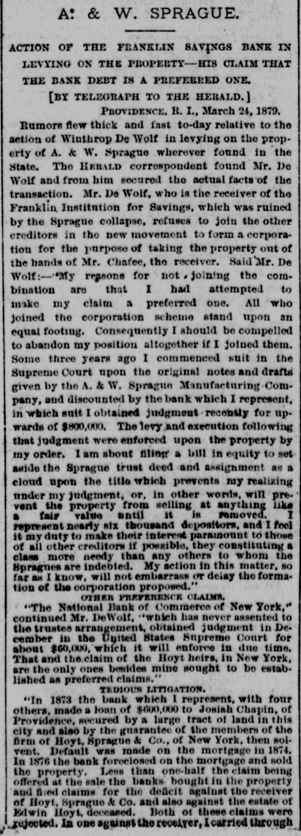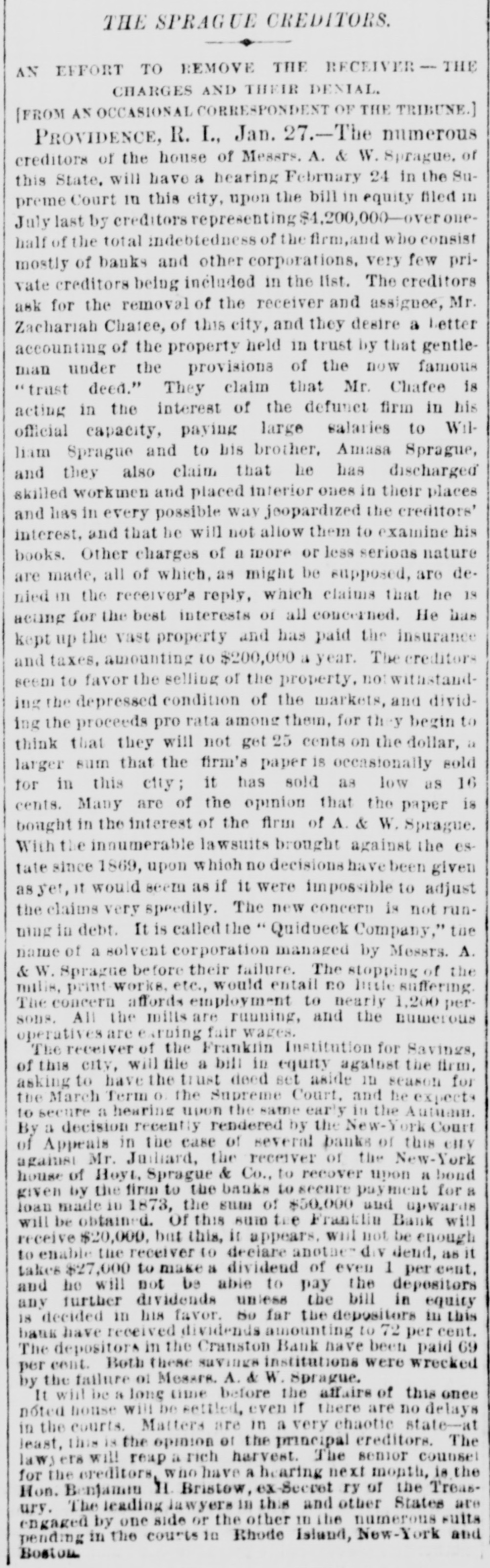 THE SPRAGUE CREDITORS. AN EFFORT TO REMOVE THE RECEIVER - THE CHARGES AND THEIR DENIAL. [FROM AN OCCASIONAL CORRESPONDENT OF THE TRIBUNE.] PROVIDENCE, R. I., Jan. 27.-The numerous creditors of the house of Messrs. A. & W. Sprague. of this State. will have a hearing February 24 in the Supreme Court in this city, upon the bill in equity filed in July last by creditors representing $4,200,000-overonehalf of the total indebtedness of the firm,and who consist mostly of banks and other corporations, very few private creditors being included in the list. The creditors ask for the removal of the receiver and assignee, Mr. Zachariah Chatee, of this city, and they desire a Letter accounting of the property held in trust by that gentleman under the provisions of the now famous "trust deed." They claim that Mr. Chafee is acting in the interest of the defunct firm in his official capacity, paying large salaries to William Sprague and to his brother, Amasa Sprague, and they also claim that he has discharged skilled workmen and placed interior ones in their places and has in every possible way joopardized the creditors' interest, and that be will not allow them to examine his books. Other charges of a more or less serious nature are made, all of which, as might be supposed, are denied in the receiver's reply, which claims that he 18 acung for the best interests of all concerned. He has kept up the vast property and has paid the insurance and taxes, amounting to $200,000 it year. The creditors seem to favor the selling of the property, no: withstanding the depressed condition of the markets, and dividing the proceeds pro rata among them, for they begin to think that they will not get 25 cents on the dollar, is larger sum that the firm's paper is occasionally sold for in this city; it has sold as low as 16 cents. Many are of the opinion that the paper is bought in the interest of the firm of A. & W. Sprague. With the insumerable lawsuits brought against the estate since 1869, upon which no decisions have been given as yet, it would seem as if it were impossible to adjust the claims very speedily. The new concern is not runtung in debt. It is called the 'Quidueck Company," tue name of a solvent corporation managed by Messrs. A. & W. Sprague before their failure. The stopping of the mills, print-works. etc., would entail no little suffering The concern affords employment to nearly 1,200 persons. All the mills are running, and the numerous operatives are earning fair wages. The receiver of the Franklin Institution for Savings, of this city, will file a bill in equity against the firm. asking to have the trust deed set aside in season for the March Term O the Supreme Court. and he expects to secure a hearing upon the same early in the Authum. By a decision recently rendered by the New-York Court of Appeals in the case of several banks of this CITY against Mr. Judhard, the receiver of the New-York house of Hoyt, Sprague & Co., to recover upon a bond given by the firm to the banks to secure payment for a loan made in 1873, the sum of $50,000 and upwards will be obtained. Of this 8010 the Franklin Bank will receive $20,000. but this, it appears. will not be enough to enable the receiver to declare anothere div dend, as it takes $27,000 to make a dividend of even 1 per cent. and he will not be able to pay the depositors any further dividends unless the bill in equity 18 decided in his favor. So far the depositors in this bank have received dividends amounting to 72 per cent. The depositors in the Cranston Bank have been paid 69 per cent. Both these savings institutions were wrecked by the failure of Messre. A. & W. Sprague. It will be it long time before the affairs of this once noted house will be settled. even if there are no delays in the courts. Matters are in a very chaotic state-at least, this is the opinion of the principal creditors. The laws era will reap a rich harvest. The senior counsel for the creditors, who have a hearing next month, is the Hon. Benjamin H Bristow, k-Secret ry of the Treasury. The leading lawyers in this and other States are engaged by one side or the other ID the numerous suits pending in the counts 10 Rhode Island, New-York and Boston