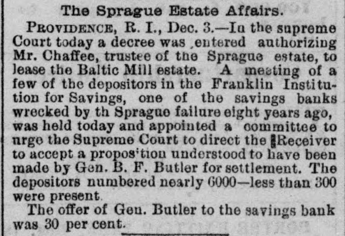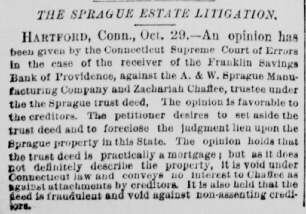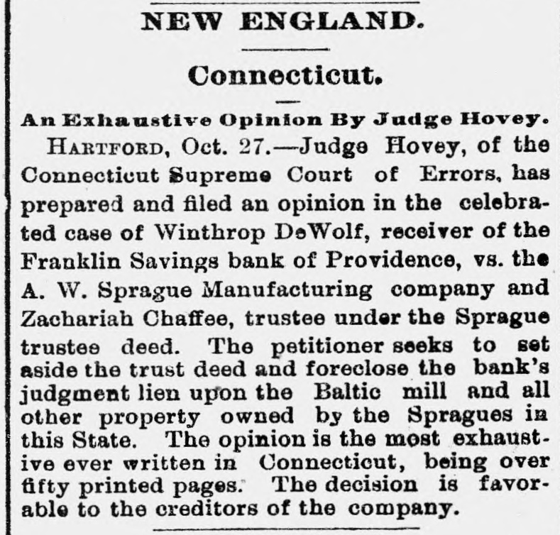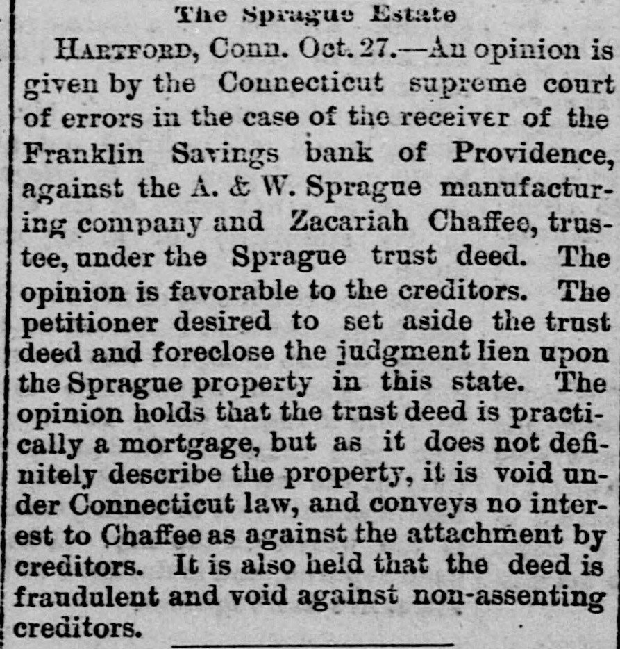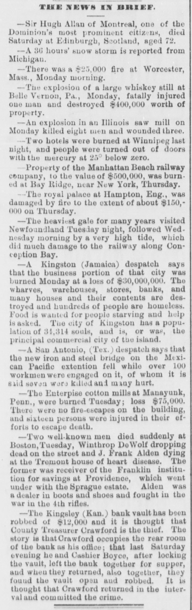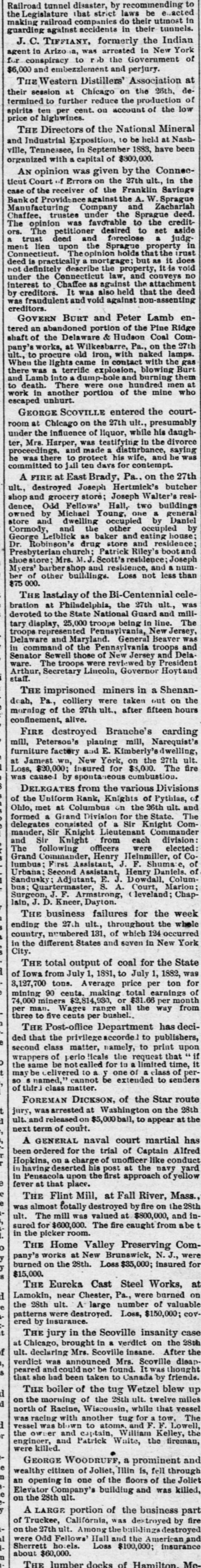 Railroad tunnel disaster, by recommending to the Legislature that strict laws be emacted making railroad companies do their utmost in guarding against accidents in their tunnels. J. C. TIFFIANY, formerly the Indian agent in Arizo a. was arreated in New York for conspiracy to rob the Government of $6,000 and embezzlement and perjury. THE Western Distillers' Association at their session at Chicago on the 26th, determined to further reduce the production of spirits ten per cent. on account of the low price of highwines. THE Directors of the National Mineral and Industrial Exposition, 10 be held at Nashville, Tennessee, in September 1883, have been organized with a capital of $300,000 AN opinion was given by the Connecticut Court of Errors on the 27th ult.. in the case of the receiver of the Franklin Savings Bank of Providence against the A. W. Sprague Manufacturing Company and Zachariah Chaffee, trustee under the Sprague deed The opinion was favorable to the credit ors. The petitioner desired to set aside judga trust deed and foreclose in ment lien upon the Sprague property Connecticut Theopinion holds that the irust deed is practically mortgage; but as it does not definitely describe the property, it is void under the Connecticut law, and conveys no interest to Chaffee as against the attachment by creditors. It was also held that the deed was fraudulent and void against non-assenting creditors. GOVERN BURT and Peter Lamb entered an abandoned portion of the Pine Ridge shaft of the Delaware & Hudson Coal Company's works, at Wilkesbarre, Pa., on the 27th ult., to procure old iron, with naked lamps. When the lights came in contact with the gas there was terrific explosion, blowing Burt and Lamb into dump-bole and burning them to death. There were one hundred men at work in another portion of the mine who escaped unhurt. GEORGE SCOVILLE entered the courtroom at Chicago on the 27th ult., presumably under the influence of liquor, while his daughter, Mrs. Harper, was testifying in the divorce proceedings, and made disturbance, saying he was there protect his wife, and he was committed to jull ten days for contempt. A FIRE at East Brady, Pa.. on the 27th ult., destroyed Joseph Hertmick's butcher shop and grocery store; Joseph Walter's residence, Odd Fellows' Hall, two buildings owned by Michael Young, one general store and dwelling occupied by Daniel Cormody and the other occupied by George Leiblick as baker and eating house Dr. Robinson's drug store and residence Presbyterian church; Patrick Riley' boot and shoe store: Mrs. M.J. Scott's residence: Josepi Myers' barbershop and residence, and num ber of other buildings. Loss not less than $75 000. THE last.day of the Bi-Centennial celebration at Philadelphia, the 27th ult., was devoted to the State National Guard and military display, 25,000 troops being in line. The troops represented Pennsylvania, New Jersey Delaware and Maryland. General Beaver was in command of the Pennsylvania troops and Senator Sewell those of New Jersey and Dela ware. The troops were ewed by President Arthur, Secretary Lineoln, Governor Hoytand staff. THE imprisoned miners in a Shenandeah, Pa., colliery were taken out on the morning of the 27th ult., after fifteen hours confinement, alive. FIRE destroyed Branche's carding mill, Peterson's planing mill, Narequist's furniture factory and E. Kimberly dwelling, at Jamest wo, New York, on the 27th ult Loss, $20,000; insured for $3,000. The fire was caused by spontaneous combustion. DELEGATES from the various Divisions of the Uniform Rank, Knights of Pythias, of Ohio, met at Columbus on the 26th ult. and formed a Grand Division for the State The delegates consisted of a Sir Knight Commander, Sir Knight Lieutenant Commander and Sir Knight from each division The following officers were elected Grand Commander Henry Heinmiller. of Co lumbus: First Assistant, J F. Shumare, of Urbana; Second Assistant, Henry Daniels of Sandusky: Adjutant, E. J. Dowdall Colum bus; Quartermaster, S. A. Court, Marion Surgeon, J.F. Armstrong, leveland; Chap lain, J. D. Kneer, Dayton. THE business failures for the week ending the 27.h ult., throughout the whole country, numbered 131, of which 124 occurred in the different States and seven in New York City. THE total output of coal for the State of Iowa from July 1, 1881, to July 1, 1882. was 3,127,700 tons. Average price per ton for mining 90 cents. making total earnings of 74,000 miners $2,814,930, or $31.60 per month per man. Wages range all the way from three to five cents per bushel. THE Post-office Department has decided that the privilege accorde. to publishers, second class matter, namely, to print upon wrappers of perio !icals the request that if o the same be not called for limited time, it may be celivered to a one of class pernamed, cannot be extended to senders of third class matter. FOREMAN DICKSON, of the Star route jury, was arrested at Washington on the 28th t ult. and released on $5,000 bail, to appear at the a next term of court. A GENERAL naval court martial has been ordered for the trial of Captain Alfred Hopkins, on charge of unofficer like conduct in having deserted his post at the navy yard in Pensacola upon the first approach of yellow e fever at that place. THE Flint Mill, at Fall River, Mass. was almost totally destroyed by fire on the 28th ult. The mill was valued at $800,000, and insured for $600,000. The fire caught from abe t in the picker room. THE Home Valley Preserving Com pany's works at New Brunswick, N. J., were burned on the 28th. Loss $35,000; insured for $15,000. at THE Eureka Cast Steel Works, Lamokin, near Chester, Pa. were burned on d the 28th ult. A large number of valuable patterns were destroyed. Loss, $150,000; COV ered by insurance. THE jury in the Scoville insanity case at Chicago, brought in a verdict on the 28th of ult. declaring Mrs. Scoville insane. After the verdict was announced Mrs. Scoville dieap peared and could no be found. It was thought that she had
