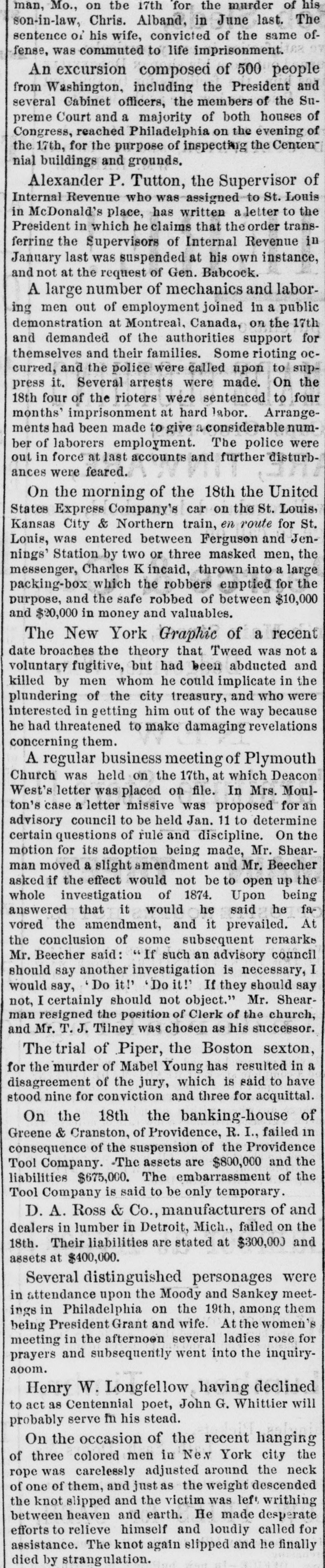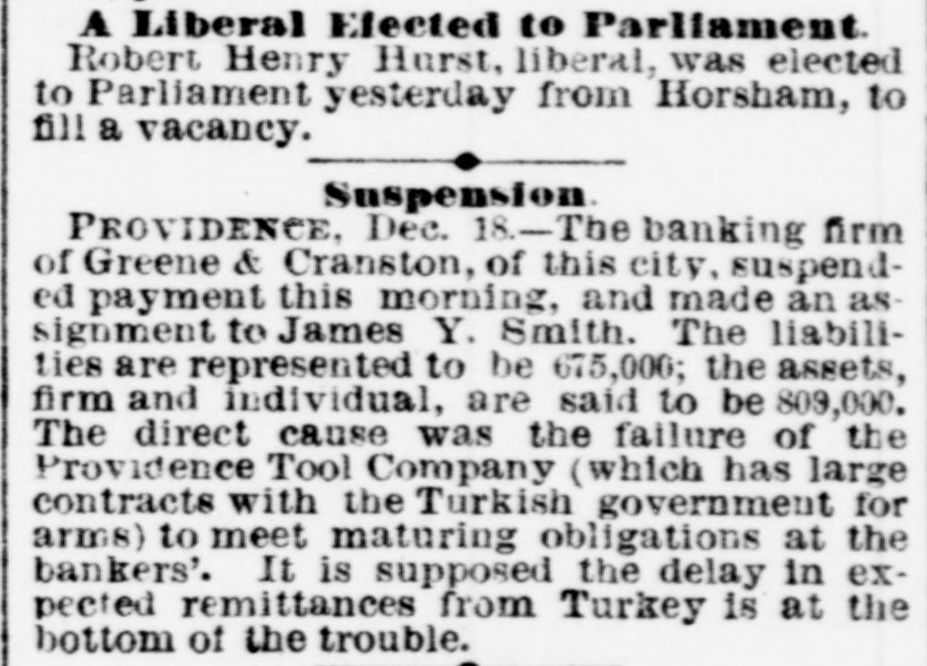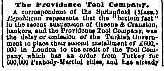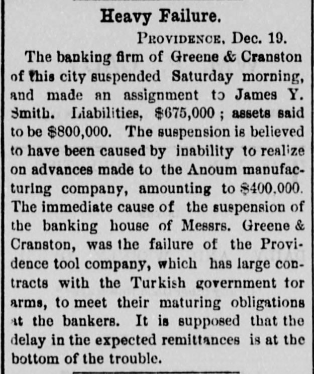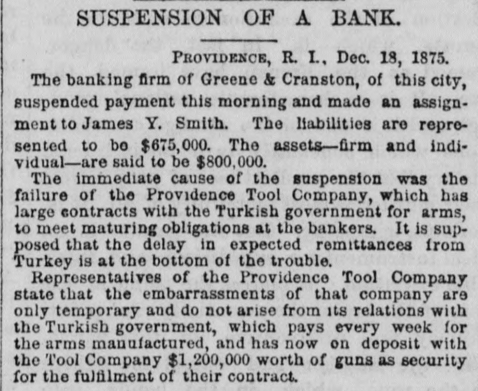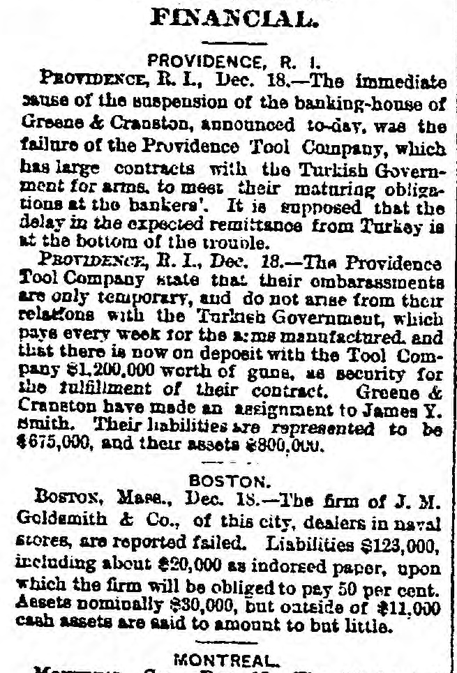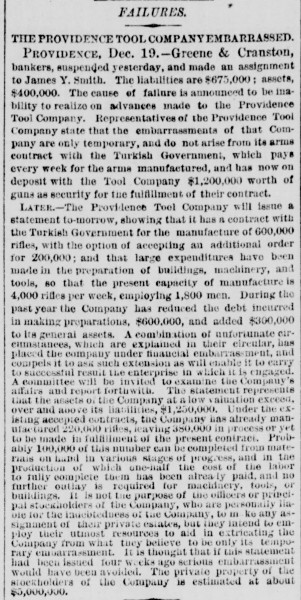 FAILURES. THE PROVIDENCE TOOL COMPANY EMBARRASSED. PROVIDENCE, Dec. 19.-Greene & Cranston, bankers, suspended yesterday, and made an assignment to James Y. Smith. The liabilities are $675,000; assets, $400,000. The cause of failure is announced to be inability to realize on advances made to the Providence Tool Company. Representatives of the Providence Tool Company state that the embarrassments of that Company are only temporary, and do not arise from its arms contract with the Turkish Government, which pays every week for the arms manufactured, and has now on deposit with the Tool Company $1,200,000 worth of guns as security for the fulfillment of their contract. LATER.-The Providence Tool Company will issue a statement to-morrow, showing that it has a contract with the Torkish Government for the manufacture of 600,000 rifles, with the option of accepting an additional order for 200,000; and that large expenditures have been made in the preparation of buildings, machinery, and tools, so that the present capacity of manufacture is 4,000 rifles per week, employing 1,800 men. During the past year the Company has reduced the debt incurred in making preparations, $600,000, and added $300,000 to Its general assets. A combination of unfortunate circumstances, which are explained in their circular, has placed the company under financial embarrassment, and compels it to ask such extension as will enable it to carry to successful result the enterprise in which it is engaged. A committee will be invited to examine the Company's affairs and report forthwith. The statement represents that the assets or the Company at a low valuation exceed, over and above its liabilities, $1,250,000. Under the existing accepted contracts, the Company has already manufactured 220,000 rifles, leaving 380,000 in process or yet to be made in fulfillment of the present contract. Probably 100,000 of this number can be completed from materials on hand in various stages of progress, and in the production of which one-half the cost of the labor to fully complete them has been alrea paid, and no further outlay is required for machinery, tools, or buildings. It is not the purpose of the officers or principal stockholders of the Company, who are personally liaDie for the indebtedness of the Company, to in ke any assignment of their private estates, but they intend to employ their utmost resources to aid in extricating the Company from what they believe to be only its temporary embarrassment. It is thought that if this statement had been issued four weeks ago serious embarrassment would have been avoided. The private property of the stockholders of the Company is estimated at about $5,000,000.