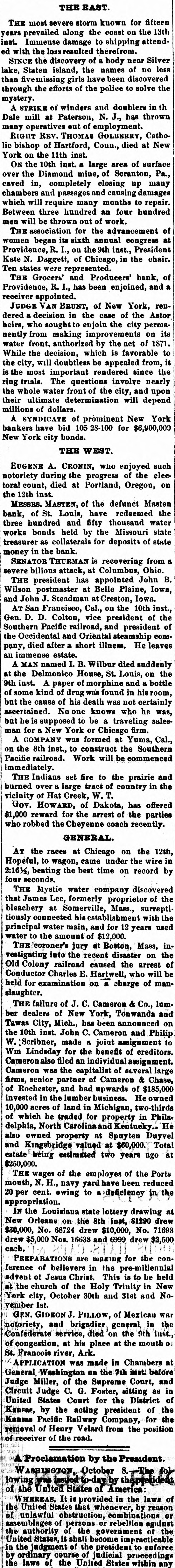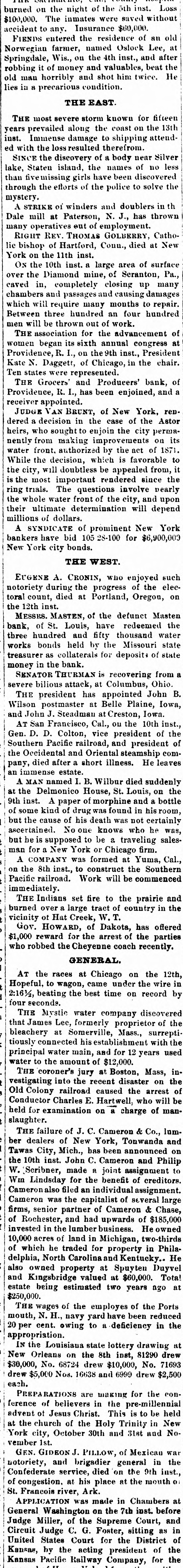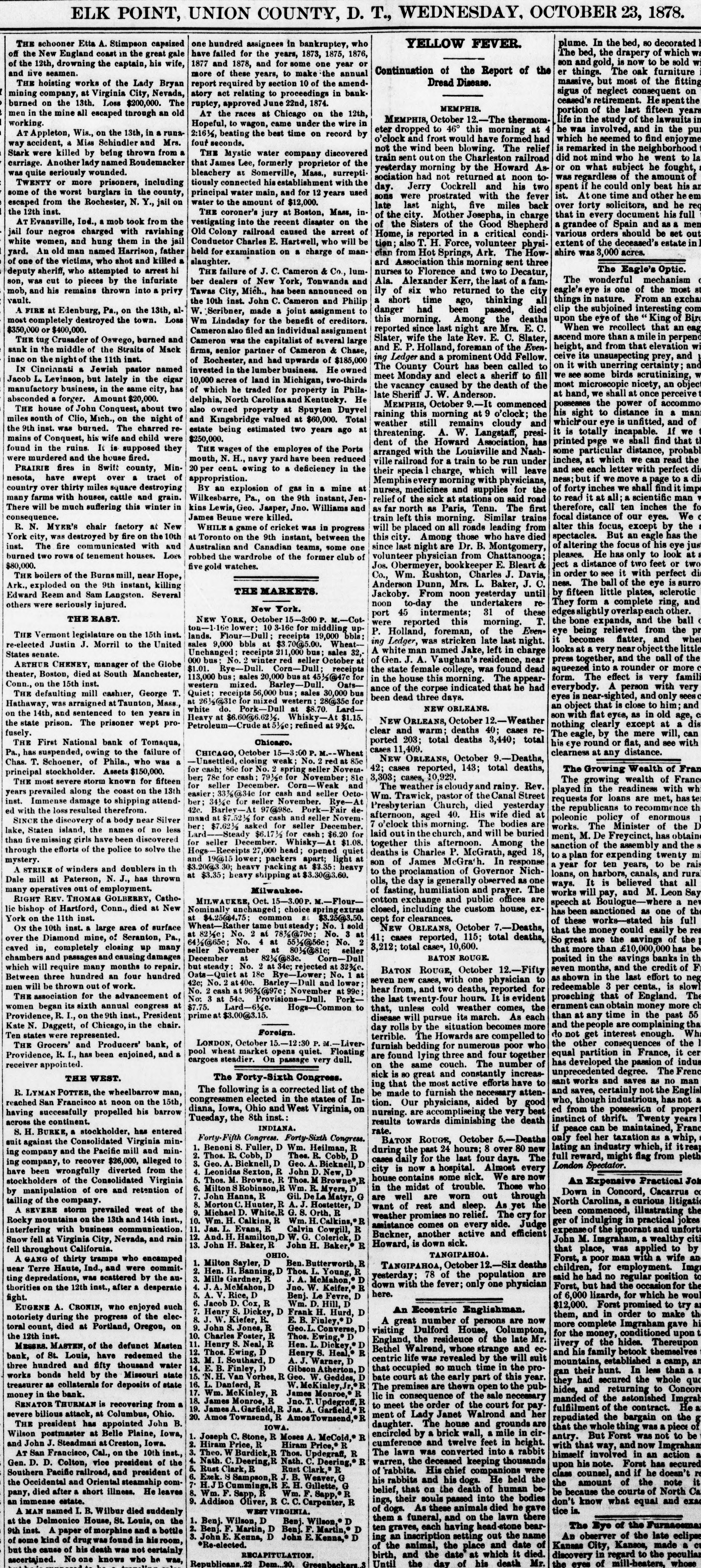 ELK POINT, UNION COUNTY, D. T., WEDNESDAY, OCTOBER 23, 1878. plume. In the bed, so decorate YELLOW FEVER THE schooner Etta A. Stimpson capsized one hundred assignees in bankruptcy, who The bed, the drapery of which have failed for the years, 1873, 1875, 1876, off the New England coast in the great gale son and gold, is now to be sold 1877 and 1878, and for some one year or of the 12th, drowning the captain, his wife, Continuation of the Report of the er things. The oak furnitur and live seamen. more of these years, to make the annual massive, but most of the fitt Dread Disease. report required by section 10 of the amendTHE hoisting works of the Lady Bryan sigus of neglect consequent mining company, at Virginia City, Nevada, atory act relating to proceedings in bank ceased's retirement. Hespent burned on the 13th. Loss $200,000. The ruptcy, approved June 22nd, 1874. MEMPHIS. portion of the last fifteen AT the races at Chicago on the 12th, men in the mine all escaped through an old MEMPHIS, October -The thermomlife in the study of the lawsuits working. Hopeful, to wagon, came under the wire in he was involved, and in the eter dropped to 46° this morning at AT Appleton, Wis., on the 13th, in runa2:16 1/2, beating the best time on record by which he seemed to find o'clock and frost would have formed had seconds. way accident, Miss Schindler and Mrs. is remarked in the neighbork not the wind been blowing. The relief Stark were killed by being thrown from THE Mystic water company discovered did not mind who he went to train sent out on the Charleston railroad carriage. Another lady named Roudemacker that James Lee, formerly proprietor of the or on what subject he fough yesterday morning by the Howard As was quite seriously wounded. bleachery at Somerville, Mass., surrepti was regardless of the amount sociation had not returned at noon to tiously connected establishment with the TWENTY or more prisoners, including spent if he could only beat his day. Jerry Cockrell and his two some of the worst burglars in the county, principal water main, and for 12 years used ist. Atone time and other he sons were prostrated with the fever water to the amount of $12,000. escaped from the Rochester, N. Y., jail on late last night, five miles back over forty solicitors, and he the 12th inst. THE coroner's jury at Boston, Mass, in that in every document his ful of the city. Mother Josepha, in charge AT Evansville, Ind., a mob took the vestigating into the recent disaster on the grandee of Spain and the Sisters of the Good Shepherd Old Colony railroad caused the arrest of jail four negros charged with ravishing various orders should be Home, is reported in a critical condi Conductor Charles E. Hartwell, who be white women, and hung them in the jail extent of the deceased' estate tion; also T. H Force, volunteer physiyard. An old man named Harrison, father shire was 3,000 acres. held for examination on a charge of mancian from Hot Springs, Ark. The How of one of the victims, who shot and killed slaughter. ard Association this morning sent three The Eagle's Optic. THE failure of J. C. Cameron & Co., lumdeputy sheriff, who attempted to arrest hi nurses to Florence and two Decatur, The wonderful mechanism Ala Alexander Kerr, the last of a famson, was cut to pieces by the infuriate ber dealers of New York, Tonwanda and eagle's eye is one of the most ily of six who returned to the mob, and his remains thrown into a privy Tawas City, Mich., has been announced on things in nature. From an excl vault short time ago, thinking the 10th inst. John C. Cameron and Philip clip the subjoined interesting danger had been passed, died A FIRE at Edenburg, Pa. on the 13th, al W. Scribner, made a joint assignment to upon the eye of the King this morning. Among the deaths most completely destroyed the town. Loss Wm Lindsday for the benefit of creditors. When we recollect that an reported since last night are Mrs. E. C. $350,000 or $400,000. Cameronals filed an individual assignment Slater, wife the late Rev. E. C. Slater, ascend more than mile in perpe THE tug Crusader of Oswego, barned and Cameron was the capitalist of several large height, and from that elevation and E. P. Holland, foreman of the Even sank in the middle of the Straits of Mack firms, senior partner of Cameron & Chase, ceive its unsuspecting prey, and ing Ledger and a prominent Odd Fellow inac on the night of the 11th inst. of Rochester, and had upwards of $185,000 on with unerring certainty; The County Court has been called to IN Cincianati a Jewish pastor named invested in the lumber business. owned we some birds scrutinizing, meet Monday and elect a sheriff to fill Jacob L. Levinson, but lately in the cigar 10,000 acres of land in Michigan, two-thirds the vacancy caused by the death of the most microscopic nicety, an ob manufactory business, in the same city, has of which he traded for property in Philaat hand, we shall at once perceiv late Sheriff J. W. Anderson absconded a forger. Amount $20,000. delphia, North Carolina and Kentucky. He the power of accome MEMPHIS, October 9.-It commenced THE house of John Conquest, about two also owned property at Spuyten Duyvel his sight to distance in raining this morning at 9 o'clock; the miles south of Clio, Mich. on the night of and Kingsbridge valued at $60,000. Total eye is unfitted, weather still remains cloudy and the 9th inst. was burned. The charred estate being estimated two years ago at it totally incapable. If threatening A. W. Langstaff, presimains of Conquest, his wife and child were $250,000. dent of the Howard Association, has printed page we shall find that found in the ruins. It is supposed they THE wages of the employes of the Ports some particular distance, proba arranged with the Louisville and Nashwere murdered and the house fired. mouth, N. H., navy yard have been reduced inches, at which we can read t ville railroad for a train to be run under and each letter with perfect PRAIRIE fires in Switt county, 