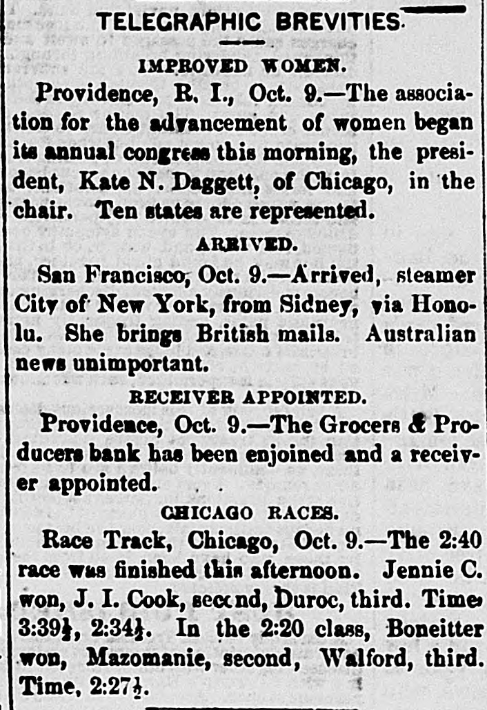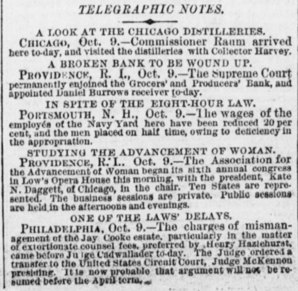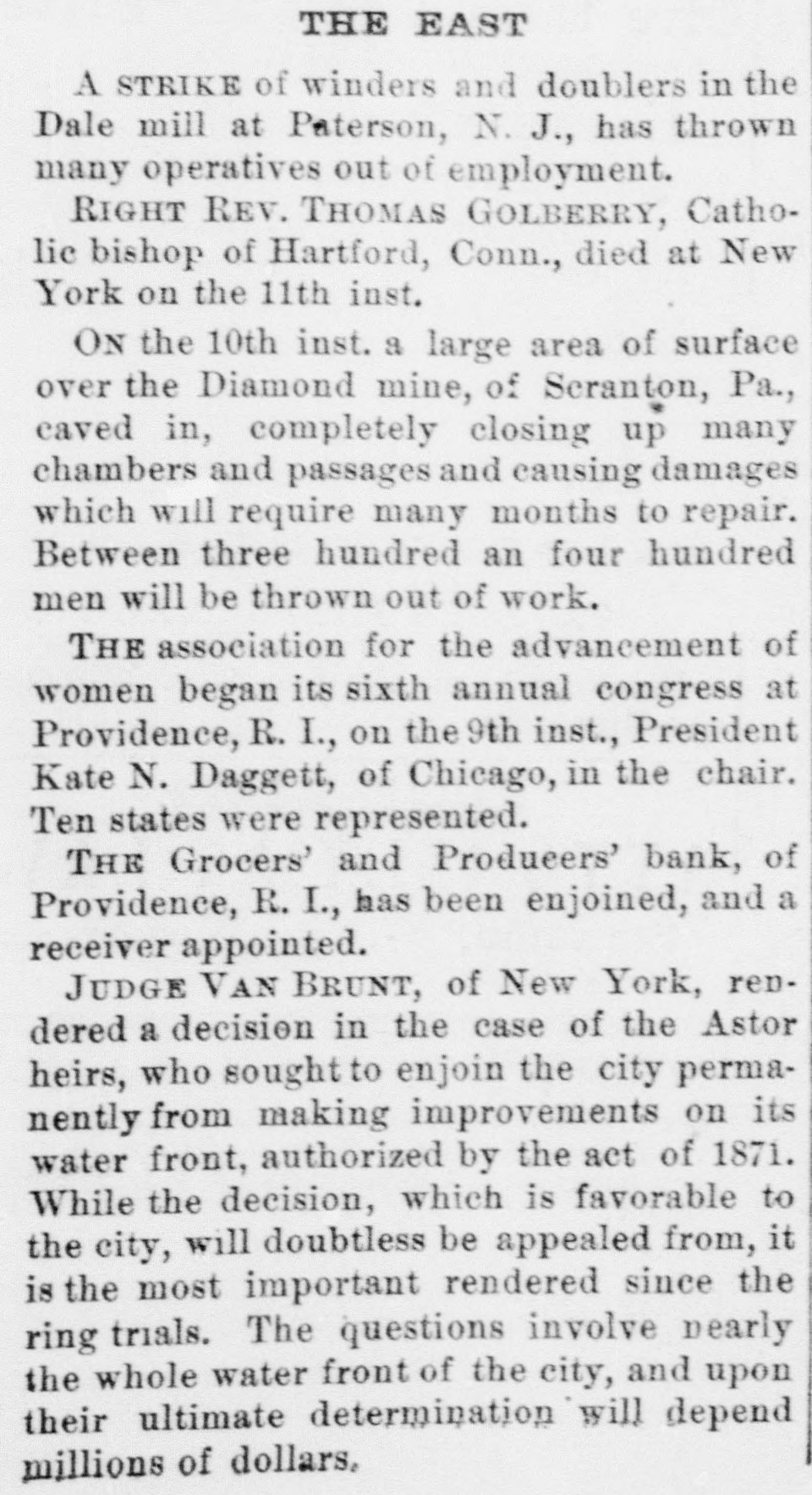 ELK POINT, UNION COUNTY, D. T., WEDNESDAY, OCTOBER 23, 1878. plume. In the bed, so decorate YELLOW FEVER THE schooner Etta A. Stimpson capsized one hundred assignees in bankruptcy, who The bed, the drapery of which have failed for the years, 1873, 1875, 1876, off the New England coast in the great gale son and gold, is now to be sold 1877 and 1878, and for some one year or of the 12th, drowning the captain, his wife, Continuation of the Report of the er things. The oak furnitur and live seamen. more of these years, to make the annual massive, but most of the fitt Dread Disease. report required by section 10 of the amendTHE hoisting works of the Lady Bryan sigus of neglect consequent mining company, at Virginia City, Nevada, atory act relating to proceedings in bank ceased's retirement. Hespent burned on the 13th. Loss $200,000. The ruptcy, approved June 22nd, 1874. MEMPHIS. portion of the last fifteen AT the races at Chicago on the 12th, men in the mine all escaped through an old MEMPHIS, October -The thermomlife in the study of the lawsuits working. Hopeful, to wagon, came under the wire in he was involved, and in the eter dropped to 46° this morning at AT Appleton, Wis., on the 13th, in runa2:16 1/2, beating the best time on record by which he seemed to find o'clock and frost would have formed had seconds. way accident, Miss Schindler and Mrs. is remarked in the neighbork not the wind been blowing. The relief Stark were killed by being thrown from THE Mystic water company discovered did not mind who he went to train sent out on the Charleston railroad carriage. Another lady named Roudemacker that James Lee, formerly proprietor of the or on what subject he fough yesterday morning by the Howard As was quite seriously wounded. bleachery at Somerville, Mass., surrepti was regardless of the amount sociation had not returned at noon to tiously connected establishment with the TWENTY or more prisoners, including spent if he could only beat his day. Jerry Cockrell and his two some of the worst burglars in the county, principal water main, and for 12 years used ist. Atone time and other he sons were prostrated with the fever water to the amount of $12,000. escaped from the Rochester, N. Y., jail on late last night, five miles back over forty solicitors, and he the 12th inst. THE coroner's jury at Boston, Mass, in that in every document his ful of the city. Mother Josepha, in charge AT Evansville, Ind., a mob took the vestigating into the recent disaster on the grandee of Spain and the Sisters of the Good Shepherd Old Colony railroad caused the arrest of jail four negros charged with ravishing various orders should be Home, is reported in a critical condi Conductor Charles E. Hartwell, who be white women, and hung them in the jail extent of the deceased' estate tion; also T. H Force, volunteer physiyard. An old man named Harrison, father shire was 3,000 acres. held for examination on a charge of mancian from Hot Springs, Ark. The How of one of the victims, who shot and killed slaughter. ard Association this morning sent three The Eagle's Optic. THE failure of J. C. Cameron & Co., lumdeputy sheriff, who attempted to arrest hi nurses to Florence and two Decatur, The wonderful mechanism Ala Alexander Kerr, the last of a famson, was cut to pieces by the infuriate ber dealers of New York, Tonwanda and eagle's eye is one of the most ily of six who returned to the mob, and his remains thrown into a privy Tawas City, Mich., has been announced on things in nature. From an excl vault short time ago, thinking the 10th inst. John C. Cameron and Philip clip the subjoined interesting danger had been passed, died A FIRE at Edenburg, Pa. on the 13th, al W. Scribner, made a joint assignment to upon the eye of the King this morning. Among the deaths most completely destroyed the town. Loss Wm Lindsday for the benefit of creditors. When we recollect that an reported since last night are Mrs. E. C. $350,000 or $400,000. Cameronals filed an individual assignment Slater, wife the late Rev. E. C. Slater, ascend more than mile in perpe THE tug Crusader of Oswego, barned and Cameron was the capitalist of several large height, and from that elevation and E. P. Holland, foreman of the Even sank in the middle of the Straits of Mack firms, senior partner of Cameron & Chase, ceive its unsuspecting prey, and ing Ledger and a prominent Odd Fellow inac on the night of the 11th inst. of Rochester, and had upwards of $185,000 on with unerring certainty; The County Court has been called to IN Cincianati a Jewish pastor named invested in the lumber business. owned we some birds scrutinizing, meet Monday and elect a sheriff to fill Jacob L. Levinson, but lately in the cigar 10,000 acres of land in Michigan, two-thirds the vacancy caused by the death of the most microscopic nicety, an ob manufactory business, in the same city, has of which he traded for property in Philaat hand, we shall at once perceiv late Sheriff J. W. Anderson absconded a forger. Amount $20,000. delphia, North Carolina and Kentucky. He the power of accome MEMPHIS, October 9.-It commenced THE house of John Conquest, about two also owned property at Spuyten Duyvel his sight to distance in raining this morning at 9 o'clock; the miles south of Clio, Mich. on the night of and Kingsbridge valued at $60,000. Total eye is unfitted, weather still remains cloudy and the 9th inst. was burned. The charred estate being estimated two years ago at it totally incapable. If threatening A. W. Langstaff, presimains of Conquest, his wife and child were $250,000. dent of the Howard Association, has printed page we shall find that found in the ruins. It is supposed they THE wages of the employes of the Ports some particular distance, proba arranged with the Louisville and Nashwere murdered and the house fired. mouth, N. H., navy yard have been reduced inches, at which we can read t ville railroad for a train to be run under and each letter with perfect PRAIRIE fires in Switt county, 