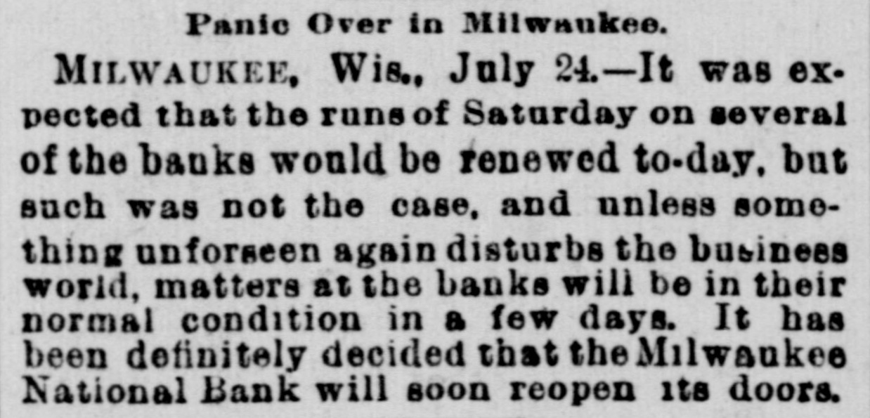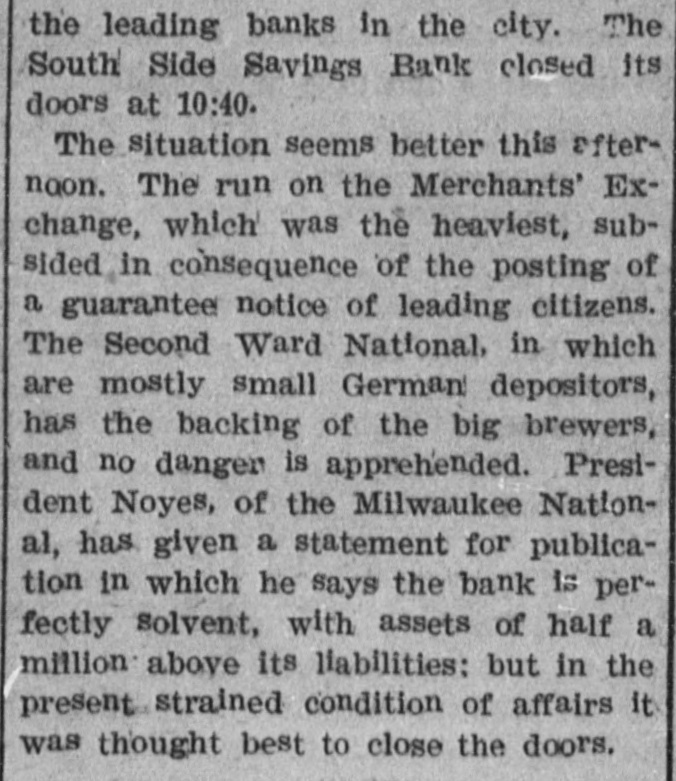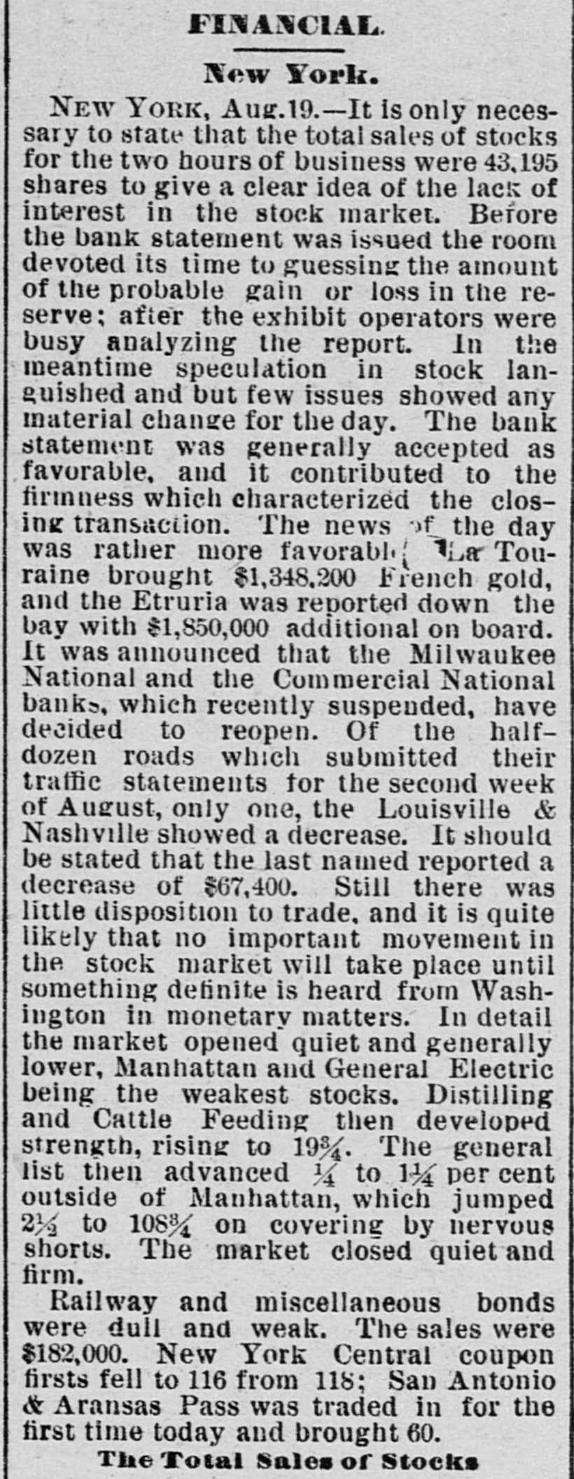 Heavy Drafts for Currency from Ohio and Other Places for Rediscounts. Gotham Financiers, However, Feel Greater Concern for the Situation in Philadelphia and New England Just Now. Deposits of $38,000,000 Drawn from Gotham National Banks Since March. The Stock Exchange Will Proceed Against G. H. G. Weil, Who Was Caught Circulating Evil Reports Without Foundation. WESTERN BANKS HEDGING. Greater Part of $1,500,000 Sent to Indian. apolts and Cincinnati Yesterday. NEW YORK, July -The banks reported the condition as fairly easy and, to some extent, better, inasmuch as the demands for accommodation were light. The most notabledemands for assistance to-day were from Ohio. The orders for currency to-day were light The subtreasury was debtor the clearing house, this morning,only $118,000, and that sum was paid in notes, What caused the treasury officials to pay in notes to-day. instead of gold, as they have done for the last week. could not be ascertained, but it was assumed that the protests of the banks, through the press, against the in. convenient method of settling the clearinghouse balances in gold had caused them to see the absurdity of the practice. The dications to-day were that a considerable amount of currency was being received from some sections of the country by the banks in this city, but that it was being offset by shipments to o her places. The leading banks received $250.000 on,Saturday while shipmen ts were nearly 60 much, but on the other hand there were some banks on Saturday that shipped a great deal of currency without any receipts to offset those shipments. From the demands received to-day from Ohio and some other places for re-discounts, it is believed that the shipments of currency to those sections this will be heavy. In many instances during the last few days gold has been shipped to the country instead of currency. and more will probably follow. The banks asking for the accomodation are providing themselves distrust sweeps over their localities. Speaking of the great number of Western banks hich closed Saturday. the president of one of the largest national banks in this city said to. day that he believed that in the majority of cases they were not failures, but only suspensions: that they were perfectly solvent, and that they would resume busi. ness again in a few days stronger than ever. The situation in New England is attract. ing a great deal of attention in this city now,and especially in regard to the manufactories. the office of Watson & Gibson, No. 555 Broadway, it was said that their advices from Boston were the effect that money was practically imlendable in that city at 6 per cent.. and that stocks were being carried at per cent. I consider,' said Mr. Gibson, the situation HB regards the New England factories the most serious factor in this market. The failure of the Milwaukee National Bank on Saturday was very generally diecussed in this city to-day. The failure was not entirely unexpected by wide-awake bankers. some of the most conservativo whom had been aware of its real condition for sometime. One of these bankers said to. day the report that the failure of the bank was due to the failure of the Soblesinger syndicate was not true. The bank's failure, it was said. was due to it having overloaned to certain parties with which the Schlessinger syndicate had nothing to do. Several banks this morning reported their inability to make collections in Philadelphia, or obtain payment of the large balances they have to their credit with some banks in that city. One bank here has between $500,000 and $600,000 in Philadelphia, which is unable to obtain without recourse to measures which would probably cause trouble to the banks referred to in that city. New York banks, as rule, are now refusing to accept draits from their customers on Philadelphia banks, except for collection at the depositors' risk. In some cases where merchants in this city have had large drafts on Philadelphia they have sent them there by special messenger for collection over the counter. The course, how. ever, involves trouble of identification, and when it has been adopted a liberal commission has had to be paid for New York exchange, currency not being obtainable, According to the reports the Controller the Philadelphia national banks were as well supplied with cash on July 12 as were the national banks of this city. Those ports show that on that day the reserve of the national banks of Philadelphia amounted to 30.39 per cent. of the deposits, It is cause of some wondermen there. fore, why the Philadelphia banks should beso slow in making the remittances to this city. The shipments of currency by the banks to the interior to-day amounted to $1,500.000. Of this snm $400,000 was obtained at the subtreasury in exchange for large bills, Most of the money went to Cincinnati and Indianapolis Some money went to Chi. cago and St. Louis. The Post says: It appears from the state ments of the New York city national banks submitted to the Controller under date of July 12, that with a shrinkage since the March report of $17,725,597 in specie and legal-tender holdings, of $38,151 in individual deposite and of 910,392 in amount dueother banksand bankers mostof which also was deposits- the aggregate loan account bas decreased only $14,798,170. This is a fair measure of the courage and liberality with which our city banks have faced the crisis. It is true that the calling in of loans, even to this extent, must necessarily have resulted in corresponding reduction of deposits; 80 that the total decrease in deposits 18 by no means proper measure of the extent of actual money withdrawals. By what is in one way or another hoard. ing of money is novertheless strongly reflected in the comparison. and it the banks which have boldly counter balanced such movement by their use of clearing honse certificate. Figures show. indeed, from what a pinch of senseless panic the New York banks saved us. They also show why the banks 