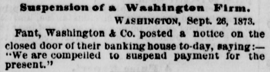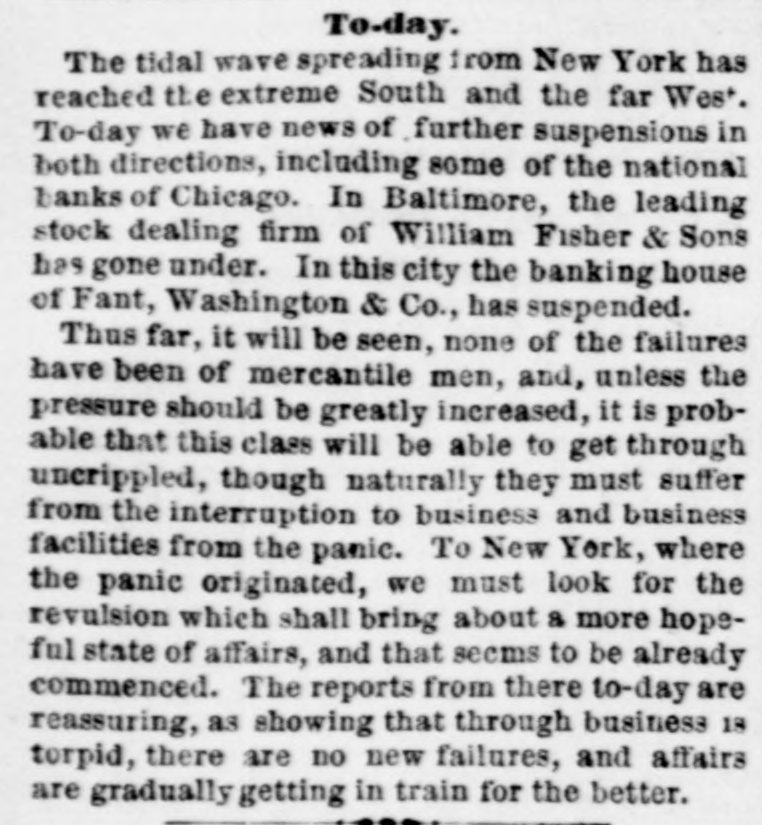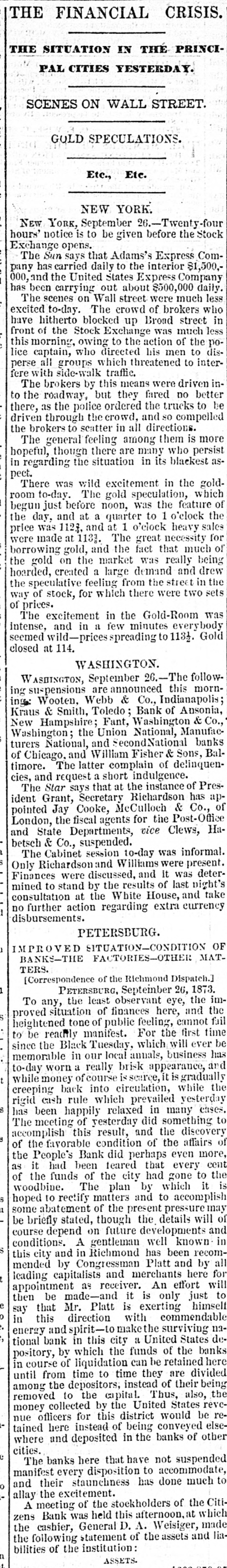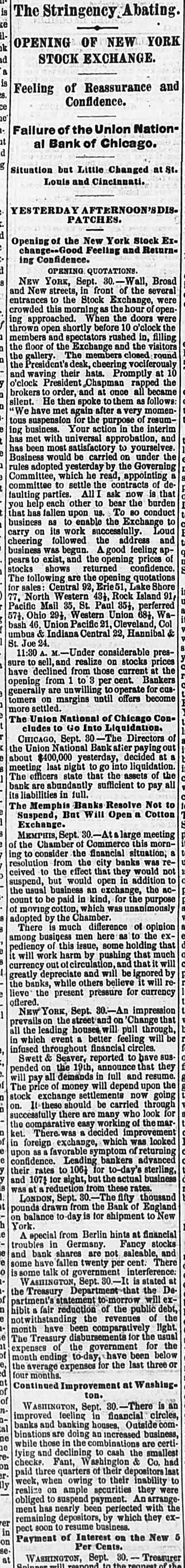 THE FINANCIAL CRISIS, NEW YORK. NEW YORK, September 26.-Twentyfour hours' notice is to be given before the stock exchange opens. The Sun says that Adams express company has carried daily to the interior $1,500,000, and the United States express company has been carrying out about $500,000 daily. NEW ORLEANS. NEW ORLEANS, September 25.-The banking houses have joined in an address giving the reasons for partial suspension of currency payment for thirty days, by which time they think the movement of cotton and sugar will place them in a position to fully resume. Sterling exchange, the usual source of currency, at this moment, is not available except at ruinous rates. Heavy drafts have been made upon them for the usual balances from the west and east, and there is no prospect of their drafts for currency being honored. The banks will pay drafts under one hundred dollars. CHARLESTON. CHARLESTON, September 26.-The Peoples bank of South Carolina, the Peoples savings bank, and the South Carolina loan and trust company have suspended currency payments. The national banks and other state banks pay as usual. NASHVILLE. NASHVILLE, September 26.-The banks have suspended currency payments upon checks of over $200. The board of trade approves the action. ATLANTA. ATLANTA, September 26.-A meeting of business men has resolved to assist the banks by free deposits and light drafts. SAVANNAH. SAVANAH, September 26.-In accordance with the resolutions of the chamber of commerce, the banks are certifying checks but withholding currency. CHICAGO. CHICAGO, September 26.-Five national banks have suspended. WASHINGTON. WASHINGTON, September 26.-The following suspensions are announced this morning : Wooten, Webb & Co., Indianapolis ; Krans & Smith, Toledo; Bank of Ansonia, New Hampshire Fant, Washington & Co., of Washington. ENGLAND. LONDON, September 26.-American securities are excited. Large business doing with wide fluctuations and much uneasiness. LATER.-American securities flat and declined heavily. The Daily Telegraph, in an article on the American crisis, savs it cannot be too strongly enforced that there is nothing radically unsound here or in the United States. The great mass of capitalists are not affected by the trouble. The Daily News remarks that in the absence of a system of long credits, the materials for a panic among American trading houses do not exist. It believes that the worst in over. It is said that bullion to the amount of £500,000 sterling will be withdrawn from the bank to be sent to America by next Saturday's steamer.