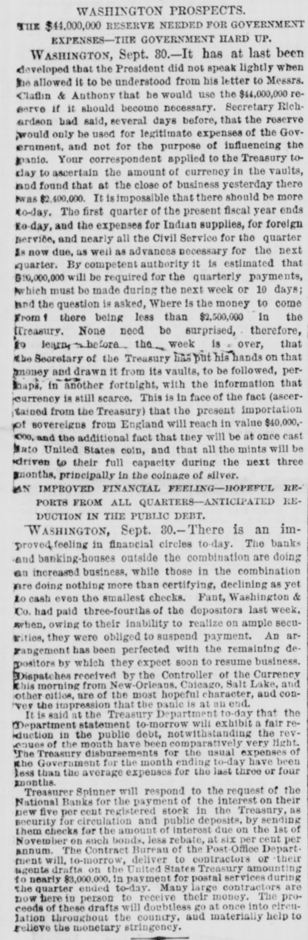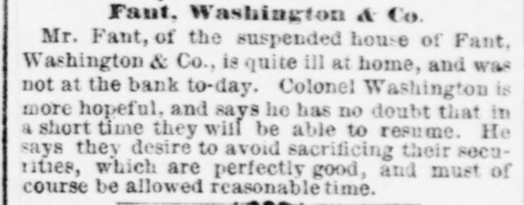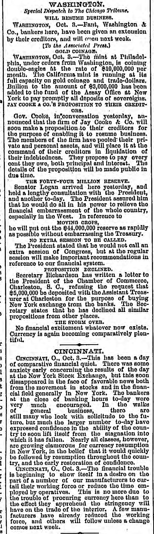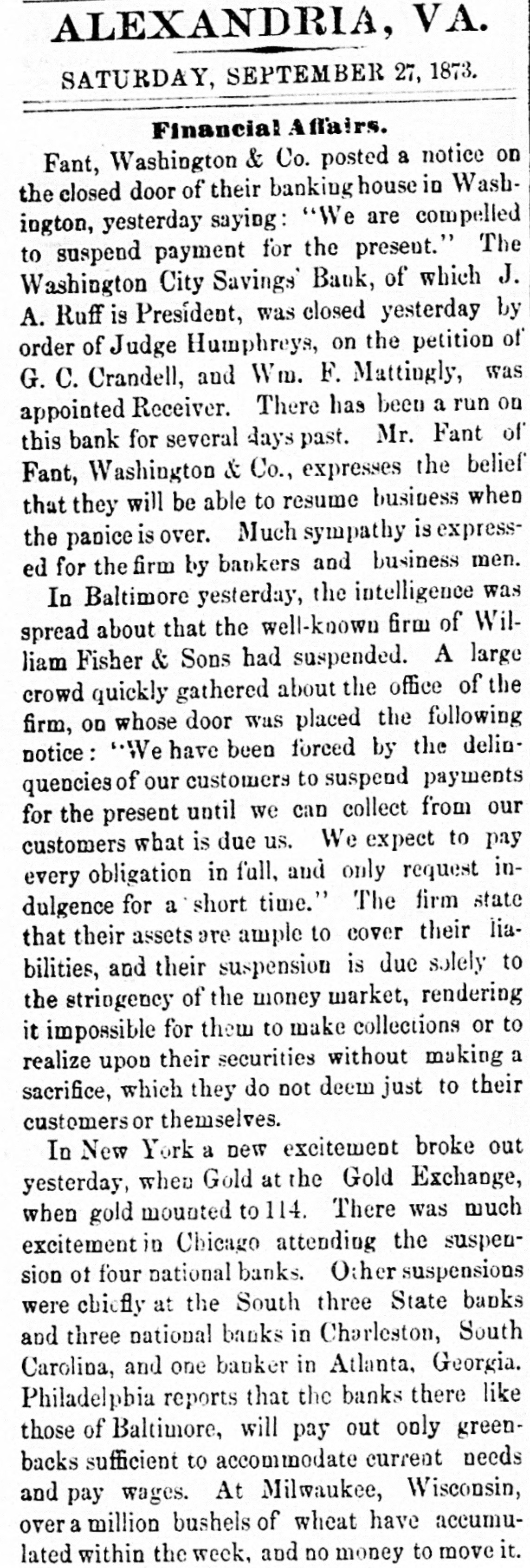 THE FINANCIAL CRISIS, NEW YORK. NEW YORK, September 26.-Twentyfour hours' notice is to be given before the stock exchange opens. The Sun says that Adams express company has carried daily to the interior $1,500,000, and the United States express company has been carrying out about $500,000 daily. NEW ORLEANS. NEW ORLEANS, September 25.-The banking houses have joined in an address giving the reasons for partial suspension of currency payment for thirty days, by which time they think the movement of cotton and sugar will place them in a position to fully resume. Sterling exchange, the usual source of currency, at this moment, is not available except at ruinous rates. Heavy drafts have been made upon them for the usual balances from the west and east, and there is no prospect of their drafts for currency being honored. The banks will pay drafts under one hundred dollars. CHARLESTON. CHARLESTON, September 26.-The Peoples bank of South Carolina, the Peoples savings bank, and the South Carolina loan and trust company have suspended currency payments. The national banks and other state banks pay as usual. NASHVILLE. NASHVILLE, September 26.-The banks have suspended currency payments upon checks of over $200. The board of trade approves the action. ATLANTA. ATLANTA, September 26.-A meeting of business men has resolved to assist the banks by free deposits and light drafts. SAVANNAH. SAVANAH, September 26.-In accordance with the resolutions of the chamber of commerce, the banks are certifying checks but withholding currency. CHICAGO. CHICAGO, September 26.-Five national banks have suspended. WASHINGTON. WASHINGTON, September 26.-The following suspensions are announced this morning : Wooten, Webb & Co., Indianapolis ; Krans & Smith, Toledo; Bank of Ansonia, New Hampshire Fant, Washington & Co., of Washington. ENGLAND. LONDON, September 26.-American securities are excited. Large business doing with wide fluctuations and much uneasiness. LATER.-American securities flat and declined heavily. The Daily Telegraph, in an article on the American crisis, savs it cannot be too strongly enforced that there is nothing radically unsound here or in the United States. The great mass of capitalists are not affected by the trouble. The Daily News remarks that in the absence of a system of long credits, the materials for a panic among American trading houses do not exist. It believes that the worst in over. It is said that bullion to the amount of £500,000 sterling will be withdrawn from the bank to be sent to America by next Saturday's steamer.