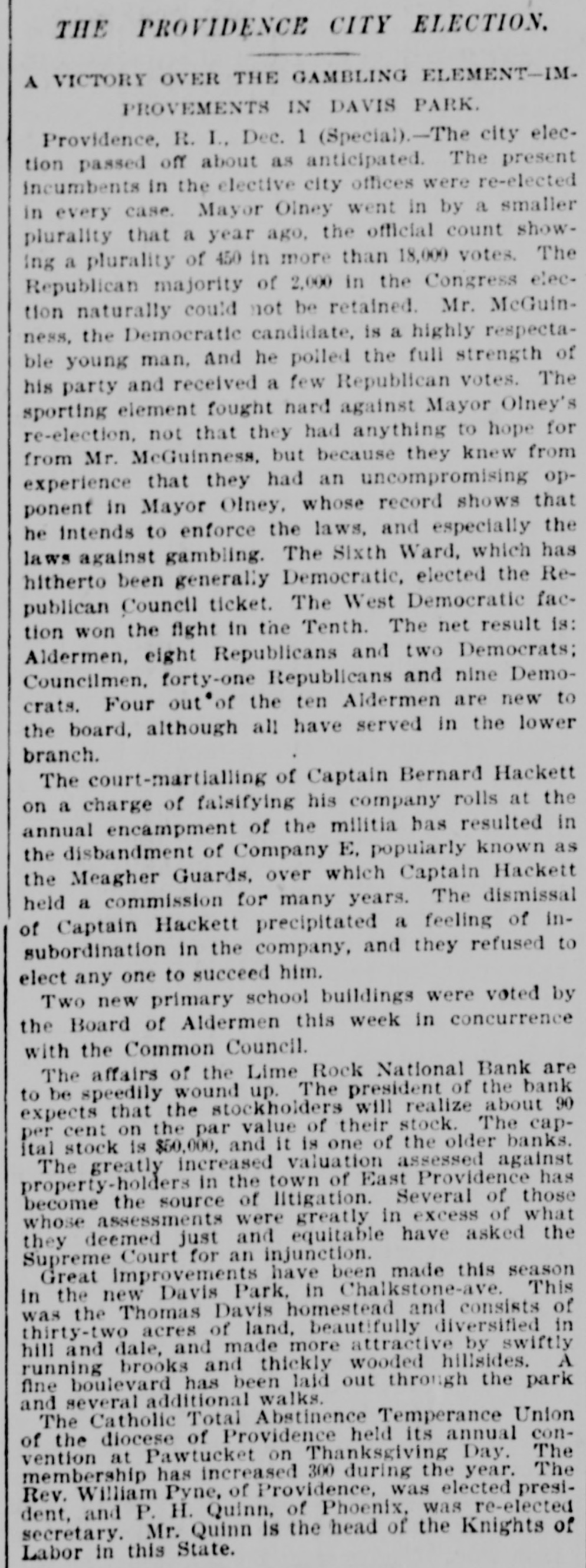 # THE PROVIDENCE CITY ELECTION, # A VICTORY OVER THE GAMBLING ELEMENT-IM- # PROVEMENTS IN DAVIS PARK. Providence, R. I., Dec. 1 (Special). -The city election passed off about as anticipated. The present incumbents in the elective city offices were re-elected in every case. Mayor Olney went in by a smaller plurality that a year ago, the official count showing a plurality of 450 in more than 18,000 votes. The Republican majority of 2,000 in the Congress election naturally could not be retained. Mr. McGuinness, the Democratic candidate, is a highly respectable young man, And he polled the full strength of his party and received a few Republican votes. The sporting element fought hard against Mayor Olney's re-election, not that they had anything to hope for from Mr. McGuinness, but because they knew from experience that they had an uncompromising opponent in Mayor Olney, whose record shows that he intends to enforce the laws, and especially the laws against gambling. The Sixth Ward, which has hitherto been generally Democratic, elected the Republican Council ticket. The West Democratic faction won the fight in the Tenth. The net result is: Aldermen, eight Republicans and two Democrats; Councilmen, forty-one Republicans and nine Democrats. Four out of the ten Aldermen are new to the board, although all have served in the lower branch. The court-martialling of Captain Bernard Hackett on a charge of falsifying his company rolls at the annual encampment of the militia has resulted in the disbandment of Company E, popularly known as the Meagher Guards, over which Captain Hackett held a commission for many years. The dismissal of Captain Hackett precipitated a feeling of in-subordination in the company, and they refused to elect any one to succeed him. Two new primary school buildings were voted by the Board of Aldermen this week in concurrence with the Common Council. The affairs of the Lime Rock National Bank are to be speedily wound up. The president of the bank expects that the stockholders will realize about 90 per cent on the par value of their stock. The capital stock is $50,000, and it is one of the older banks. The greatly increased valuation assessed against property-holders in the town of East Providence has become the source of litigation. Several of those whose assessments were greatly in excess of what they deemed just and equitable have asked the Supreme Court for an injunction. Great Improvements have been made this season in the new Davis Park, in Chalkstone-ave. This was the Thomas Davis homestead and consists of thirty-two acres of land, beautifully diversified in hill and dale, and made more attractive by swiftly running brooks and thickly wooded hillsides. A fine boulevard has been laid out through the park and several additional walks. The Catholic Total Abstinence Temperance Union of the diocese of Providence held its annual convention at Pawtucket on Thanksgiving Day. The membership has increased 300 during the year. The Rev. William Pyne, of Providence, was elected president, and P. H. Quinn, of Phoenix, was re-elected secretary. Mr. Quinn is the head of the Knights of Labor in this State.