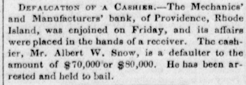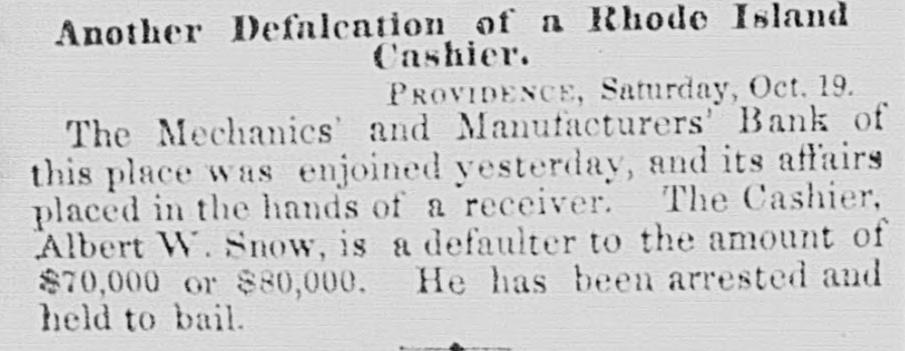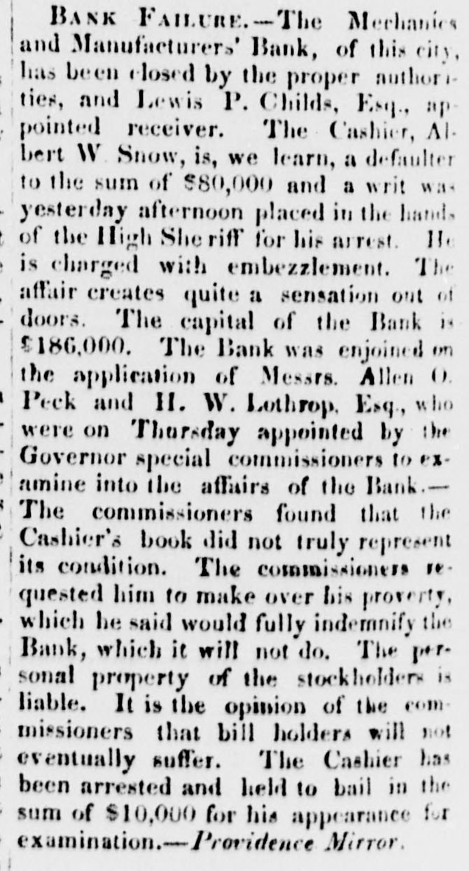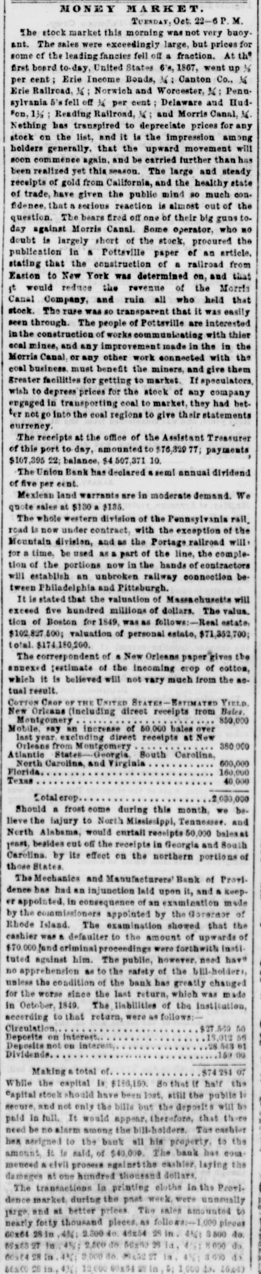 MONEY R K ET. TUESDAY, Oct. 22-6 P.M. The stock market this morning was not very buoy. ant. The sales were exceedingly large, but prices the for some of the leading fancies fell off a fraction. At 1/8 first board to-day, United States 6'8, 1867, went up per cent; Erie Income Bonds, 14: Canton Co., 14 1/4 ; Norwich and 5's fell off 1/4 per cent; Erie sylvania Railroad, Worcester, Delaware and 14: Canal, Penn- Hud- 1/4. Reading Railroad, 14; and Morris Nething has transpired to depreciate prices for any stock on the list, and it is the impression among holders generally. that the upward movement will again, and be carried further than has been this season. The large soon realized commence yet the healthy and steady state of gold from California, and have the public so receipts of trade, given mind almost out much of con- the fidence, that a serious reaction is question. The bears fired off one of their big guns to. day against Morris Canal. Some operator, who NO doubt is largely short of the stock, procured the publication in a Pottsville paper of an article, stating that the construction of a railroad from Easton to New York was determined on, and that it would reduce the revenue of the Morris Canal Company, and ruin all who held that stock. The ruse was so transparent that it was easily seen through. The people of Pottsville are interested in the construction of works communicating with their coal minee, and any improvement made in the in the Morris Canal, or any other work connected with the coal business must benefit the miners, and give them greater facilities for getting to market. If speculators, wish to depress prices for the stock of any company engaged in transporting coal to market, they had better not go into the coal regions to give their statements currency. The receipts at the office of the Assistant Treasurer of this port to day, amounted to $76,329.77 payments $107,395 2 balance, $4,507,371 10. The Union Bank has declared asemi annual dividend of five per cent. Mexican land warrants are in moderate demand. We quote sales at $130 a $135. The whole western division of the Pennsylvania rail. road is now under contract, with the exception of the Mountain division, and as the Portage railroad will, for a time. be used as a part of the line, the completion of the portions now in the hands of contractors will establish an unbroken railway connection be. tween Philadelphia and Pittaburgh. It is stated that the valuation of Massachusetts will exceed five hundred millions of dollars. The value. tion of Boston for 1849, was as follows:-Real estate, $102,827,500; valuation of personal estate, $71,352,700; total. $174,180,200. The correspondent of a New Orleans paper gives the annexed (estimate of the incoming crop of cotton, which it is believed will not vary much from the actual result. COTTON CROP OF THE UNITED STATES-ESTIMATED YIELD New Orleans (including direct receipts from Bales. Montgomery 850,000 Mobile. say an increase of 50.000 bales over last year. excluding direct receipts at New 380.000 Orleans from Montgomery Atlantic States Georgia, South Carolina. 600,000 North Carolina, and Virginia 160,000 Florida Texas 40,000 Total Crop 2,030,000 Should a frost come during this month. we be. lieve the injury to North Mississippi, Tennessee. and North Alabama, would curtail receipts 50,000 bales at jeast, besides cut off the receipts in Georgia and South Carolina. by its effect on the northern portions of those States. The Mechanics and Manufacturere' Bank of Provi. dence has had an injunction laid upon it, and a keeper appointed in consequence of an examination made by the commissioners appointed by the Governor of Rhode Island. The examination showed that the cashier was a defaulter to the amount of upwards of $70.000 and criminal proceedings were forthwith insti. tuted against him. The public, however, need have no apprehension as to the safety of the bill-holders, unless the condition of the bank has greatly changed for the worse since the last return, which was made in October 1849. The liabilities of the institution, according to that return, were as follows: Circulation $27,509.50 18,012.55 Deposits on interest. 28.543.01 Deposits not on interest Dividenda. 159.00 $74 294 07 Making total of While the capital is $186,150. So that If half the Capital stock should have been lost, still the public is secure. and not only the bills but the deposits will be paid in full. It would appear. therefore. that there need be no alarm among the bill-holders. The cashier has assigned to the bank all his property, to the amount it is said, of $40,000. The bank has cost meneed acivil proges against the cashier. laying the damages at one hundred thousand dollars. The transactions in printing cloths in the Provi. dence market during the past week were unusually Jarge, and at better prices The FALES amounted to nearly forty thousand pieces. as follows:- 1,000 pieces 60x64 28in 4% 2.300 45254 29 in 4N4 3 500 do. 59*68 2 in 4% 2,500 do 50850 25 ld. 8000 do 00x(45 in 4 3,000.00 la. 4% 3.000 do BESCO 40. 46440