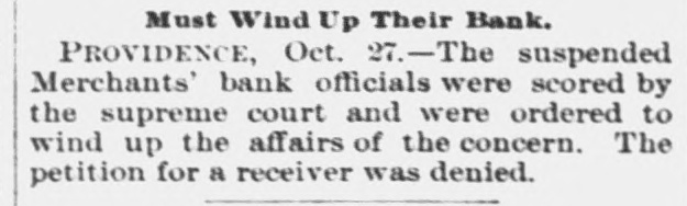 Must Wind Up Their Bank. PROVIDENCE, Oct. 27.-The suspended Merchants' bank officials were scored by the supreme court and were ordered to wind up the affairs of the concern. The petition for a receiver was denied.