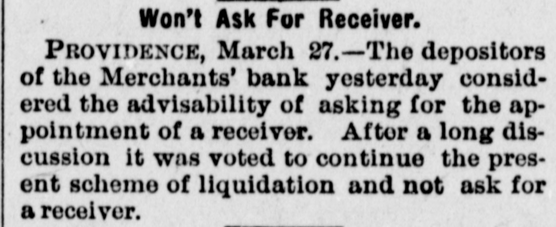 Won't Ask For Receiver. PROVIDENCE, March 27.-The depositors of the Merchants' bank yesterday considered the advisability of asking for the appointment of a receiver. After a long discussion it was voted to continue the present scheme of liquidation and not ask for a receiver.