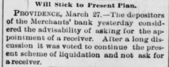 Will Stick to Present Plan. PROVIDENCE, March 27.-The depositors of the Merchants' bank yesterday considered the advisability of asking for the appointment of a receiver. After a long discussion it was voted to continue the present scheme of liquidation and not ask for a receiver.