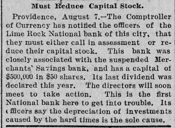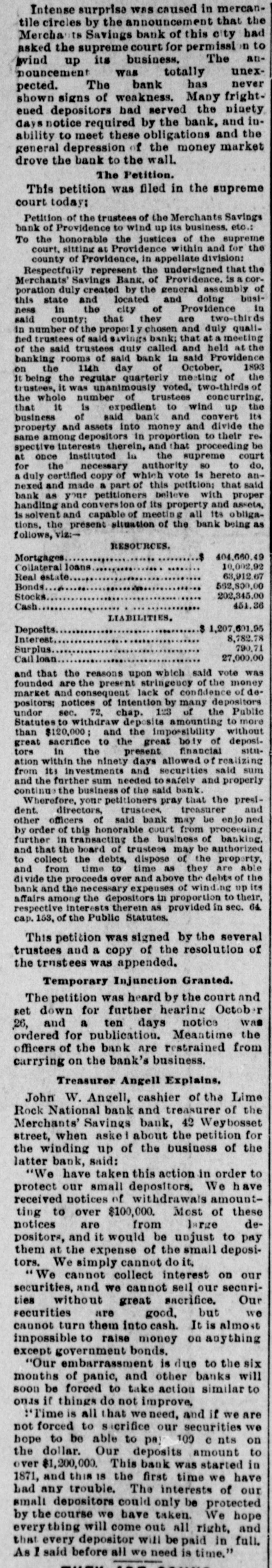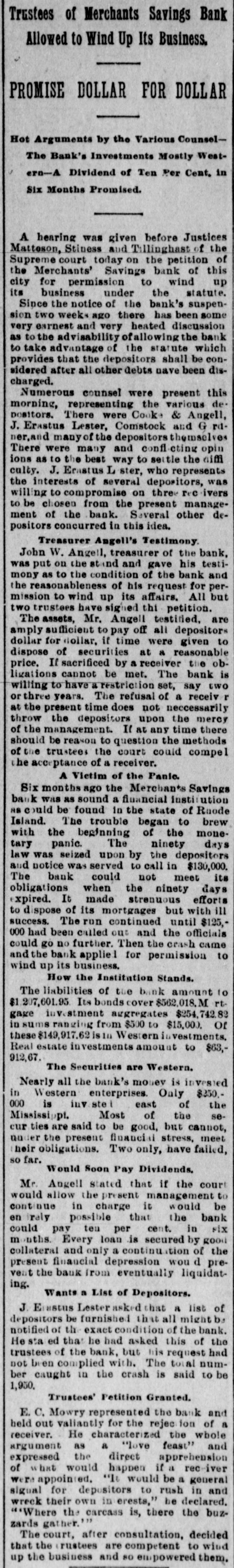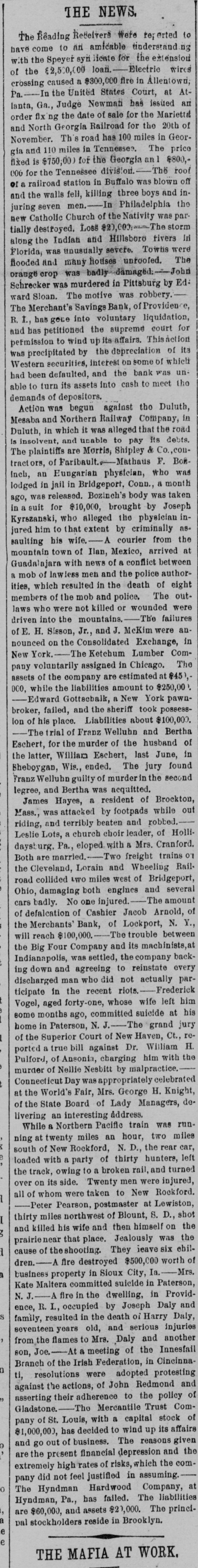 THE NEWS. to reported The Reading Receiver an amicable were tinderstand.ng the with Joan. have come Speyer to syn icate for Electric the extension wires of the £2,500,000 a $300,000 fire in Allentown, at Atcrossing caused the United States Court, issued an lanta, Pa. Ga., In Judge date Newmati of sale for has the Marietta of order fix ng Georgia the Railroad for the in 20th Georand North road has 100 miles and 110 fof the Georgia an roof November. gia $750,00 miles Th's in Tennesses. The The 8800,- price fixed for is the Tennessee division. Buffalo was blown off 000 of a raiiroad station killing in three boys and the inand the walls fell, Philadelphia Catholic $2),000 juring seven Church men.- of the Nativity The was storm partially new destroyed. Loss and Hillsboro tivers were In along the was Indian unusually severe. unroofed. Towns The Florida, flooded and many badly Houses damaged:- John Ed: motive orange Schrecker crop was was murdered in was Pittsburg robbery. by The ward Merchant's Sloan. The Savings voluntary Bank, of liquidation, Providence for R.I., has goue into the supreme court and has its permission petitioned to wind by the depreciation affairs. his action of which of precipitated OD some securities, bank was interest was unWestern been defaulted, and the cash to meet the had to turn its assets into of the demands able Action was depositors. begun Railway against Company, Duluth, in and Northern that the road in unable to pay .conMesaba Duluth, insolvent, which and it was alleged Shipley & its debts. is plaintiffs are Mortis, Mathaus F. BoBtractors, The of Fungarian Faribault. physician, Conn., who a month was Inch, an in Bridgeport, taken ago, lodged was in released. jail $10,000, Bozinch's brought body physician by was Joseph inin a suit for who Alleged the criminally nsKyrszanski, jured him to that extent A by courier from the at saulting his town wife. of Ilan, Mexico, conflict arrived between mountain with news of police authorGuadalajara men and the eight mob of lawless in the death of outa which resulted The were ities, of the mob and police. wounded members were not killed or -The failures driven into the and cKim were laws who mountains. Jr., an- in H. Sisson, Exchange, nounced of E. on the Consolidated Lumber ComThe New York. The Ketebum in Chicago. pany are assets voluntarily assigned estimated at 45 Gottscbalk, took Edward sheriff 000, while of the the company liabilities amount a New York to $250,00 possess- pawnbroker, Liabilities of his failed, place. and the Welluhn about and $100,000. Bertha lon of Franz of The trial the murder of the husband June, in Eschert, latter, for William Eschert, The last jury found Sheboygan, the Wis., ended. murderi in the second Franz Welluhn guilty of acquitted. and Bertha was of Brockton, James by legree, Hayes, a resident footpads while out Mass., was attacked beaten and robbed. riding, and terribly a church choir leader, Mrs. Cranford. of Hollidaysburg Leslie Lots, Pa., eloped Two with a freight trains Rail- 01 Both are married. Lorain and Wheeling of Bridgeport, road the Cleveland, collided LWO miles engines west and several damaging both The amount of No one Jacob Arnold, cars Ohio, defalcation badly. of Cashier injured. Lockport, N. Y., of Bank, of trouble between the will Merchants' reach $100,000. Company The and its machinists,at backBig Four the company the Indianapolis, settled, every down and did not was agreeing to reinstate actually parrecent discharged ing man who riots. Frederick him Vogel, ticipate aged in forty-one, the whose suicide wife left at his months ago, committed The grand jury in Paterson, New Haven, H. some home of the Superior Court N. of Dr. William Ct., retrue bill against him with the of Ansonia, malpractice. Pulford, ported murder a of Nellie Nesbitt appropriately charging by celebrated Connecticut Day was George H. Knight, deat the World's Fair, of Mrs. Lady Managers, State Board Address. runWAS of the interesting train an livering While a an Northern Pacific hour, two miles ning at twenty New Rockford, miles N. D., hunters, the rear car, left loaded south of with a party of broken thirty rail, and turned on its side. to New the track, owing to Twenty a men were Rockford. injured, over all of whom were taken at Lewiston, Peter Pearson, postmaster of Blount, S. D., shot the miles then himself on thirty killed his northwest wife and Jealously was the prairie and near that place. They leave six ebilcause of shooting. destroyed $500,000 worth Are City, Ia.-Mrs. business dren.- property in Sioux suicide in Paterson, Maltera committed dwelling, in Provid- and Kate fire in the Joseph Daly family, ence, N. R. resulted I., occupied in the by death and serious oi Harry another injuries Daly, years old, and seventeen from,the Joe. flames At a to meeting Mrs. Federation, Daly of the in Cincinna- Innesfail were son, Branch of the Irish adopted protesting and ti, resolutions the actions, of John to Redmond the policy of against their adherence Trust ComThe stock of has asserting Gladstone. Louis, with Mercantile a capital its affairs The reasons pany of St. decided to wind up given the $1,000,00 and go out of business. financial depression the and comare the present rates of risks, which high in at extremely pany did not feel justified Hardwood assuming. Company, liabilities The Hyndman has failed. The princiHyndman, Pa., assets $21,000. The pal are stockholders $60,000, and reside in Brooklyn. THE MAFIA AT WORK.