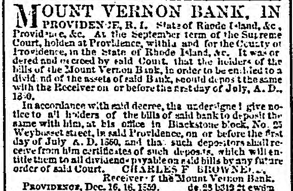 MOUNT VERNON BANK, IN State of Raode (-land, &c. Provid PM c, &c. At the September term of the Supreme Court, holden at Providence, within and for the County of Providence, in the State of Rhode Island, Nr. It was or dered and en creed by sald Count that the holders of the bills of the Mount Vernon B ink, In order to be enclied to a divid nd of the assets of said B mk, scould depos the same with the Receiver on or before the netday of July, A. D., 18.0. In accordance with mid decree, the undersigned give notice to all holders of the bills of said bankio deposit the sime with him. at bls office in Blackstone block, No. 25 Weybusset street, in sald Providence, on or before the First day of July A. D. 1560, and the such depositors shall recerve from him certificates of such deposits. which will tn. title them to all dividend- payable 03 said bills by any future order of sald Court. CHARLES F BROW NEW.. Receiver r the Mount Vernon Bank. PROVIDENCE, Dec. 16, 16. 1850. de.25 6313 at ewom