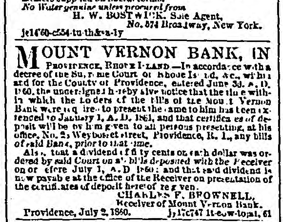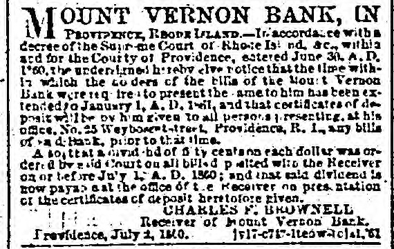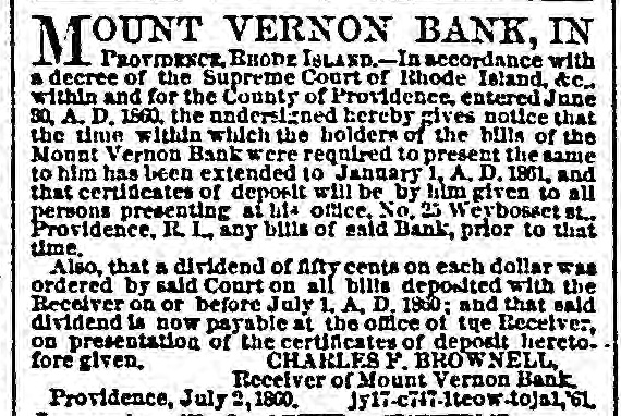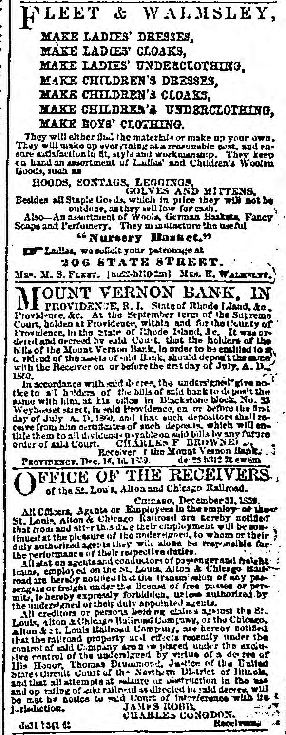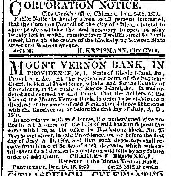 ORPORATION NOTICE. C Citv Clerk's on C, Chicago, INC. eith, ISD. Public Notle: in hereby given to all persons Interested, that the Common Courcil of the city of Chicago intend to appropriate and take the and necessary to open an alley twenty feet In width, running from Twelfth street to North street, three the centre of the blockslying between State street and H stush avenue. deft :0: If. KREISMA NN. "ltv C'erk. OUNT VERNON BANK, IN M PROVIDENCE. H. I. State of of Rhode Island, &c. Provid me, Ac. At the September term of the Sup remo Court. holder at Providence, within and for the County or Providence, in the State of Rhode I-land, Are. It was ordered and Ce crewd hv sald Court that the holders of the bills of the Mount Vernon Bank, in order to be entitled to a divide nd of the 1 of vald Banz. should depos the same with the Receiver on or before the Entday of July, A. D., IS V. In accordance with 33 d decree, the undersigned"give nofice to al h ders of the bills of said bank to d. posit the same with Lini, at his office in Blackstone bluck. No. 35 Weybosset street, is -ald Providence. on or before the finst day or July A D. ISM. and the such depositors shall recoive from h m e rtitic item of such depended which will , ntitle them to al dividen 1- payableon sild bills by any future order of sul-1 Court. CHARLES F BROWNED. NEW. Receiver I the Mount Vernon Rank. de. b312 at ewdin PROVIDENCE. Dec. 16, 16, ISO CUPP OWI FRD ATED