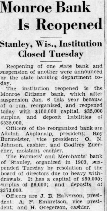 Monroe Bank Is Reopened Stanley, Wis., Institution Closed Tuesday Reopening of one state bank and suspension of another were announced by the state banking department toThe institution reopened is the Monroe Citizens bank, which after suspension Jan. this year because of run, reorganized, and reopened today with $100,000 capital, $35,000 surplus, and deposit liabilities of $535,000. Officers of the reorganized bank are Adolph Abplanalp, president; Roy Burmeister, vice president: O. Johnson, cashier, and Godfrey Zuercher, assistant cashier. The Farmers' and Merchants' bank of Stanley, organized in 1903. suspended Tuesday by resolution of the board of directors due to heavy withdrawals. It has capital of $50,000; surplus of $6,000; and deposits of Officers are J. B. Halverson, president: A. F. Embretson, vice president; and H. Gregerson, cashier.