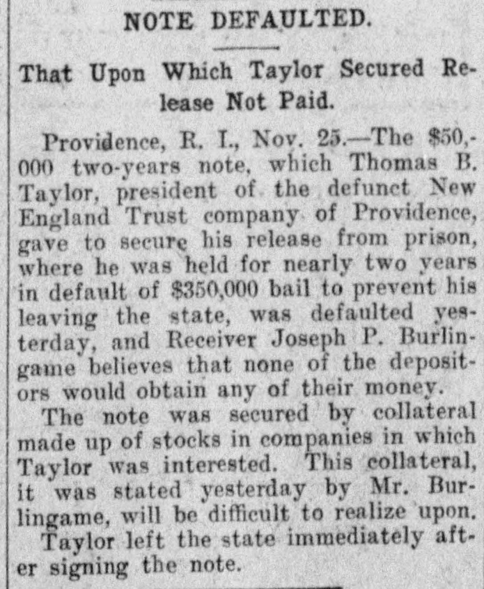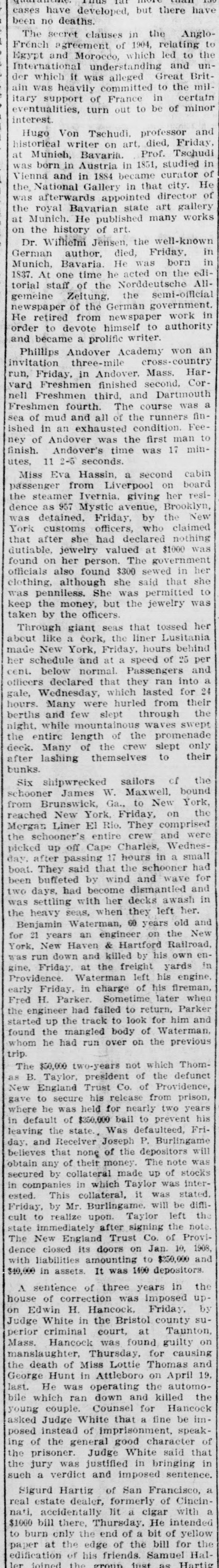 been no deaths. The secret clauses in the AngloFrénch agreement of 1904, relating to Egypt and Morocco, which led to the International understanding and under which it was alleged Great Britain was heavily committed to the military support of France in certain eventualities, turn out to be of minor interest Hugo Von Tschudi, professor and historical writer on art, died, Friday, at Munich, Bavarih. Prof. Tschudi was born in Austria in 1851, studied in Vienna and in 1884 became curator of the National Gallery in that city. He was afterwards appointed director of the royal Bavarian state art gallery at Munich. He published many works on the history of art. Dr. Wilhelm Jensen, the well-known German author, died, Friday. in Munich, Bavaria. He was born in 1837. At one time he acted on the editorial staff of the Norddeutsche Allgemeine Zeitung, the semi-official newspaper of the German government. He retired from newspaper work in order to devote himself to authority and became a prolific writer. Phillips Andover Academy won an invitation three-mile cross country run, Friday, in Andover. Mass. Harvard Freshmen finished second, Cornell Freshmen third, and Dartmouth Freshmen fourth. The course was a sea of mud and all of the runners finished in an exhausted condition. Feeney of Andover was the first man to finish. Andover's time was 17 minutes, 11 2-5 seconds. Miss Eva Hassin, a second cabin passenger from Liverpool on board the steamer Ivernia. giving her residence as 957 Mystic avenue, Brooklyn, was detained. Friday, by the New York customs officers, who claimed that after she had declared nothing dutiable. jewelry valued at $1000 was found on her person. The government officials also found $300 sewed in her clothing, although she said that she was penniless. She was permitted to keep the money, but the jewelry was taken by the officers. Through giant seas that tossed her about like a cork, the liner Lusitania made New York, Friday, hours behind her schedule and at a speed of 25 per cent. below normal. Passengers and officers declared that they ran into a gale, Wednesday, which lasted for 24 hours. Many were hurled from their berths and few slept through the night. while mountainous waves swept the entire length of the promenade deck. Many of the crew slept only after lashing themselves to their bunks. Six shipwrecked sailors of the schooner James W. Maxwell, bound from Brunswick, Ga., to New York, reached New York, Friday, on the Morgan Liner El Rio. They comprised the schooner's entire crew and were picked up off Cape Charles, Wednesday, after passing 17 hours in a small boat. They said that the schooner had been buffeted by wind and wave for two days, had become dismantied and was settling with her decks awash in the heavy seas, when they left her. Benjamin Waterman, 60 years old and for 21 years an engineer on the New York, New Haven & Hartford Railroad, was run down and killed by his own engine, Friday, at the freight yards in Providence. Waterman left his engine. early Friday, in charge of his fireman, Fred H. Parker. Sometime later when the engineer had failed to return, Parker started up the track to look for him and found the mangled body of Waterman. whom he had run over on the previous trip. The $50,000 two-years not which Thomas B. Taylor, president of the defunct New England Trust Co. of Providence, gave to secure his release from prison, where he was held for nearly two years in default of $350,000 bail to prevent his leaving the state., Was defaulteed, Friday, and Receiver Joseph P. Burlingame believes that none of the depositors will obtain any of their money. The note was secured by collateral made up of stocks in companies in which Taylor was interested. This collateral, it was stated. Friday, by Mr. Burlingame, will be difficult to realize upon. Taylor left the state immediately after signing the note The New England Trust Co. of Providence closed its doors on Jan. 10, 1908, with liabilities amounting to $350,000 and $40,000 in assets. It was 1400 depositors. A sentence of three years in the house of correction was imposed upon Edwin H. Hancock, Friday, by Judge White in the Bristol county superior criminal court, at Taunton, Mass. Hancock was found guilty on manslaughter, Thursday, for causing the death of Miss Lottie Thomas and George Hunt in Attleboro on April 19. last. He was operating the automobile which ran down and killed the young couple. Counsel for Hancock asked Judge White that a fine be imposed instead of imprisonment, speaking of the general good character of the prisoner. Judge White said that the jury was justified in bringing in such a verdict and imposed sentence. Sigurd Hartig of San Francisco, a real estate dealer, formerly of Cincinnati, accidentally lit a cigar with a $1000 bill there, Thursday. He intended to burn only the end of a bit of yellow