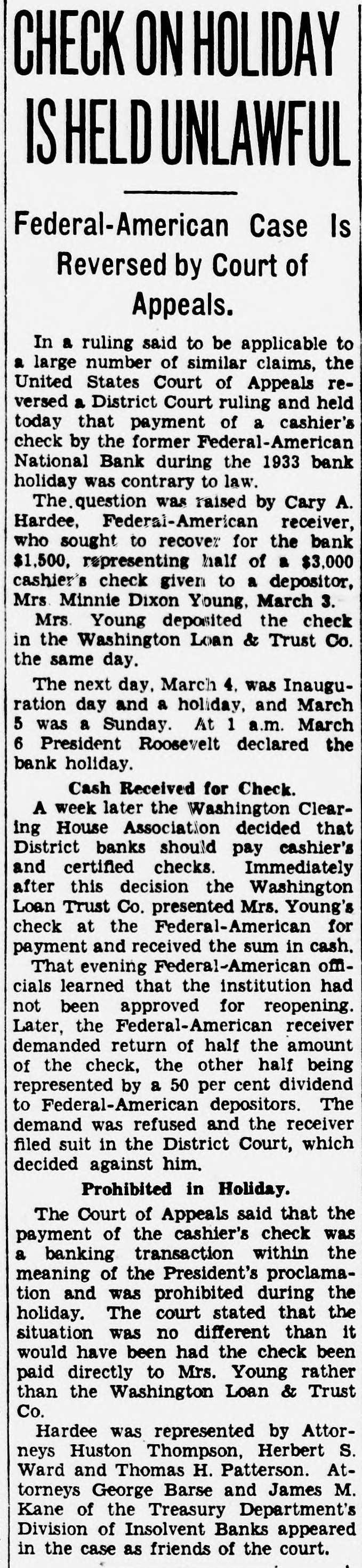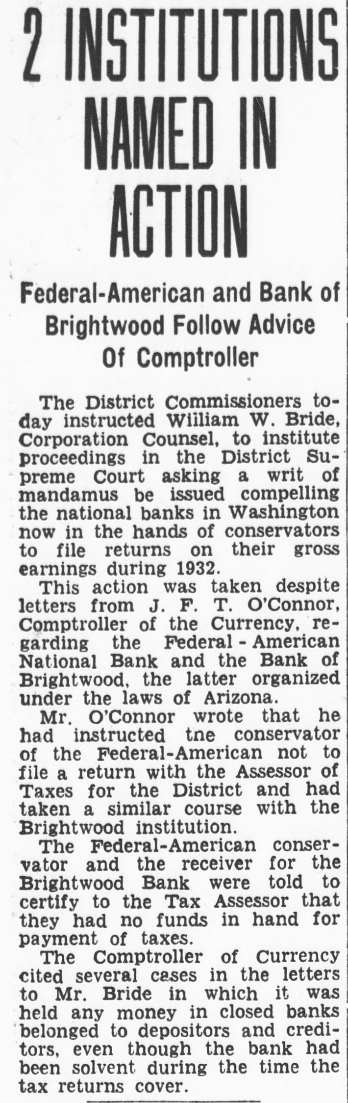 FEDERAL AMERICAN REPORT Receiver Cary A. Hardee reported for the Federal American National Bank $9,000,000 of the original $17,400,000 of the bank assets remain to be collected. Out of the $9,000,000 (face value), $2,000,000 RFC loans must be repaid before the depositors and other creditors may begin to realize on the $4,500,000 still owing them.