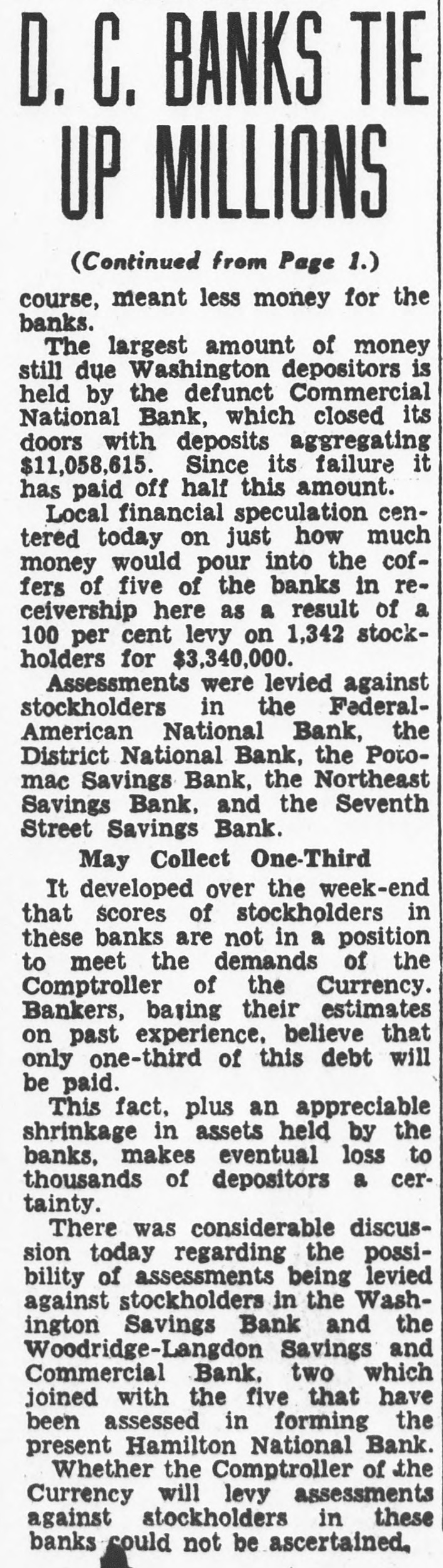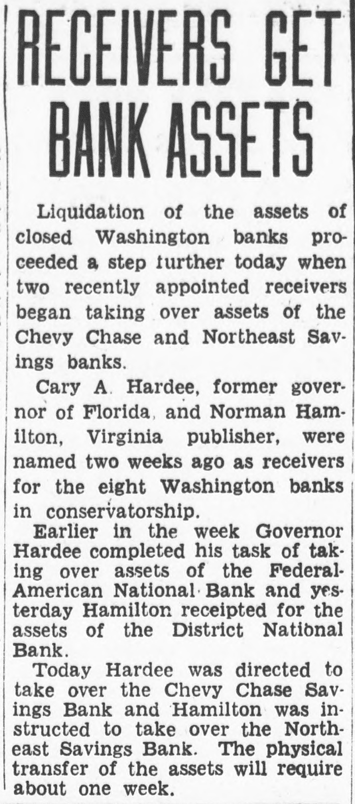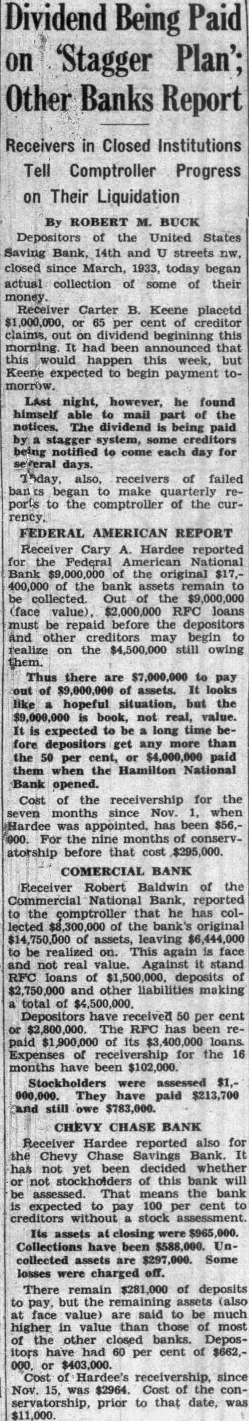 Receiver Hardee reported also for the Chevy Chase Savings Bank. It has not yet been decided whether or not stockholders of this bank will be assessed. That means the bank is expected to pay 100 per cent to creditors without a stock assessment. Its assets at closing were Collections have been $588,000. Uncollected assets are $297,000. Some losses were charged off. There remain $281,000 of deposits to pay, but the remaining assets (also at face value) are said to be much higher in value than those of most of the other closed banks. Depositors have had 60 per cent of $662,000, or $403,000. Cost of Hardee's receivership, since Nov. 15, was $2964. Cost of the conservatorship, prior to that date, was $11,000.
