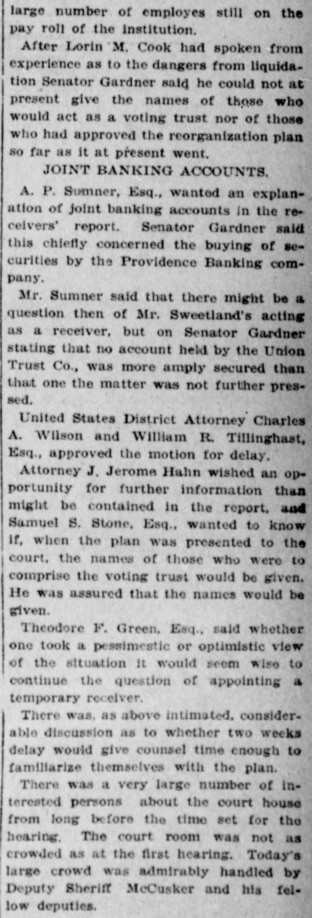 large number of employes still on the pay roll of the institution. After Lorin M. Cook had spoken from experience as to the dangers from liquidation Senator Gardner said he could not at present give the names of those who would act as a voting trust nor of those who had approved the reorganization plan so far as it at present went. JOINT BANKING ACCOUNTS. A. P. Sumner, Esq., wanted an explanation of joint banking accounts in the receivers' report. Senator Gardner said this chiefly concerned the buying of securities by the Providence Banking company. Mr. Sumner said that there might be a question then of Mr. Sweetland's acting as a receiver, but on Senator Gardner stating that no account held by the Union Trust Co., was more amply secured than that one the matter was not further pressed. United States District Attorney Charles A. Wilson and William R. Tillinghast, Esq., approved the motion for delay. Attorney J. Jerome Hahn wished an opportunity for further information than might be contained in the report, and Samuel S. Stone, Esq., wanted to know if, when the plan was presented to the court, the names of those who were to comprise the voting trust would be given. He was assured that the names would be given. Theodore F. Green, Esq., said whether one took a pessimestic or optimistic view of the situation it would seem wise to continue the question of appointing a temporary receiver. There was, as above intimated, considerable discussion as to whether two weeks delay would give counsel time enough to familiarize themselves with the plan. There was a very large number of interested persons about the court house from long before the time set for the hearing. The court room was not as crowded as at the first hearing. Today's large crowd was admirably handled by Deputy Sheriff McCusker and his fellow deputies.